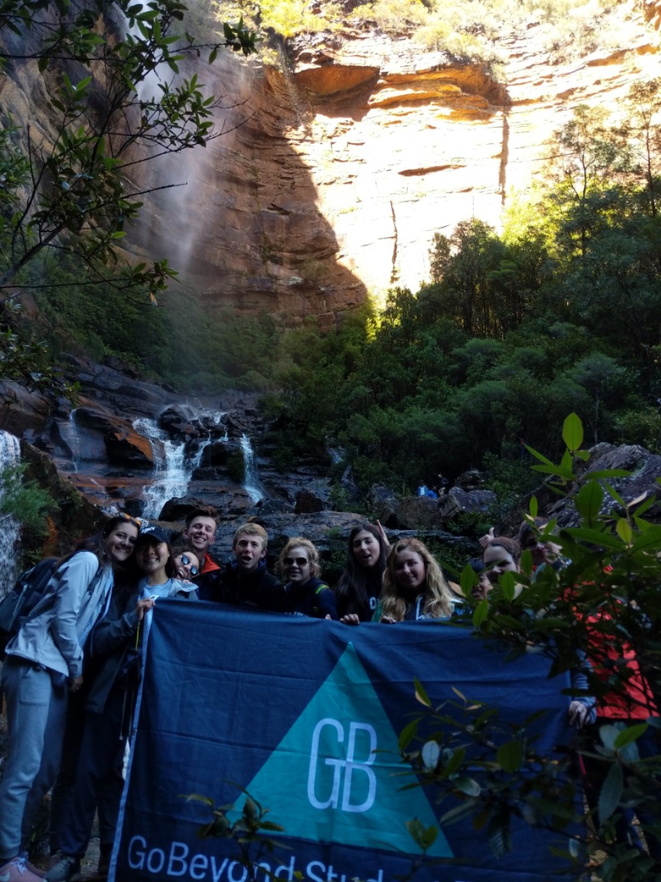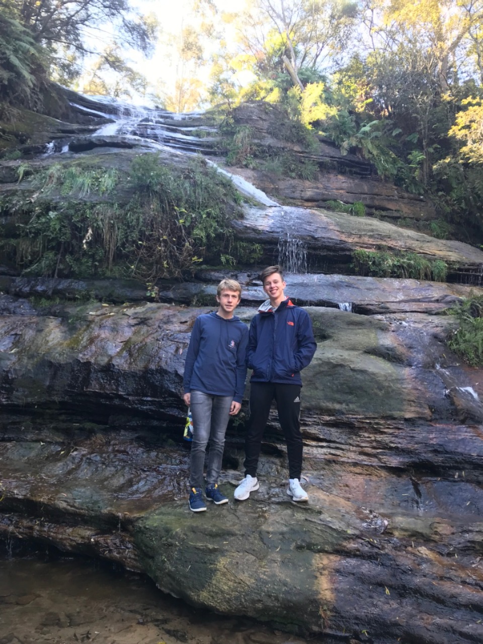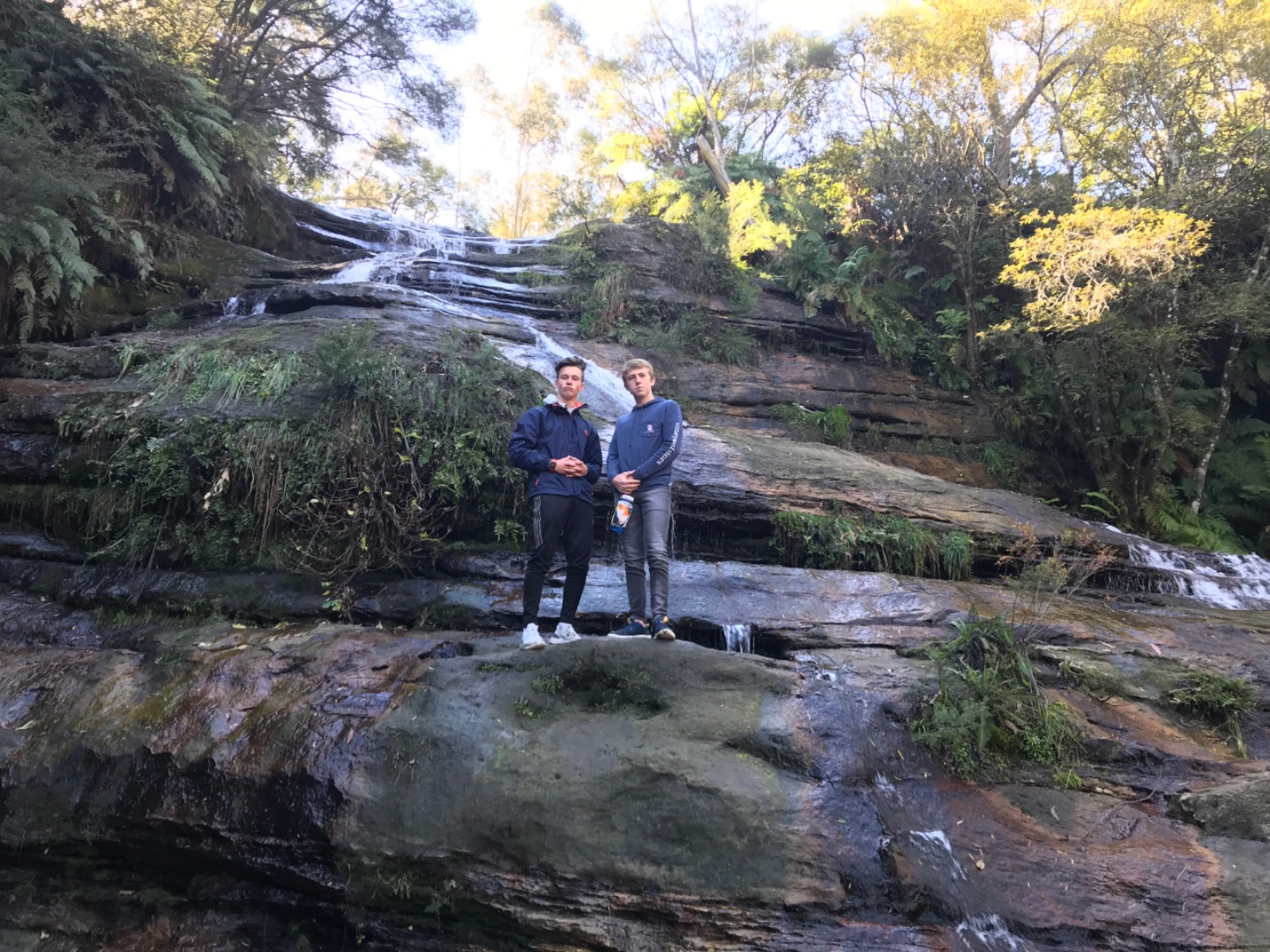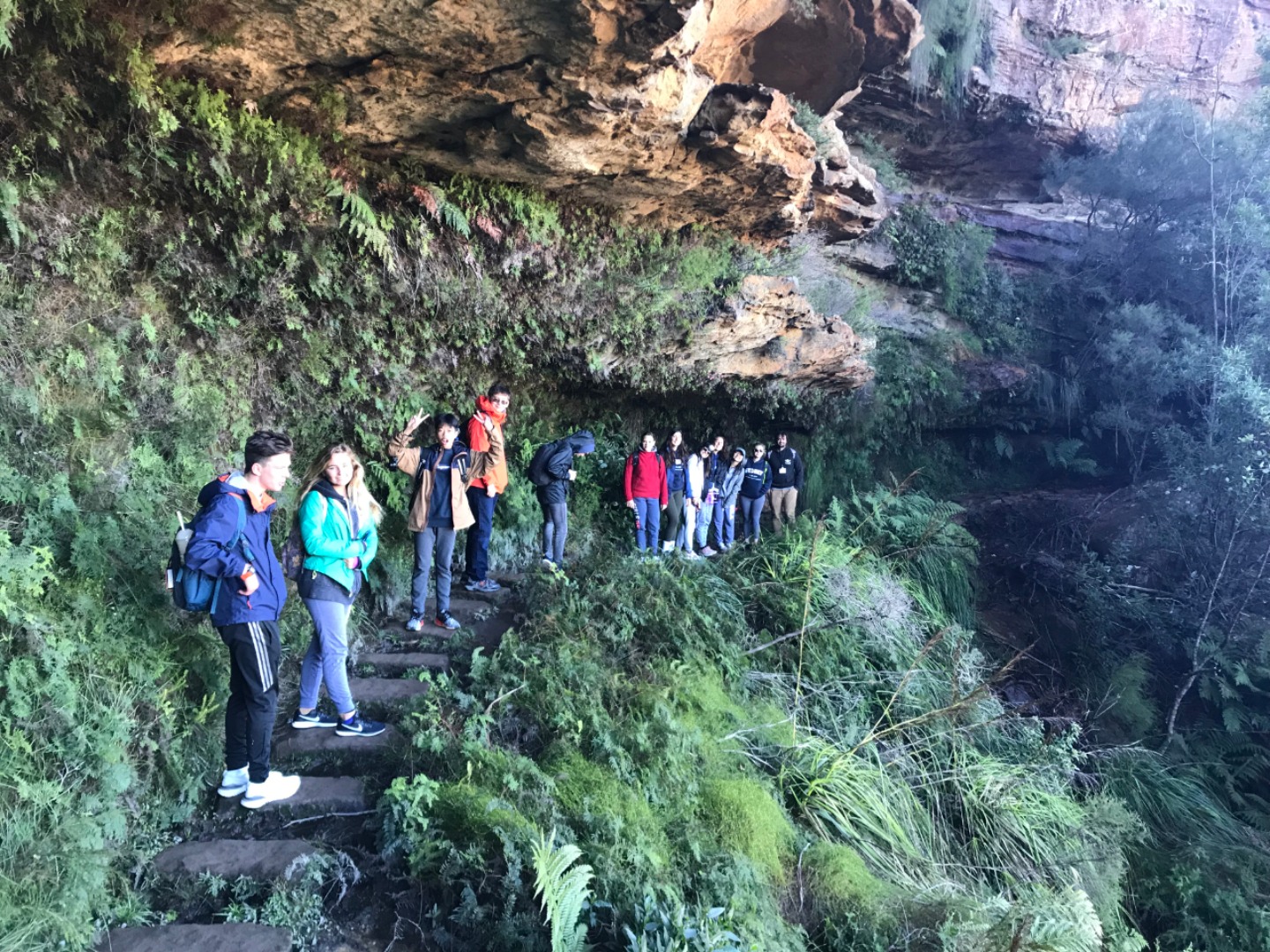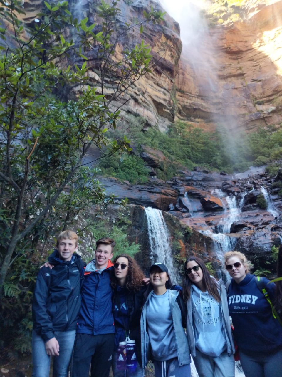 Our day started with a 7:30am pick up in a very Australian themed bus named Trudy. After riding for over an hour, we arrived in the Blue Mountain National Park. Our guide, Trent, spotted 2 kangaroos munching on some grass and we pulled over to take some photos before they bounced away. Before going on a hike, we went to get drinks and snacks at a local cafe. After the refilling, we embarked on our first hike through the Blue Mountains and across a waterfall. With lots of ladder-like stairs and muddy puddles ahead we could only hope for the best. In only a few short minutes we began to see that the hike was paying off. The water from the waterfall was showering the floor as we looked over the mountainous terrain. Even though some thought it was difficult, no one regretted the experience. Taking photos and viewing other geographical formations like the Three Sisters made us hungry so we set up in a park to eat lunch and had ourselves a proper Aussie barbecue. We tried kangaroo meat (which was delicious) and enjoyed the presence of five cockatiels and a pair of kookaburras during lunch. With full stomachs, we headed back towards our Bondi Beach hostel. On the way back we picked up Thai food and some fish and chips for dinner. Today was one that I will never forget as we got to enjoy new and exciting experiences.