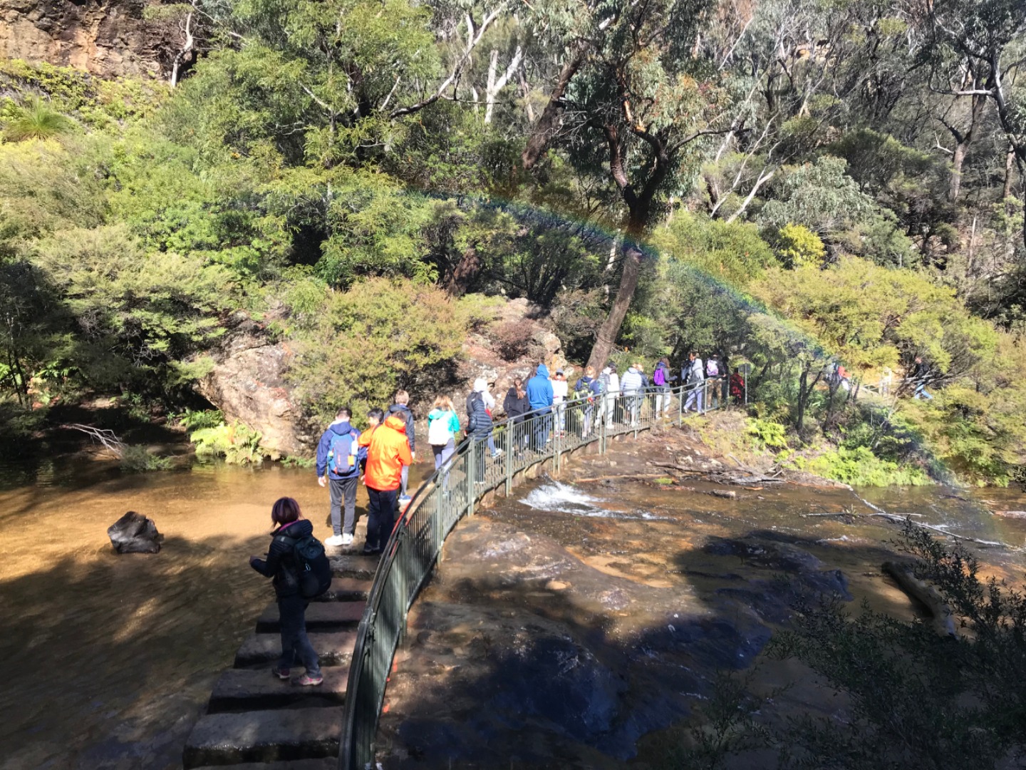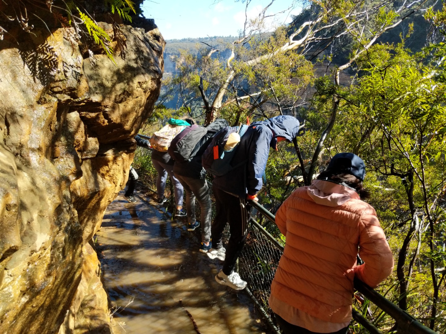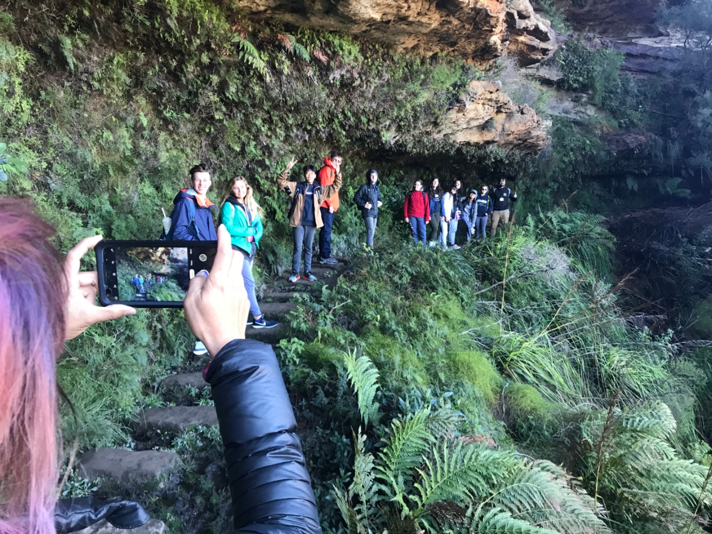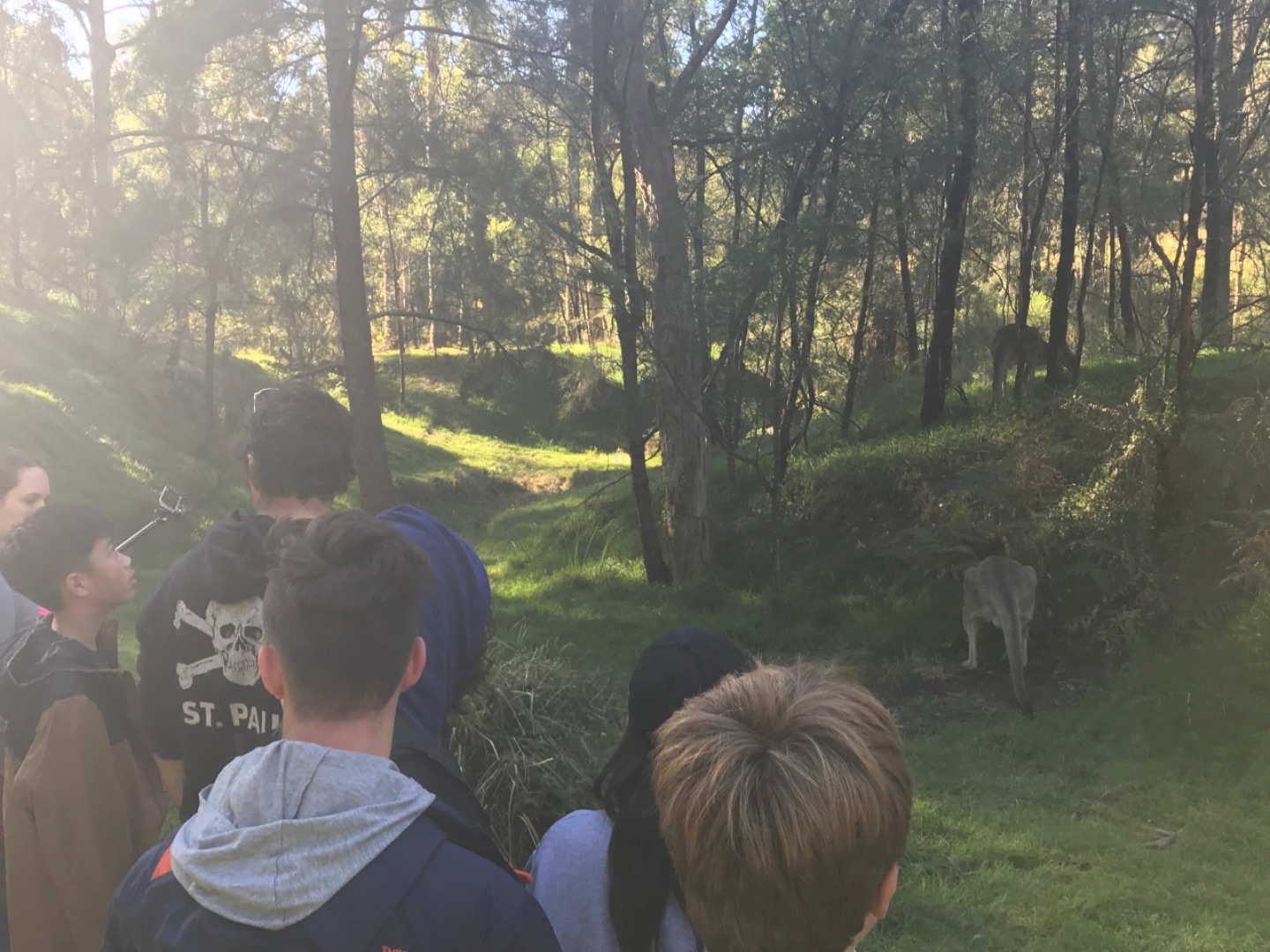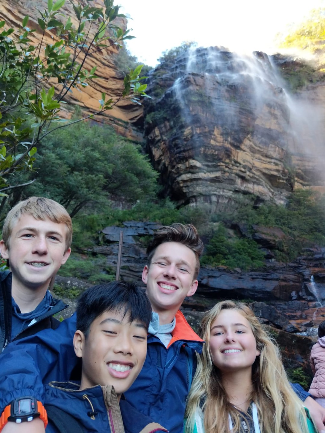 Our day started with a 7:30am pick up in a very Australian themed bus named Trudy. After riding for over an hour, we arrived in the Blue Mountain National Park. Our guide, Trent, spotted 2 kangaroos munching on some grass and we pulled over to take some photos before they bounced away. Before going on a hike, we went to get drinks and snacks at a local cafe. After the refilling, we embarked on our first hike through the Blue Mountains and across a waterfall. With lots of ladder-like stairs and muddy puddles ahead we could only hope for the best. In only a few short minutes we began to see that the hike was paying off. The water from the waterfall was showering the floor as we looked over the mountainous terrain. Even though some thought it was difficult, no one regretted the experience. Taking photos and viewing other geographical formations like the Three Sisters made us hungry so we set up in a park to eat lunch and had ourselves a proper Aussie barbecue. We tried kangaroo meat (which was delicious) and enjoyed the presence of five cockatiels and a pair of kookaburras during lunch. With full stomachs, we headed back towards our Bondi Beach hostel. On the way back we picked up Thai food and some fish and chips for dinner. Today was one that I will never forget as we got to enjoy new and exciting experiences.