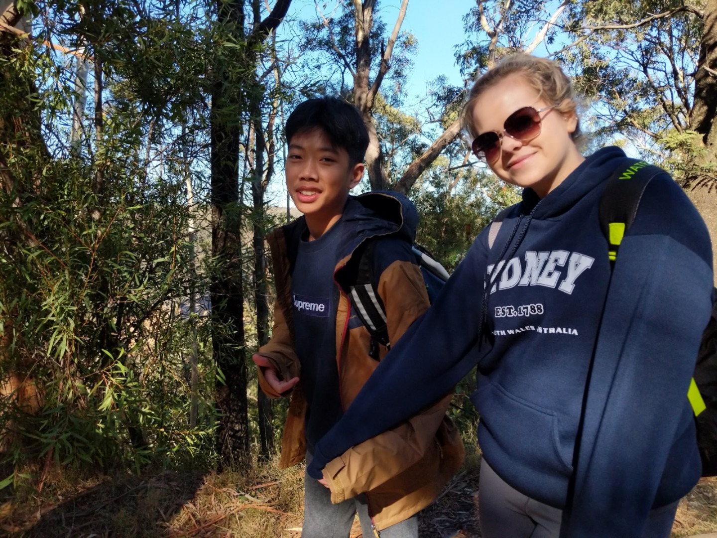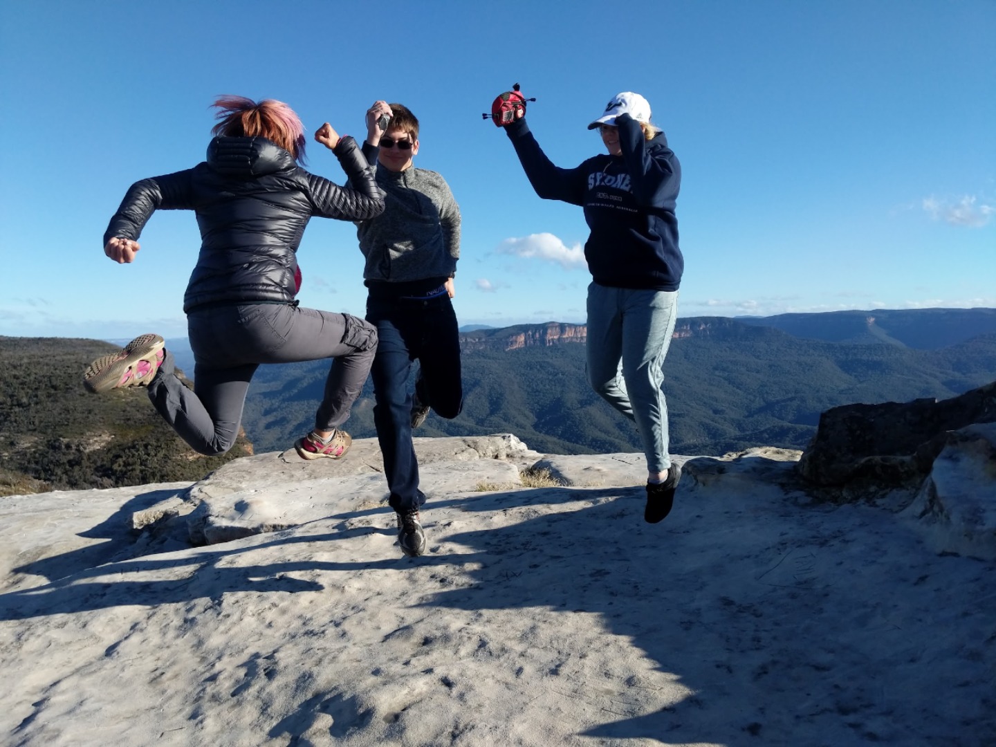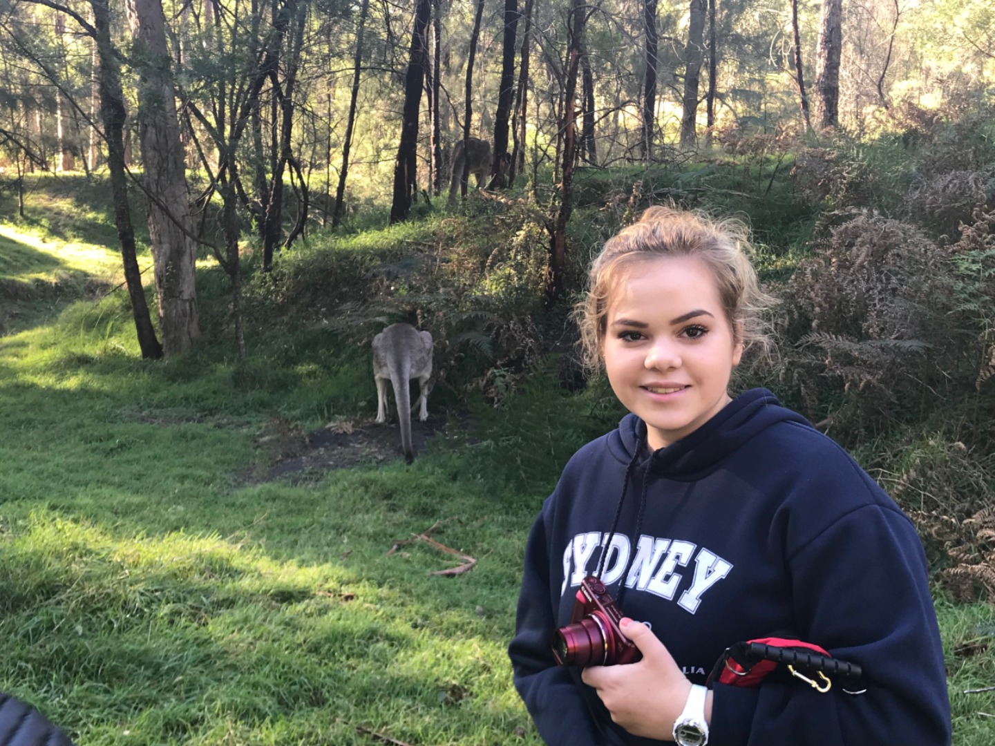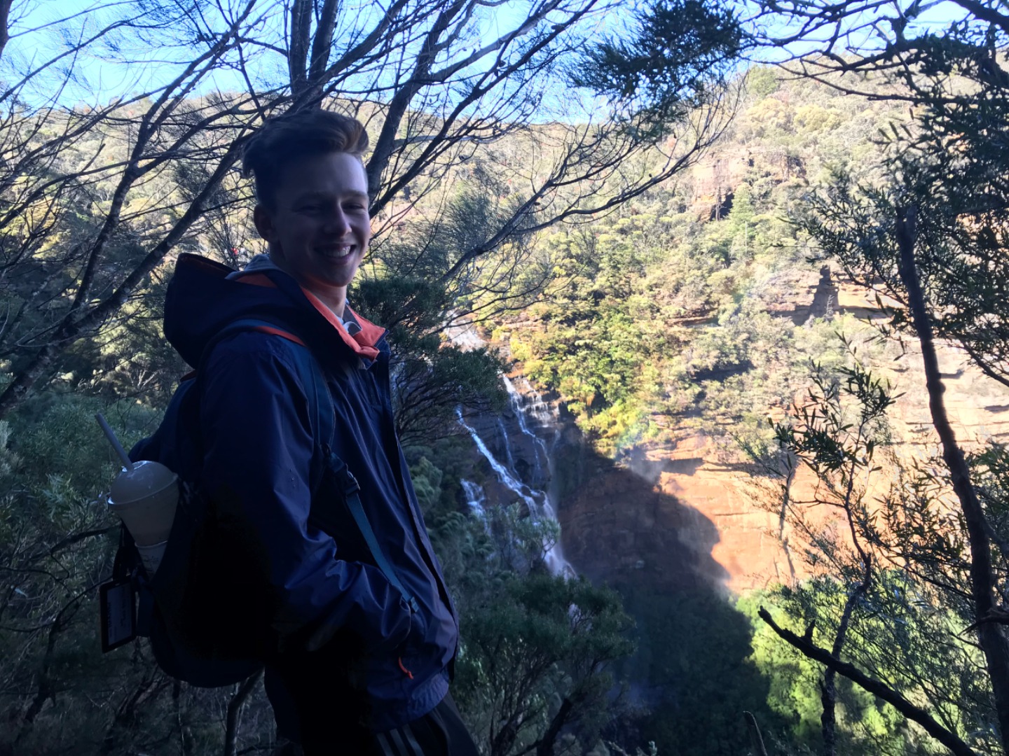 Our day started with a 7:30am pick up in a very Australian themed bus named Trudy. After riding for over an hour, we arrived in the Blue Mountain National Park. Our guide, Trent, spotted 2 kangaroos munching on some grass and we pulled over to take some photos before they bounced away. Before going on a hike, we went to get drinks and snacks at a local cafe. After the refilling, we embarked on our first hike through the Blue Mountains and across a waterfall. With lots of ladder-like stairs and muddy puddles ahead we could only hope for the best. In only a few short minutes we began to see that the hike was paying off. The water from the waterfall was showering the floor as we looked over the mountainous terrain. Even though some thought it was difficult, no one regretted the experience. Taking photos and viewing other geographical formations like the Three Sisters made us hungry so we set up in a park to eat lunch and had ourselves a proper Aussie barbecue. We tried kangaroo meat (which was delicious) and enjoyed the presence of five cockatiels and a pair of kookaburras during lunch. With full stomachs, we headed back towards our Bondi Beach hostel. On the way back we picked up Thai food and some fish and chips for dinner. Today was one that I will never forget as we got to enjoy new and exciting experiences.