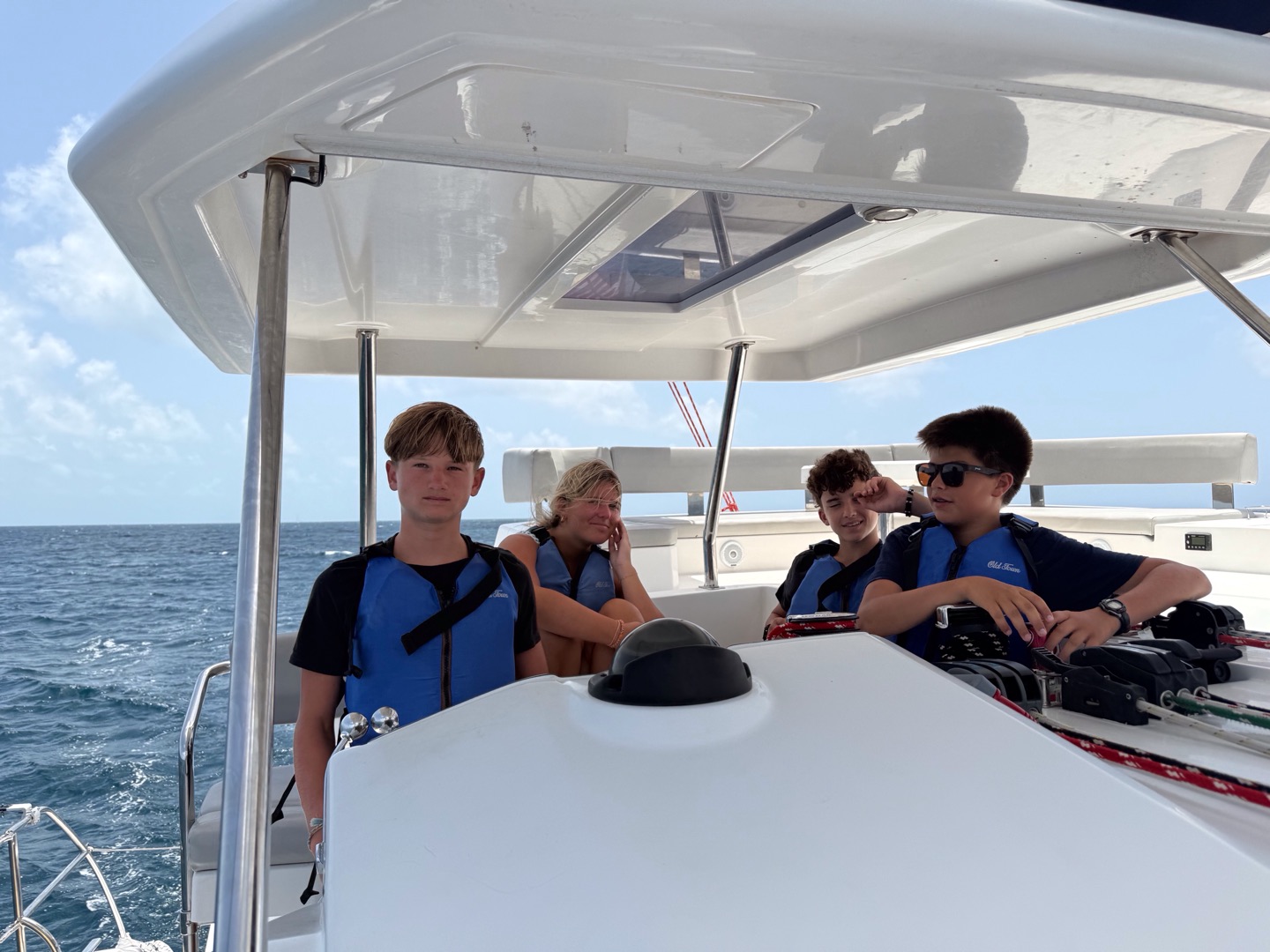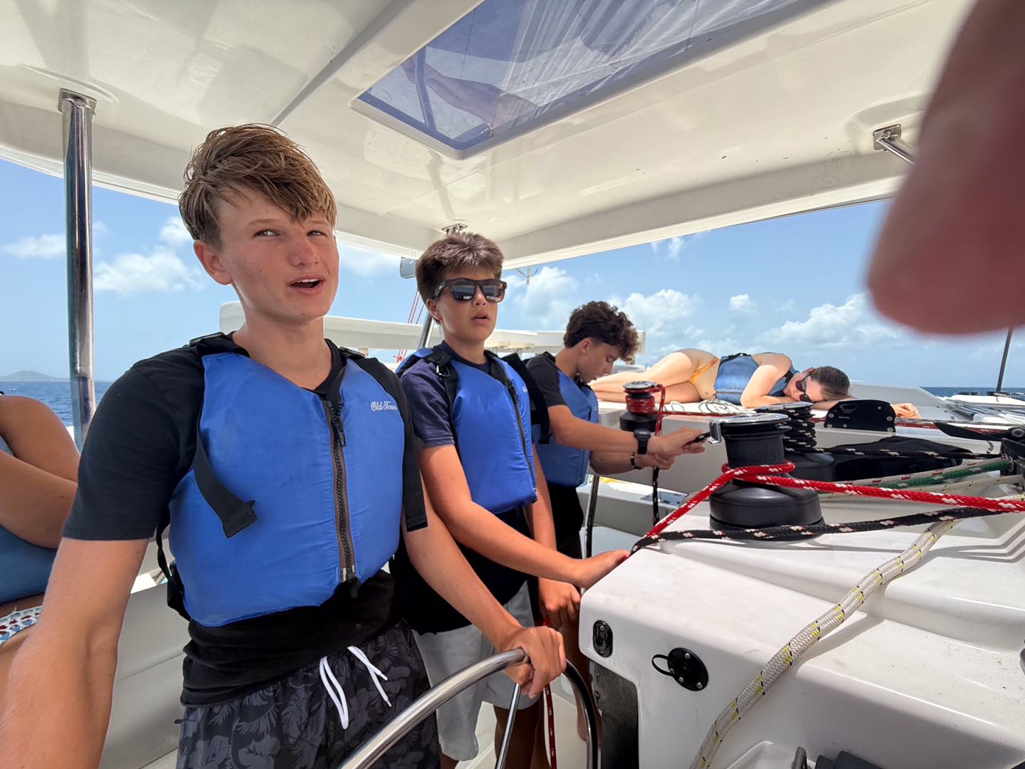 We all woke up this morning to an amazing pancake breakfast made by Maeve with some emotional support from Kiaan. After the cleanup, we set sail with the wonderful Joey, who helped us all learn sailing skills. During our lesson, Henry helmed while Stella, Kiaan, and Maeve took naps, waiting for their turns. Gray, Elly, and Charlie raised the main sail while Merin tailed and Addie eased the main sheet. Soon after, Reese took the helm, and Joey led the team through a few tacks. After a lot of training, we all sat down in the cockpit and had lunch underway. We spent a lot of time cleaning our boat and covering ourselves in zinc to prepare for the boat Olympics. After we took off for the boat Olympics, we mentally prepared as a team and strategized about how to win the gold. During the first event, we got absolutely shattered in tug-of-war by Hagen Time, and had to observe as Harbor House Out won. The next event was fender rodeo, and I won by lasting the longest while sitting on a fender. The last event was a relay race where Charlie, Gray, and I took second place by barely a hair. While this was happening, Joey was spending his time fixing the girls’ heads. Then, when the Olympics were done, we made it back to the boat and took an ocean shower while Amanda made chicken Cesar salad for dinner. We had a special guest, Mike, the director, who joined us for our meal. We finished up the night with a forum and slept after a long, eventful day of fun.