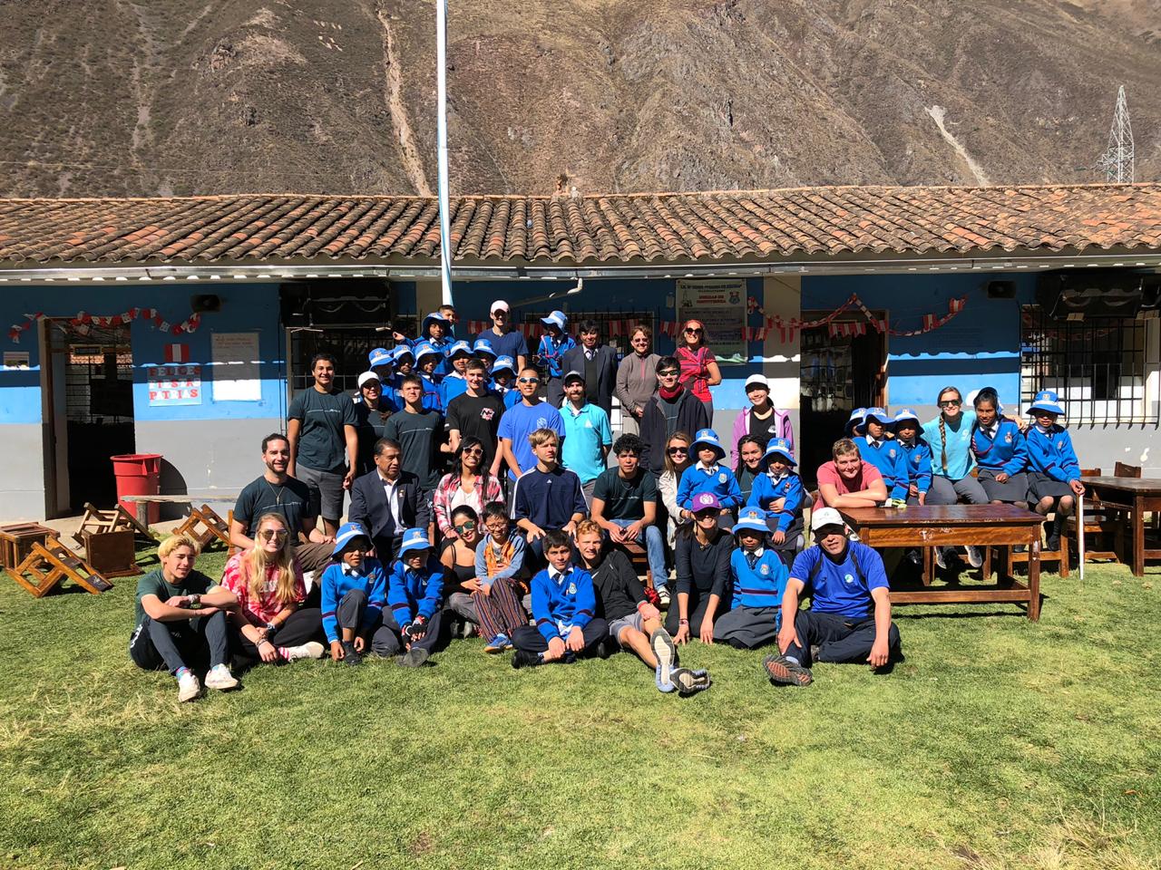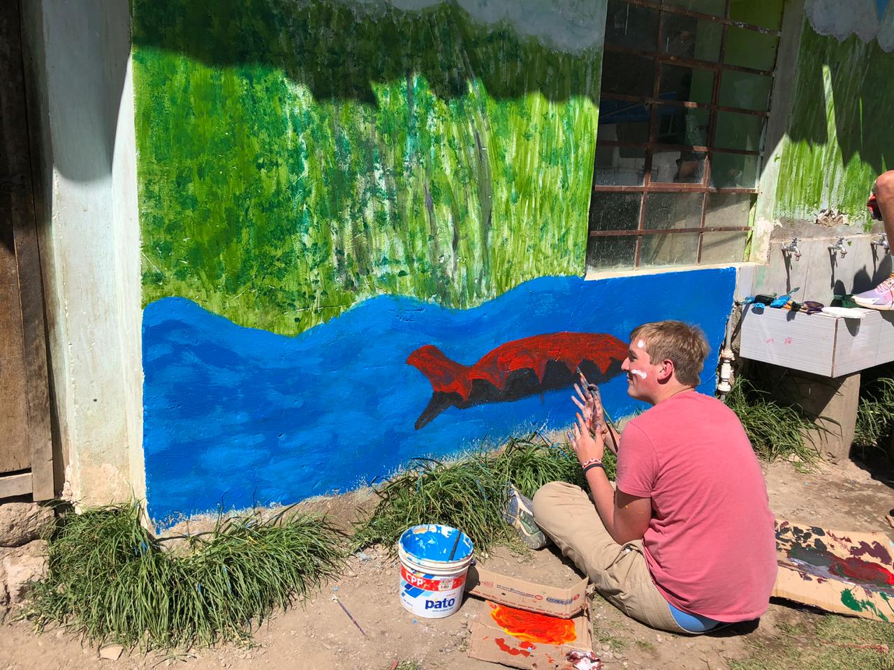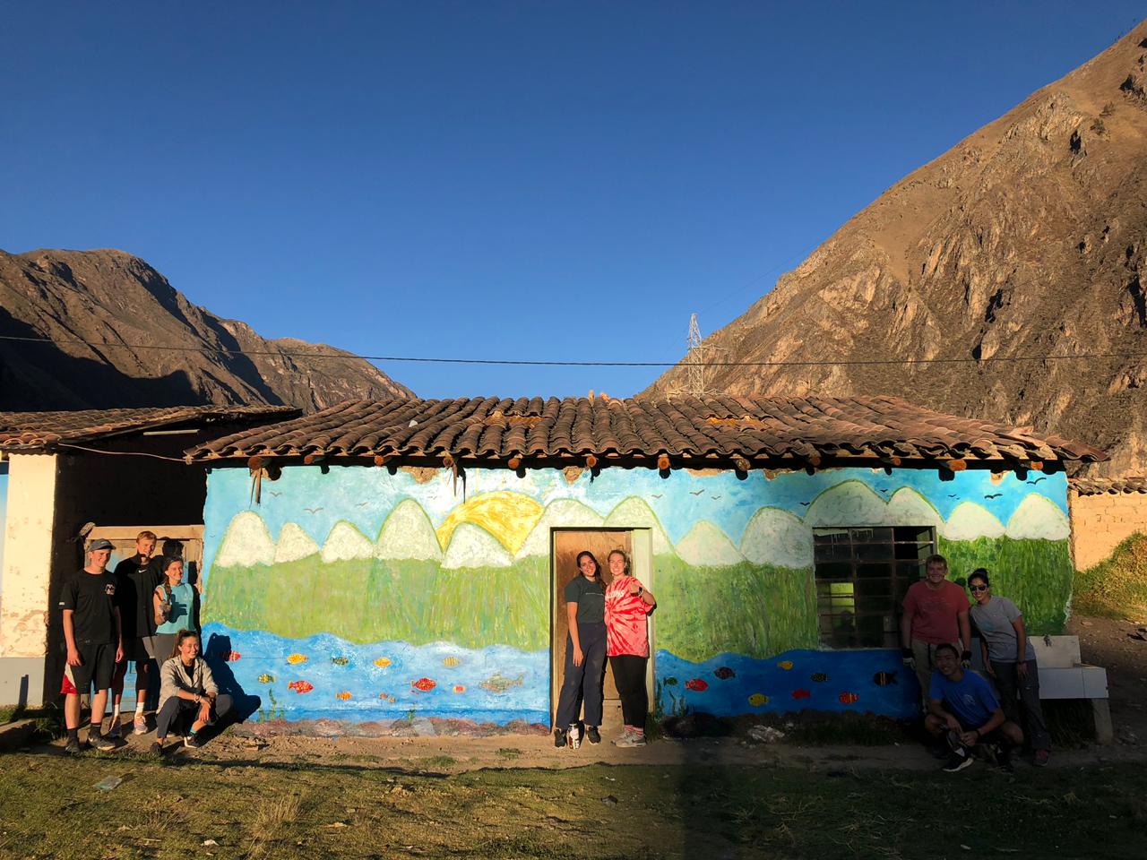 The 26th was our first day back together in Ollantaytambo after the trekking expedition returned to join us in service and we woke up early to walk to a school in town with My Small Help Peru volunteers. While the kids were practicing for the Independence Day parade, we worked to sand tables and chairs, paint and string bottles in the garden, and paint an extremely realistic mural on the wall. After a morning of hard work, we took the Canna-bus to a riverside restaurant where we ate the classic lomo saltado dish for lunch. Then we drove back to the school to finish painting the mural and varnish the furniture. Ty attempted to paint a river shark. However, we unanimously decided it would scare the children and covered it up with blue paint. Once finished with our work and an incredibly athletic basketball game, we headed back to the hostel to shower before dinner. We were more than surprised when the dinner turned out to be a surprise birthday party for Ty and Charlotte, and we spent the night dancing and singing in the small upstairs of a local cafe! Then we stopped at the store for some late-night snacks and refreshments before we conked out for the night.