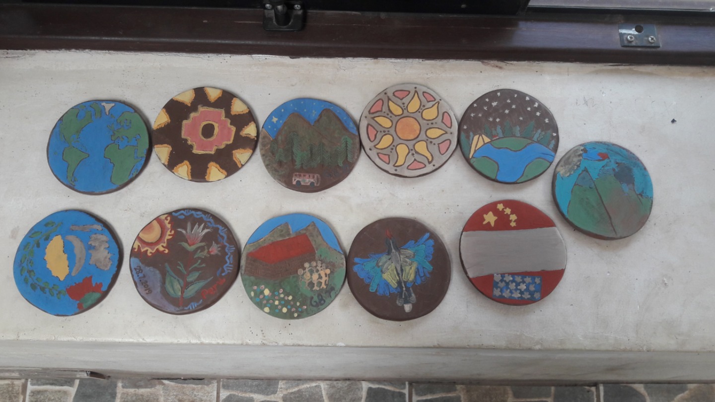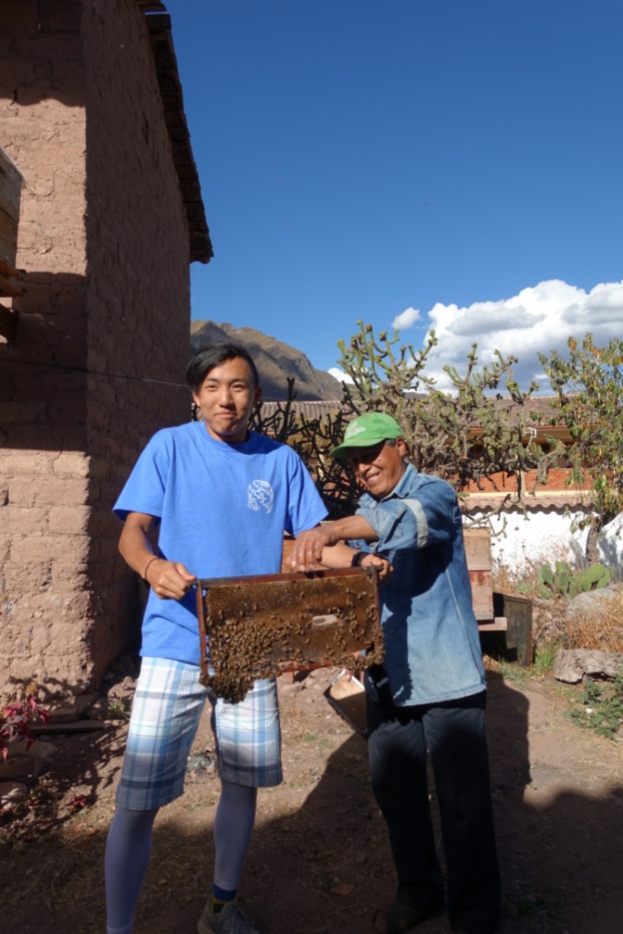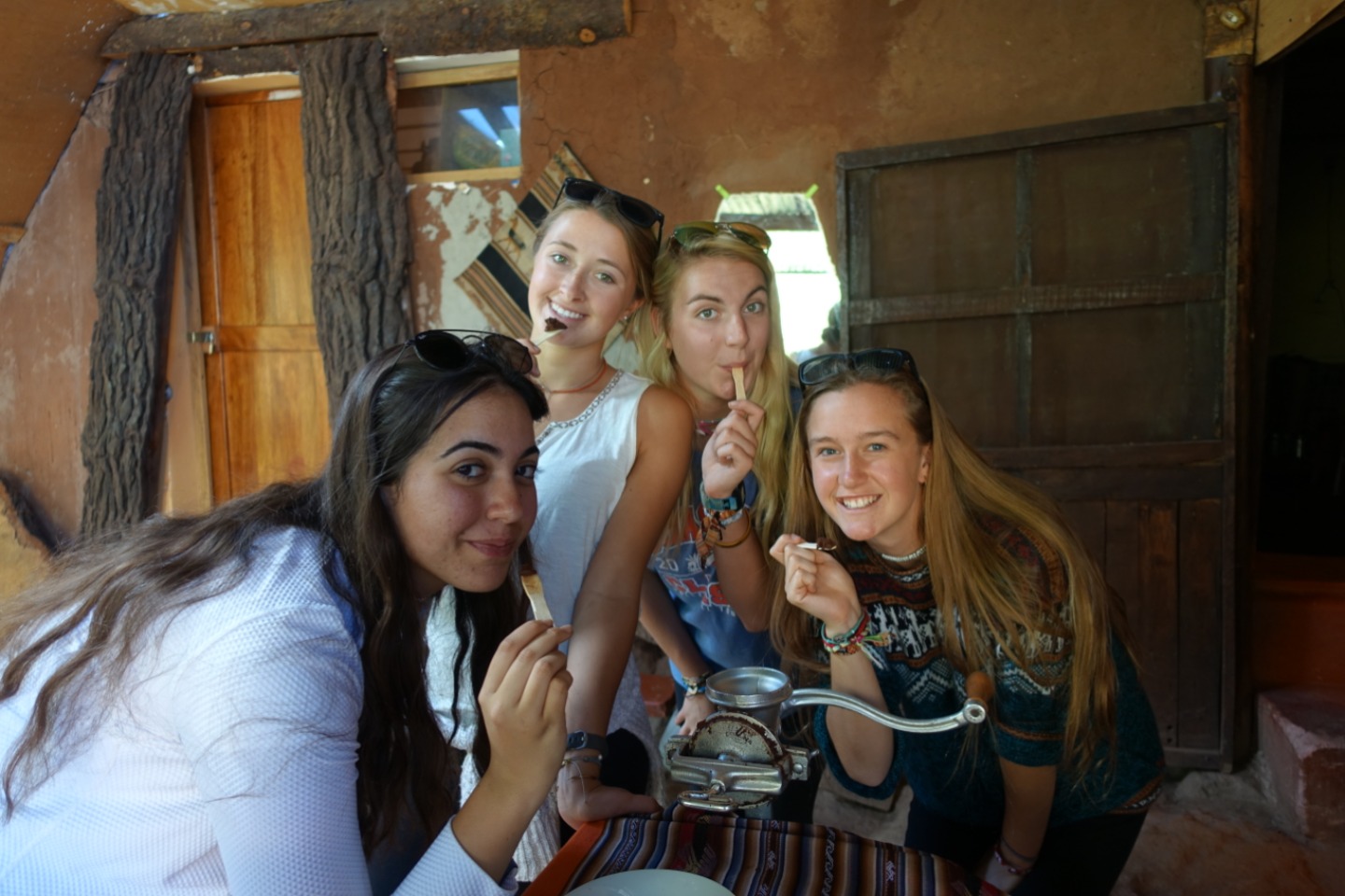 Today we had a fun and relaxed day learning about different arts and foods common to Peru. After breakfast, we took the bus to a pottery demonstration where we learned how to make simple bowls and pots. Each of us designed and painted a small coaster, and then we went to go sample chicha, which is a fermented corn refreshment typically drank by farmers working in the fields. After the chicha, we walked to another family’s home to see the process in which cacao becomes yummy chocolate. We got to help make some of the chocolate by heating the cacao beans for ten minutes, peeling them, and then cranking the beans and added sugar into a smooth chocolate spread. It was so delicious yet simple to make and left us craving more. Luckily, we ate lunch after a short walk to another beautiful home where we had chicken, rice, and veggies. Then we went to see a honey demonstration where most of us bravely let bees crawl all over our hands. Look for jars of honey coming home soon! After the honey, we took the bus back to the hostel and then some of us went with Jose to get more souvenirs and the best ice cream in town. Then we relaxed until dinner, had pasta/steak, went to a little dessert shop, and now Liv and I are working on the blog!