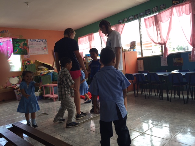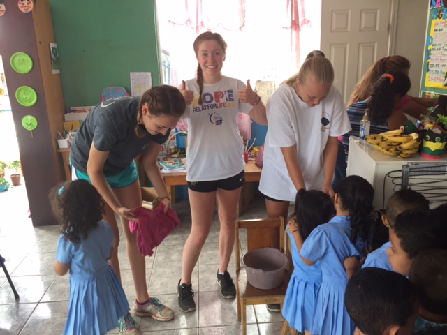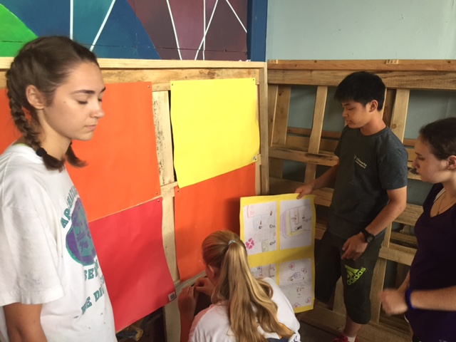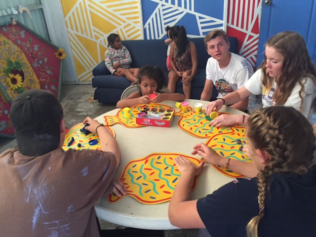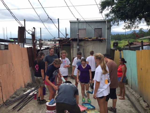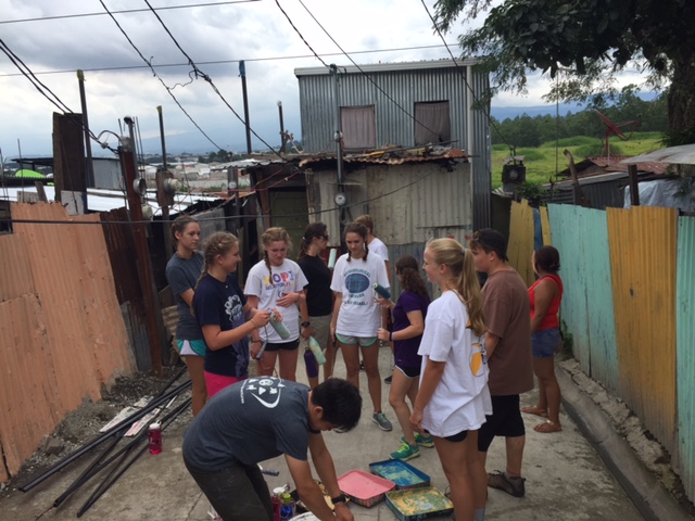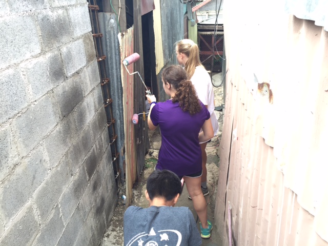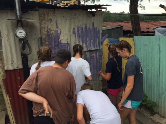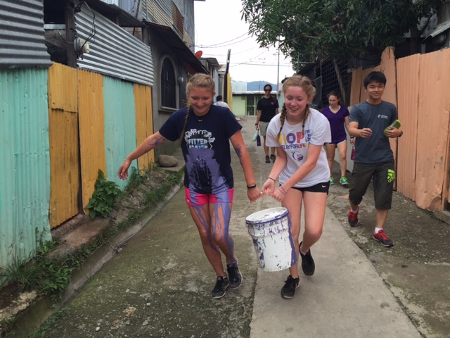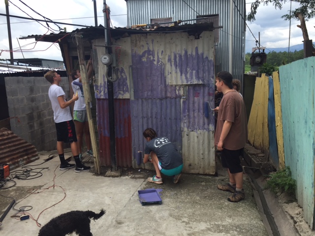 Today we traveled back to La Carpio after eating breakfast with our host families in the morning. We headed over to the preschool/library center and rotated finishing our tree mural by adding butterflies, playing with the kids in the preschool upstairs, and organizing books for the library. We then ate lunch inside, and Marisol brought us over to some homes we would paint in La Carpio. On the walk over to the homes, there was a little mishap with the paint where Kathryn spilled it all over herself, but everything was okay because it was a nice purple color. We then all worked together to paint the houses purple and pink before going back to the daycare center. We played with the children, making things out of playdough, playing with cards and also constructing some things to hang on the wall at the center. Afterward, we left La Carpio and went back to our homestays. The scheduled soccer game was rescheduled for tomorrow on account of the weather, so back at Lucy and Kathryn’s house, Kathryn braided their family’s hair, and we played some card games. Overall, we had a fun day of working hard.