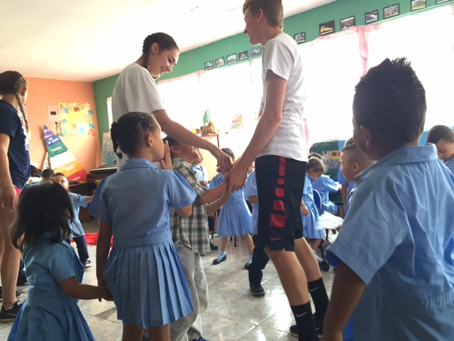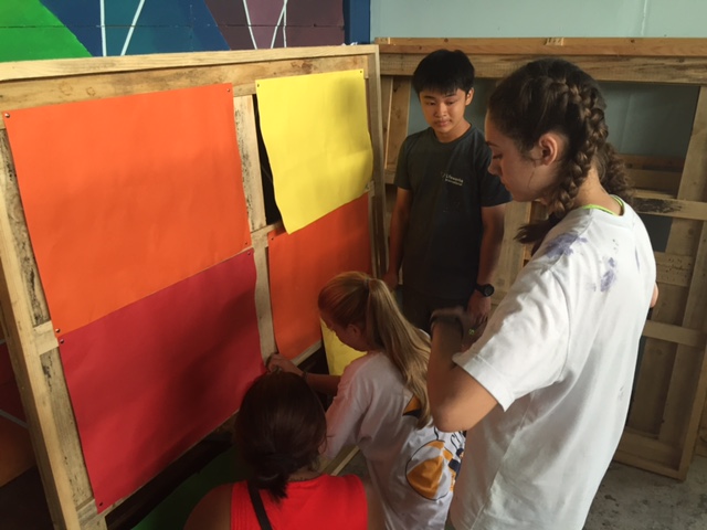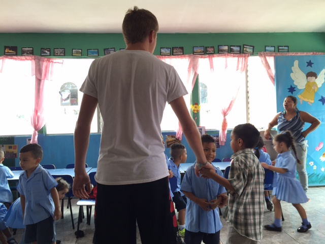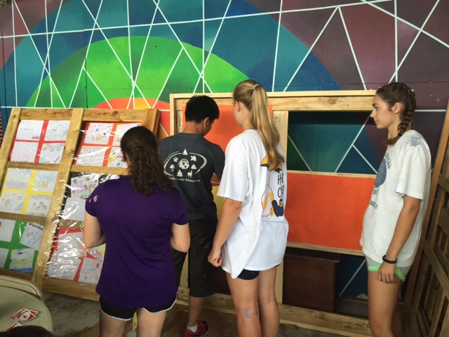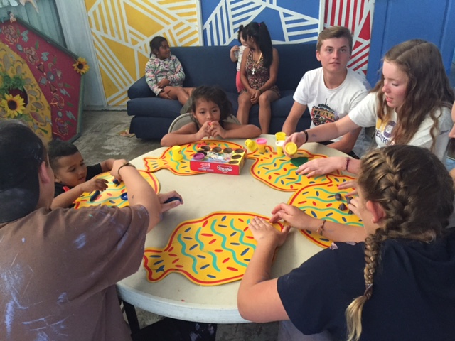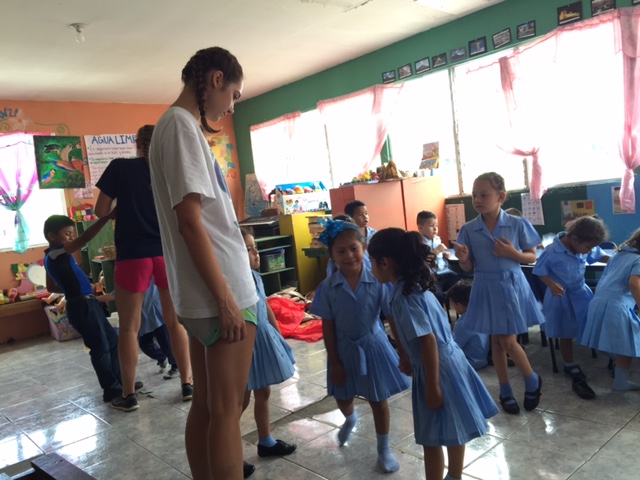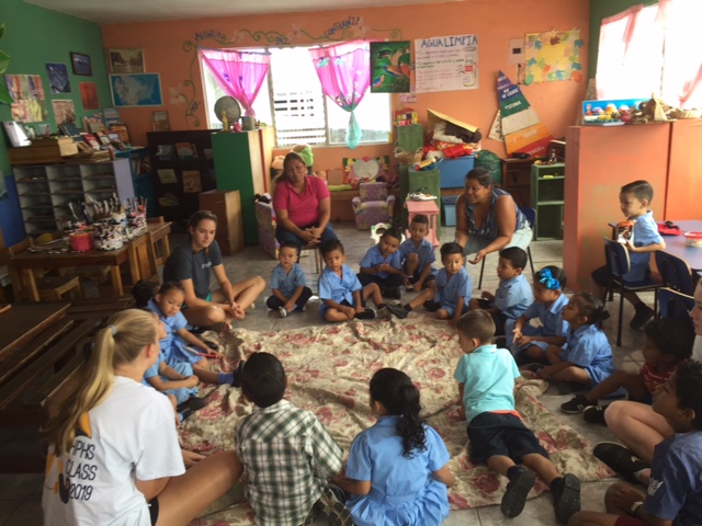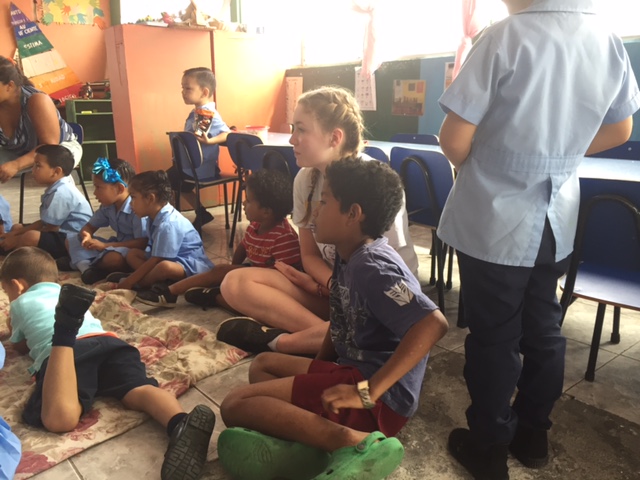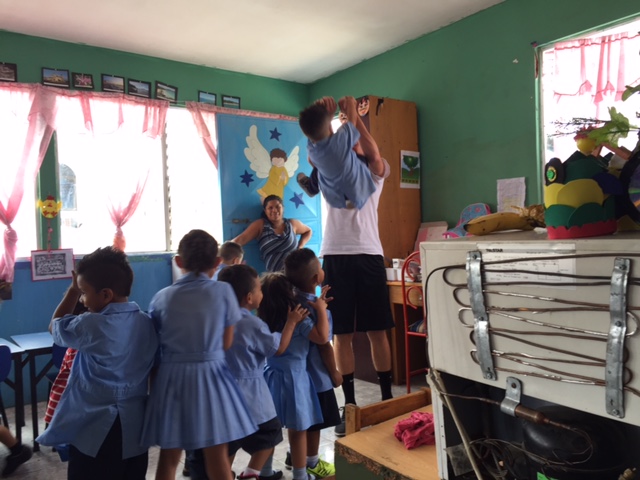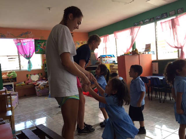 Today we traveled back to La Carpio after eating breakfast with our host families in the morning. We headed over to the preschool/library center and rotated finishing our tree mural by adding butterflies, playing with the kids in the preschool upstairs, and organizing books for the library. We then ate lunch inside, and Marisol brought us over to some homes we would paint in La Carpio. On the walk over to the homes, there was a little mishap with the paint where Kathryn spilled it all over herself, but everything was okay because it was a nice purple color. We then all worked together to paint the houses purple and pink before going back to the daycare center. We played with the children, making things out of playdough, playing with cards and also constructing some things to hang on the wall at the center. Afterward, we left La Carpio and went back to our homestays. The scheduled soccer game was rescheduled for tomorrow on account of the weather, so back at Lucy and Kathryn’s house, Kathryn braided their family’s hair, and we played some card games. Overall, we had a fun day of working hard.
