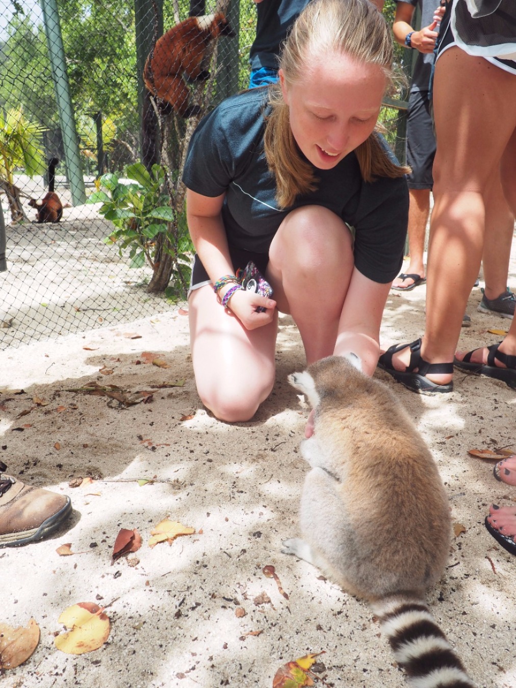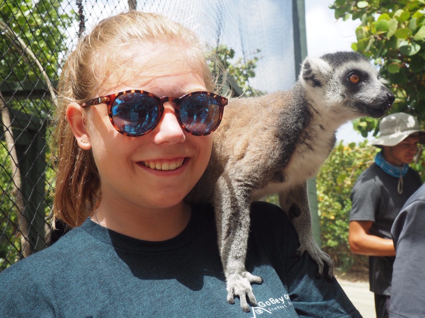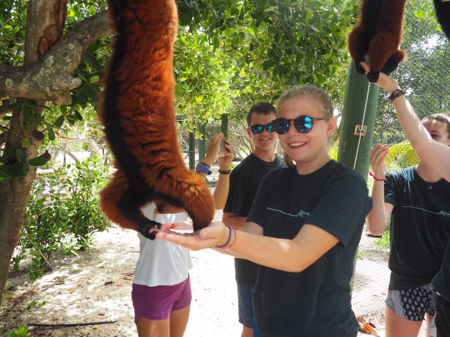 This morning we woke up flying through the air. We had strong winds, and the boat was bouncing up and down. We tried to eat breakfast, but more cereal ended up on the floor and in the ocean. The cheerios would fly out of the bag as you poured them. We were sailing to Necker Island, which is owned by Richard Branson. The island is one of the most amazing things I have ever seen. There is one dock that you can enter on, and it’s closed to the public. Once we go to the island, we were met by Vaman the head of the wildlife. We got a tour of the island and saw all the unique animals that live on the island. We saw lemurs that are almost extinct and who looked like little pandas. Then we walked to the beach that had golf clubs, and some boys tried to hit balls into the ocean. While some just missed the ball, Sean threw the golf club into the ocean. Sean then sprinted into the ocean to save the club. We were laughing so hard but were convinced Sean was going to be banned from the island. After the golfing accident, we got to do one of the coolest things I have ever done. The island is the home of lemurs, and we got to feed them. We went into the cage, and little lemur hands would hold ours. If we put the treat in between our lips, the lemurs would give us a little kiss. The ringtail lemurs would jump out of the trees onto our shoulders. I loved having a lemur named Wolf sitting on me. They had the cutest little hands, and it was so hard to say goodbye. The next amazing animal I got to hold was a baby turtle. The island had a turtle garden where they raised turtles. I held baby turtles, teenage turtles, and I pet a 600 lb. Tortoise. The main house was something out a magazine. It was perfect and the definition of paradise. It had a swing, wrap-around porch, a pool table and a Jacuzzi on the top floor with a view of the whole island. After Necker, we went on a sail to Marina Key. I sailed the boat, and it was a little scary at first, but I got the hang of it. We stopped to get water and docked the boat. Docking the boat was stressful but successful. As usual, dinner and the evening was a blast. We sang, cleaned and headed out for a program-wide activity.