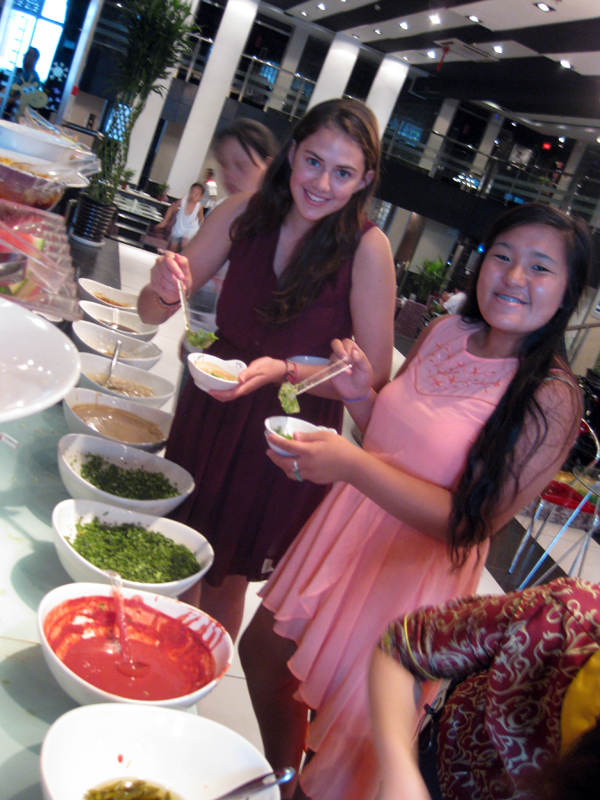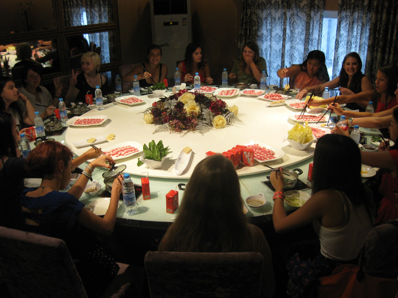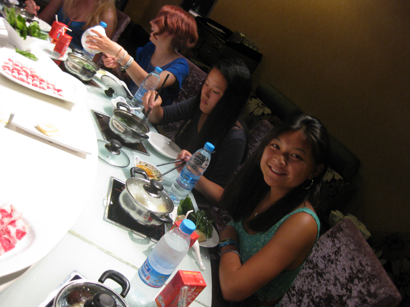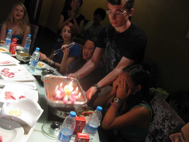 8:00 am. Hannah came to the room and woke us up. Everybody got dressed and went to the living room to have breakfast. As everyone arrived each one of them congratulated Lily for her birthday. And after eating something, we prepared our things to do service. Half of us, me included, went to the group home and the other half went to the baby home. We spent our morning there, and after that, we gathered in the Little Flower office to split into groups and make dumplings with the group home families. It was pretty fun because every one of us got the opportunity to see what a group home looked like plus the amazing opportunity to learn how to make dumplings! We made the dumplings, and then we ate them, and we gave some of them to the other kids. After this delicious meal, we went to do service again. So, the group who was in the group home went to the baby home and vice versa. We spent the afternoon there, and we came back to the apartment to take a shower and get ready for one of our nice dinners at hot pot. As we arrived at the restaurant everybody was starving so we attacked the food! It was cool 🙂 Each one of us had this little burner with a pot of boiling water where we put different meats and veggies to eat them and make kind of soup. It was amazing. Then, Catherine made a delicious chocolate cake (seriously the most amazing chocolate cake of all time), and everybody sang happy birthday in different languages: English, Hebrew, Spanish, French, and of course Chinese! And finally, after blowing all the birthday candles out, the staff surprised us with a karaoke party! We sang many songs like single ladies, one more night, butterfly, give me love, etc… I think that everybody liked the karaoke party, we sang and danced like crazy. Then we went back and went directly to bed because we were pretty exhausted. It was a really good day 🙂