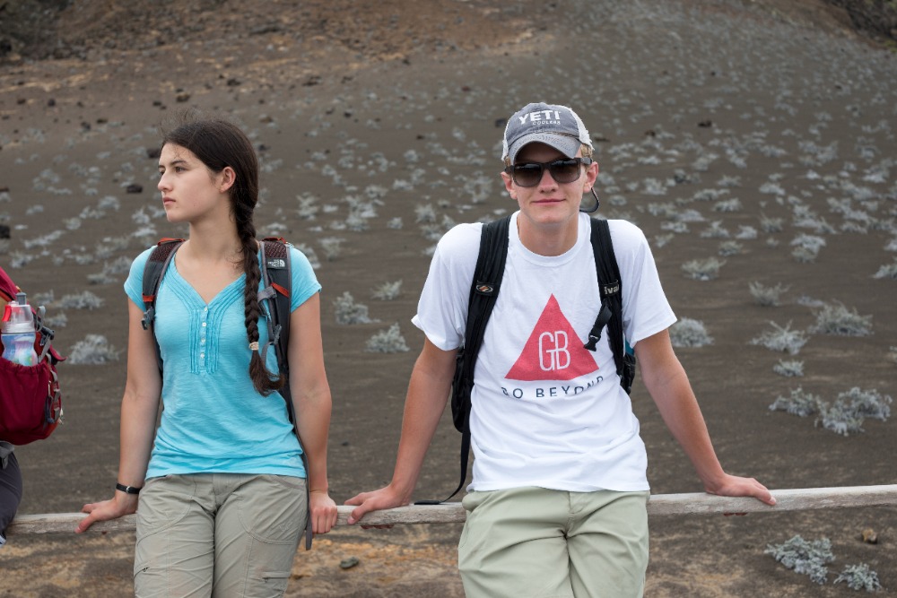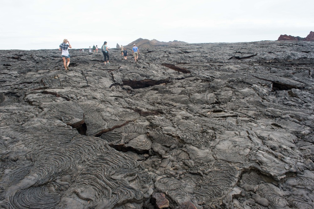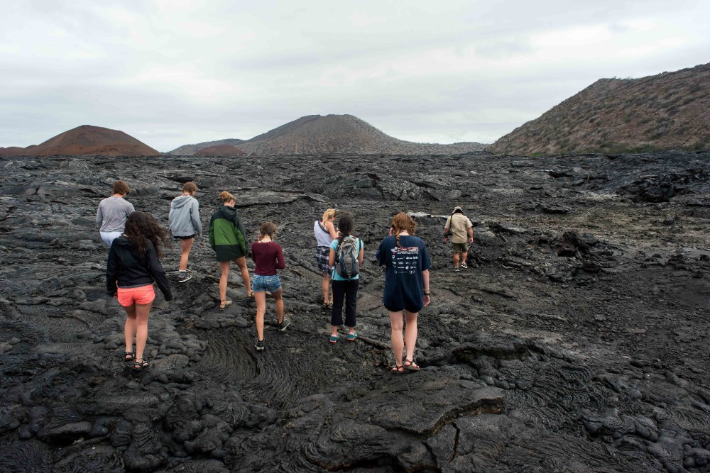 After another nice lunch of noodle and cheese soup that tasted like ravioli filling, ceviche Galapagos style (cooked), cauliflower with cheese sauce, and, of course, rice, cantaloupe, and pineapple, everyone but Devin, Sky, and I passed out on the couches and in their beds. The three of us went with the kindly Captain Augustin in the Zodiac/dinghy to patrol the shores of Bartholomew Island for penguins. We found a little family of three penguins, two adults and one fluffy, endearingly awkward adolescent, almost immediately. We took lots of pictures and then enjoyed a little tour of the lava rock shores of Santiago courtesy of the captain. When we returned, everyone was still out cold (as we usually are after lunch, and activities, and while on any moving vehicle). Our siesta lasted for maybe ten more minutes. Then, the strident chime of the bell followed by disembarkation to the shore that Devin, Sky and I had just explored by boat. The hundred-year-old lava flows of Sullivan Bay are astounding and almost alien. The rock appears to move beneath your feet. The strange folds created when the lava rapidly solidified creates this optical illusion and gives the lava flows the air of a place frozen in time. After setting our guides record for the fastest completion of the Sullivan Bay hiking loop (around 55 minutes), we headed to a nearby beach, donned our snorkeling gear, and plunged into the frigid water. Quinn, Cap, Skyler, Sky, Devin and I worked our way down the rocky coast in search of sharks and turtles. After what felt like ten minutes of constant swimming, we found a stingray and three green sea turtles grazing on algae! They were beautiful and completely calm, allowing us to stare at them and follow them around. We saw two smaller ones with light brown shells and one larger one with a darker, greener shell. We would have stayed out there with the turtles for hours, but the increasing cold eventually forced us to return to the beach and then the boat. We all cleaned up and hung out for a while. I ended up on the top deck watching the sunset and just happened to be there when Sky spotted what looked like a huge pod of dolphins off in the distance. We yelled for Devin so that we could use his zoom lens to see the dolphins more clearly, and then, the boat suddenly turned. Quinn had gone into the captain’s cabin, pointed at the dolphins, said Por favor and gotten the captain to steer our boat right into the dolphins’ midst. As we approached them, it became clear that this was no ordinary pod of dolphins. This group was over a hundred strong and, as we soon learned, was made up of multiple Bottlenose dolphin pods migrating through the Galapagos! When the dolphins noticed us, they all turned and fell in line with our boat. At least ten suddenly appeared below the bow of our boat, racing it effortlessly. Everyone, even the crew, heard our screams of Dolphins! And scrambled out to the bow, stunned, smiling like maniacs, and yelling. All around us were these huge, strong, beautiful creatures, squeaking, playing, racing our boat and even jumping. It was as if they were showing off to us. Some of the dolphins executed incredible jumps, launching themselves anywhere from a foot to 12 to 15 feet above the water, twisting and falling back into the ocean with gigantic splashes. For twenty minutes, we stood out on deck, absolutely mesmerized and excited out of our minds.