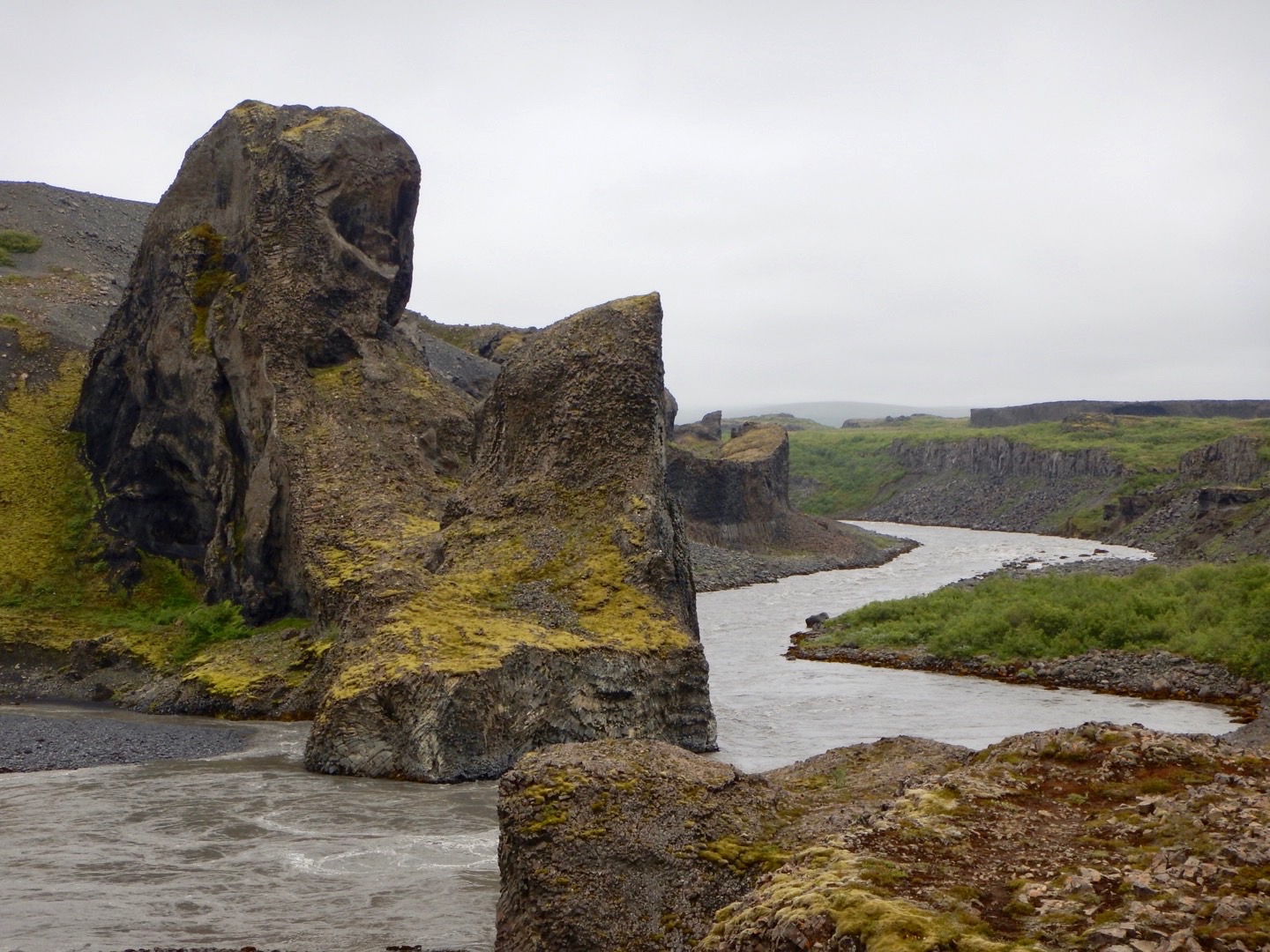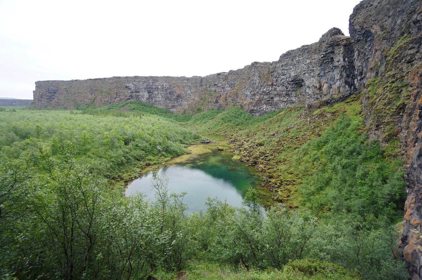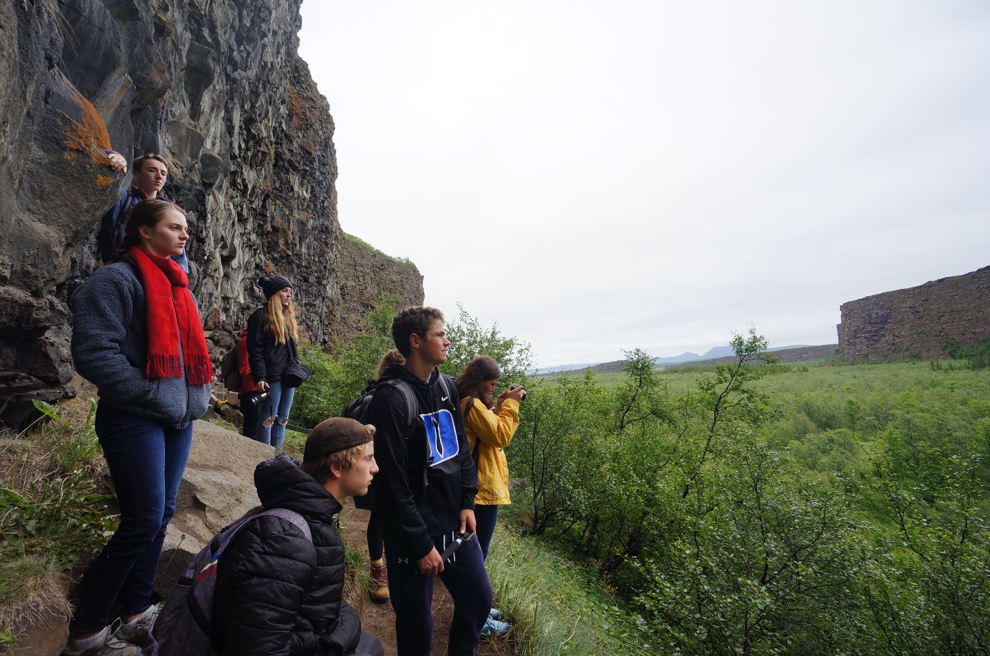 Our driver, Auden, started our day off with dropping us off at Ásbyrgi, the crater left behind by a hoof-print from the Norse god Oden’s horse. We walked through the Icelandic birch trees to be treated with a sweet surprise, Ovi, the trumpet player. We gathered around and enjoyed his peaceful music as we overlooked the crater surrounded by rugged rocks. The songs brought people together, singing the happy tunes of “Hallelujah.”