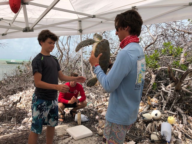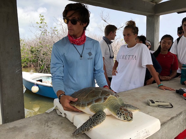 Today we began our day a little earlier than the last few. As skipper, I was given the wonderful privilege of waking the rest of the boat up at 6 am, which I am almost certain everybody appreciated quite a bit (not!). Following the rude awakening, we gathered for a breakfast of oatmeal and cereal, and immediately after began preparing for our long day of turtle tagging. After a 10-minute taxi cab ride, we arrived at the Old Fishermans Wharf in Anegada, A local fisherman/DJ named Richard took four students out at a time searching for Sea Turtles to be tagged. The first group brought back our first turtle to tag, which I got to name, and chose to name him Corey. People not out on the boat passed time reading and playing cards. Our second boat was able to bring back three sea turtles, of which all three had already been tagged, a sure sign of the effectiveness of GoBeyond students in the area. By the end of the day, we had successfully caught and tagged six turtles. While I declined my choice to help with the capture, I was quick to accept the offer to help with the releasing of turtles. Then we took our final Anegada cab ride, said our last goodbyes to the islands, goats, cows, and flamingos. We then took our short ride back to the boat and began showering and getting ready for the evening: all in all, a slow-moving day, but one that left us feeling accomplished.