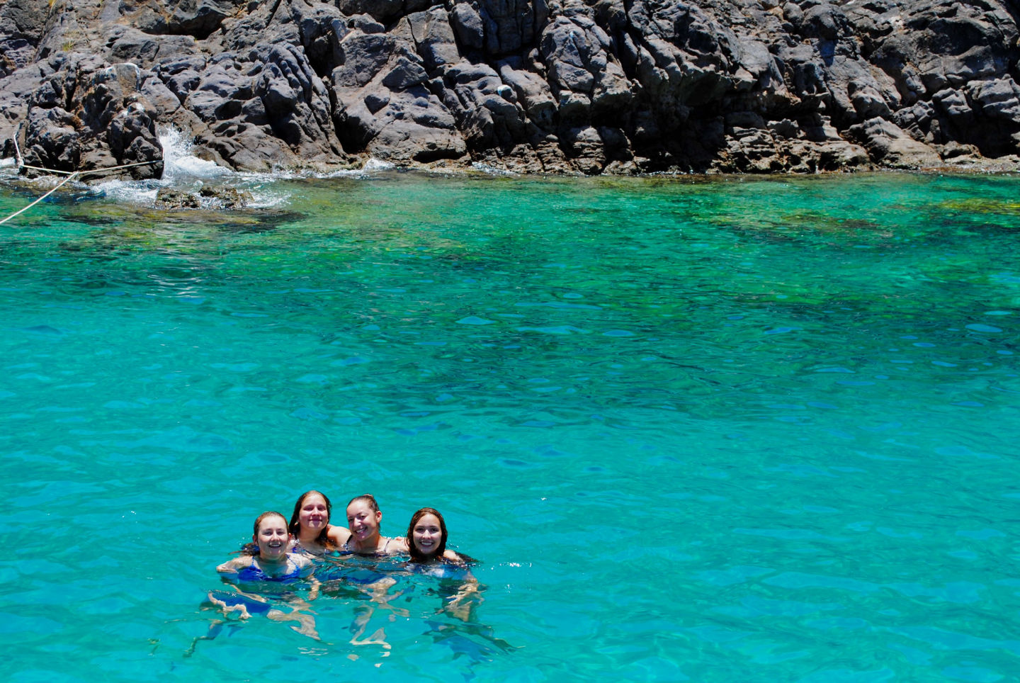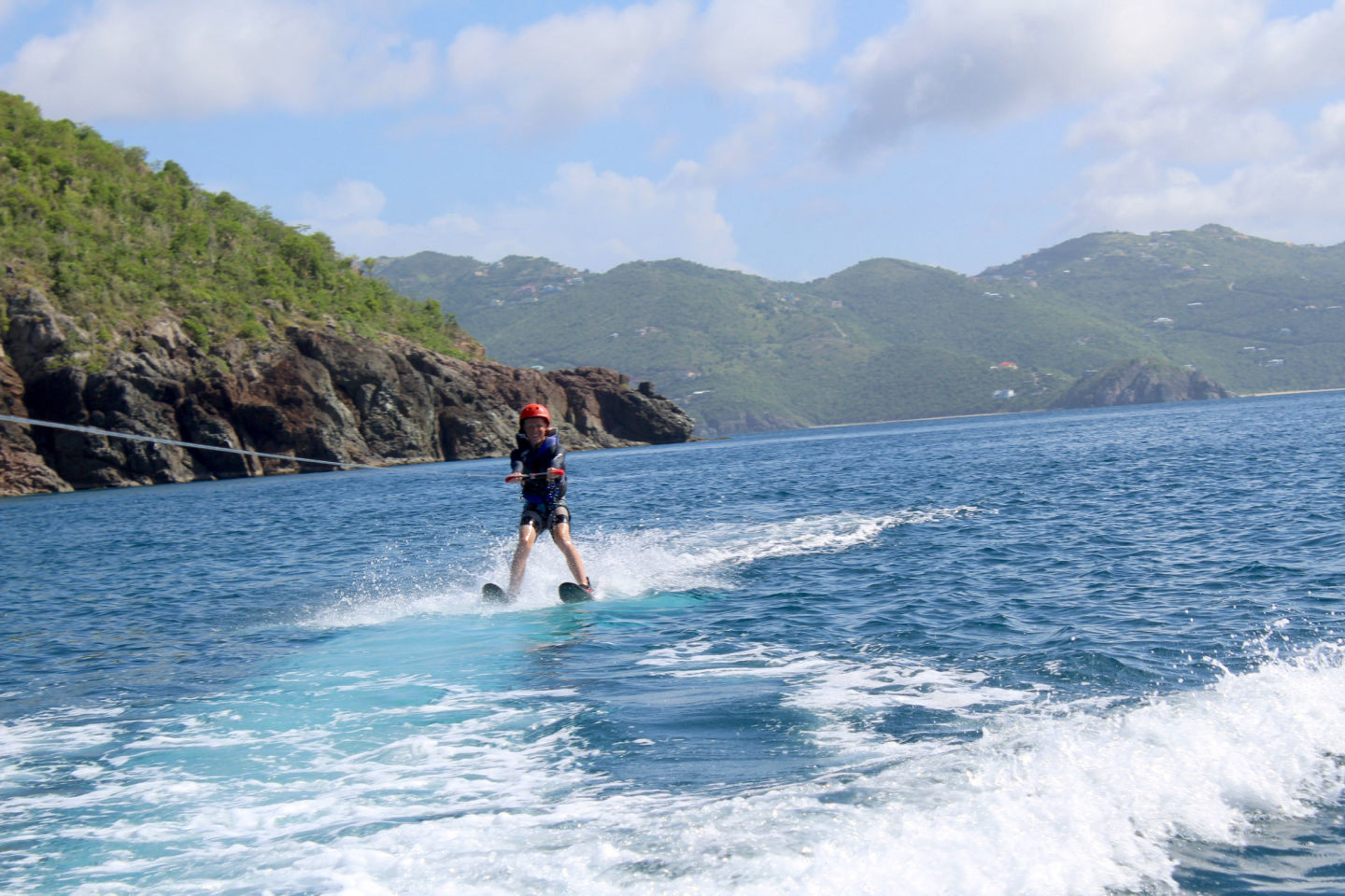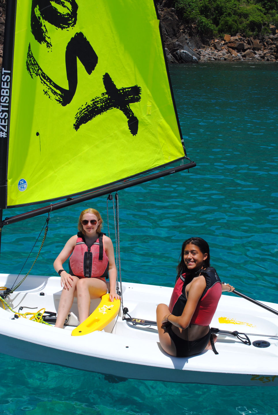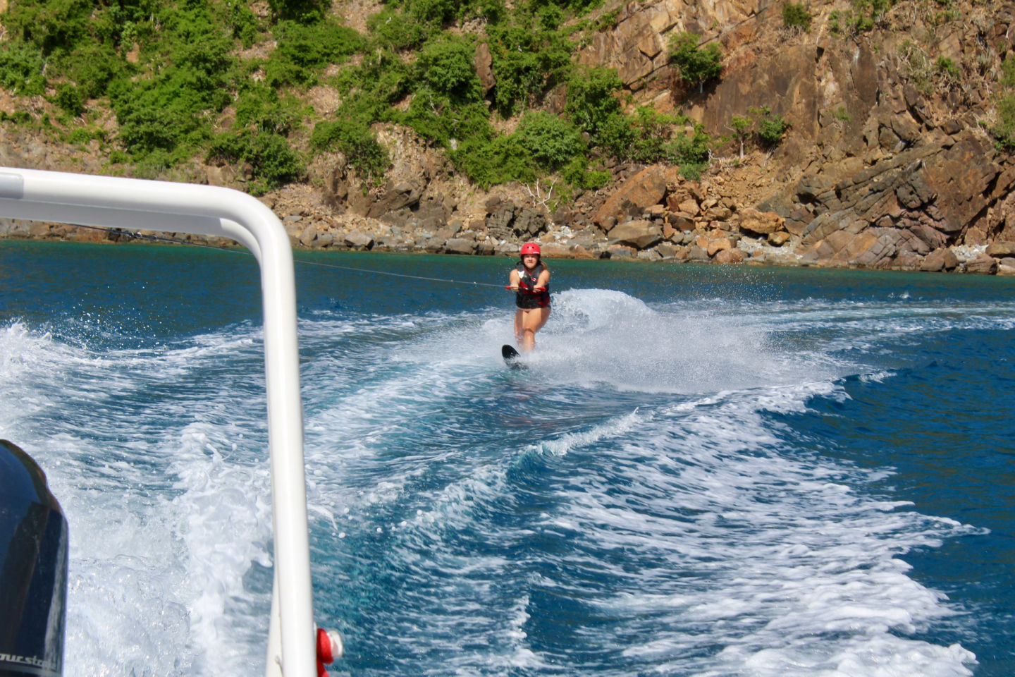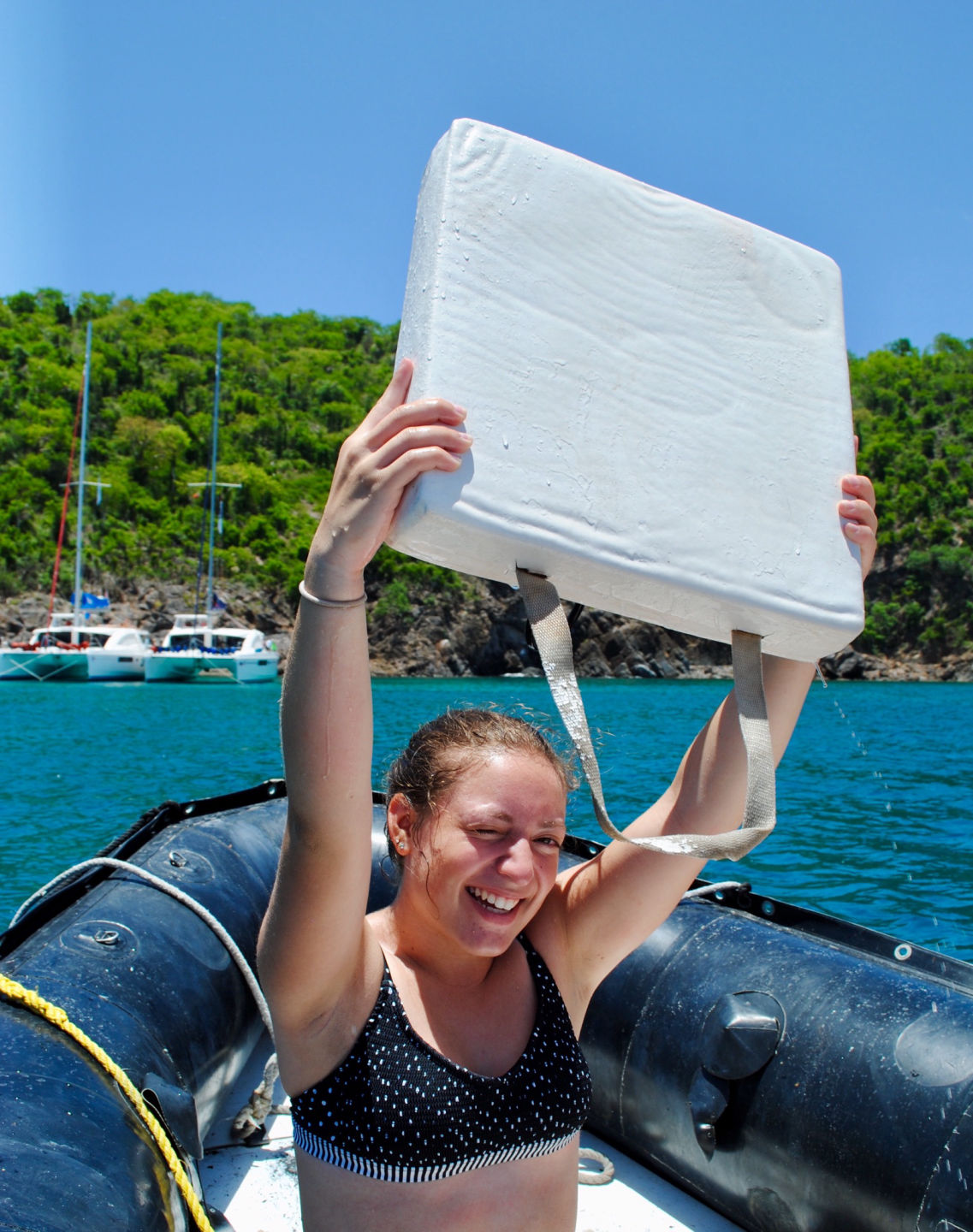 Mandatory Fun Day: the absolute best day of the session. The day started off quite differently than usual. I woke up to Charlotte and Griffin, staff from another boat, collecting pillowcases and teaching the chefs how to make French toast. This was different than the normal wake-up with music. All of the staff had a meeting in the morning, so the students were responsible for making breakfast, cleaning the dishes, and getting ready for the day before the staff got back. It took us a little while to all get-up and going, but once we got ready, we were all motivated to impress the staff and have everything done. The staff got back when we were in the middle of clean-up, and I got to go on a garbage delivery with “Jungus” where he let me drive the dinghy. Once we got back, we motored to Guana bay, where fun day really got started. It all started with a fun dinghy ride around the point on the island to see the native birds. Next, we all had the opportunity to do whatever we wanted in order to have the most fun day possible. Whether that meant water skiing/wakeboarding, tanning/relaxing on the boat, driving the dinghies, jumping off the boat, or snorkeling, it was up to you to make your day as fun as you wanted it to be. Hayley, Alexis, and I all started off our days by jumping off the boat together, and then we relaxed in the sun until we got to drive the dinghy.