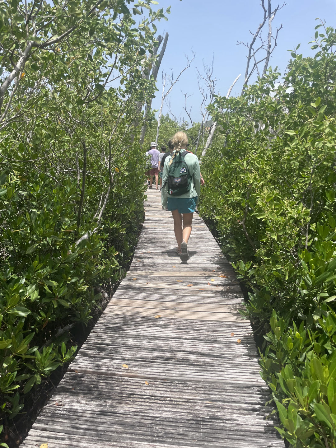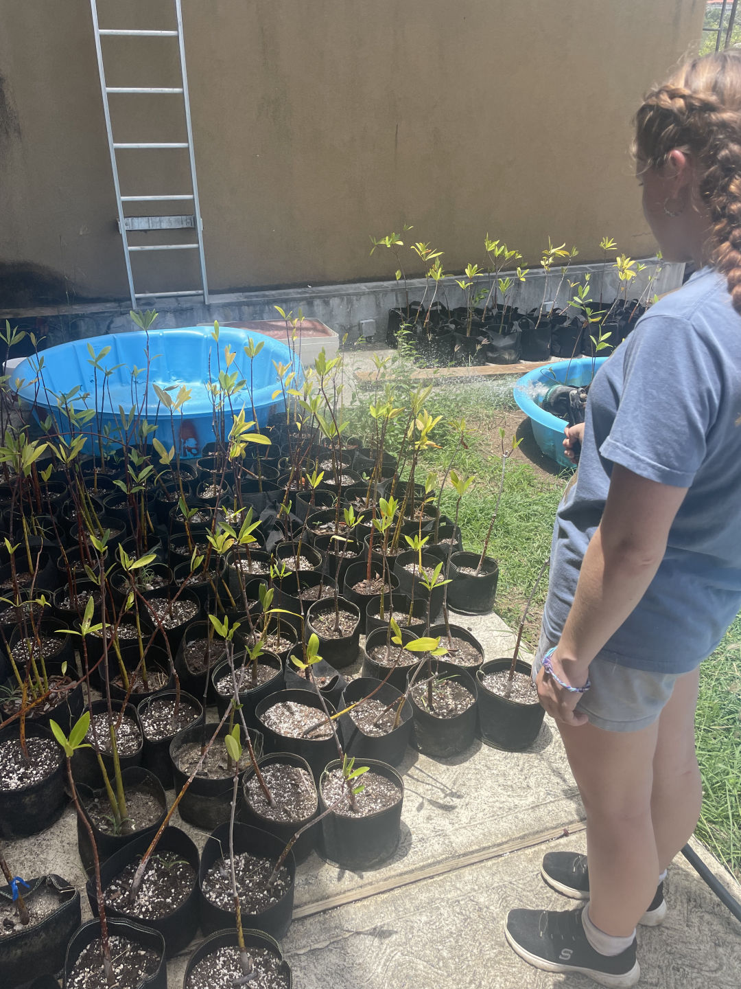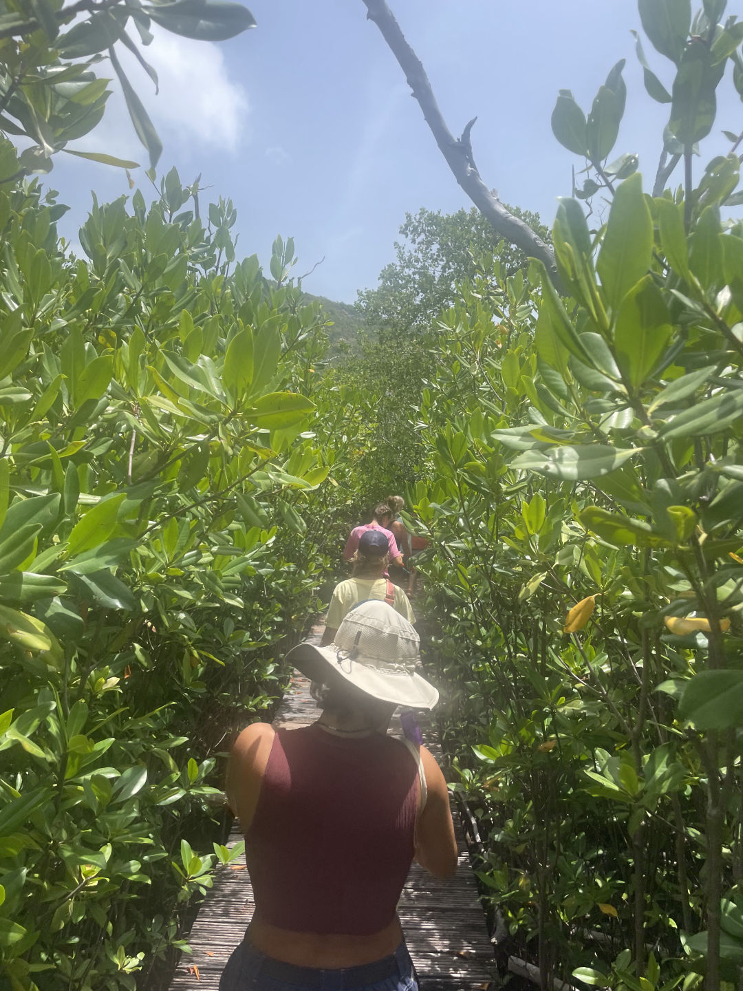 Waking up in Trellis Bay, I couldn’t help but sit on the roof admiring the view. We were surrounded by lush, green islands sprinkled with white mansions: an enchanting scene straight from a movie. As skipper of the day, it was my sorrowful duty to wake everyone up this morning at 7 to get to our service spot on time: the marine biology college. We had the most delicious fluffy pancakes prepared by Natalia, Olivia, and Emma. Fresh, crunchy starfruit from yesterday and sweet cantaloupe helped elevate the meal. Once we arrived, we were greeted by Nia, a highly knowledgeable young woman who gave us a presentation on the three main species of mangroves in the islands: red, black, and white, and a “cousin” named buttonwood. Everyone was fascinated and asked countless questions while soaking in the refreshing air conditioning. Nia and Susan guided us on a tour through the mangroves, pointing out their differentiating features, such as the shape of their leaves, pneumatophores, or roots that provided them oxygen. Nia explained the importance of the trees to the economy and wildlife and showed us how to know if the propagules were ready to be harvested.