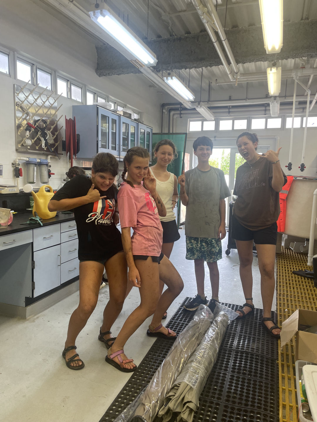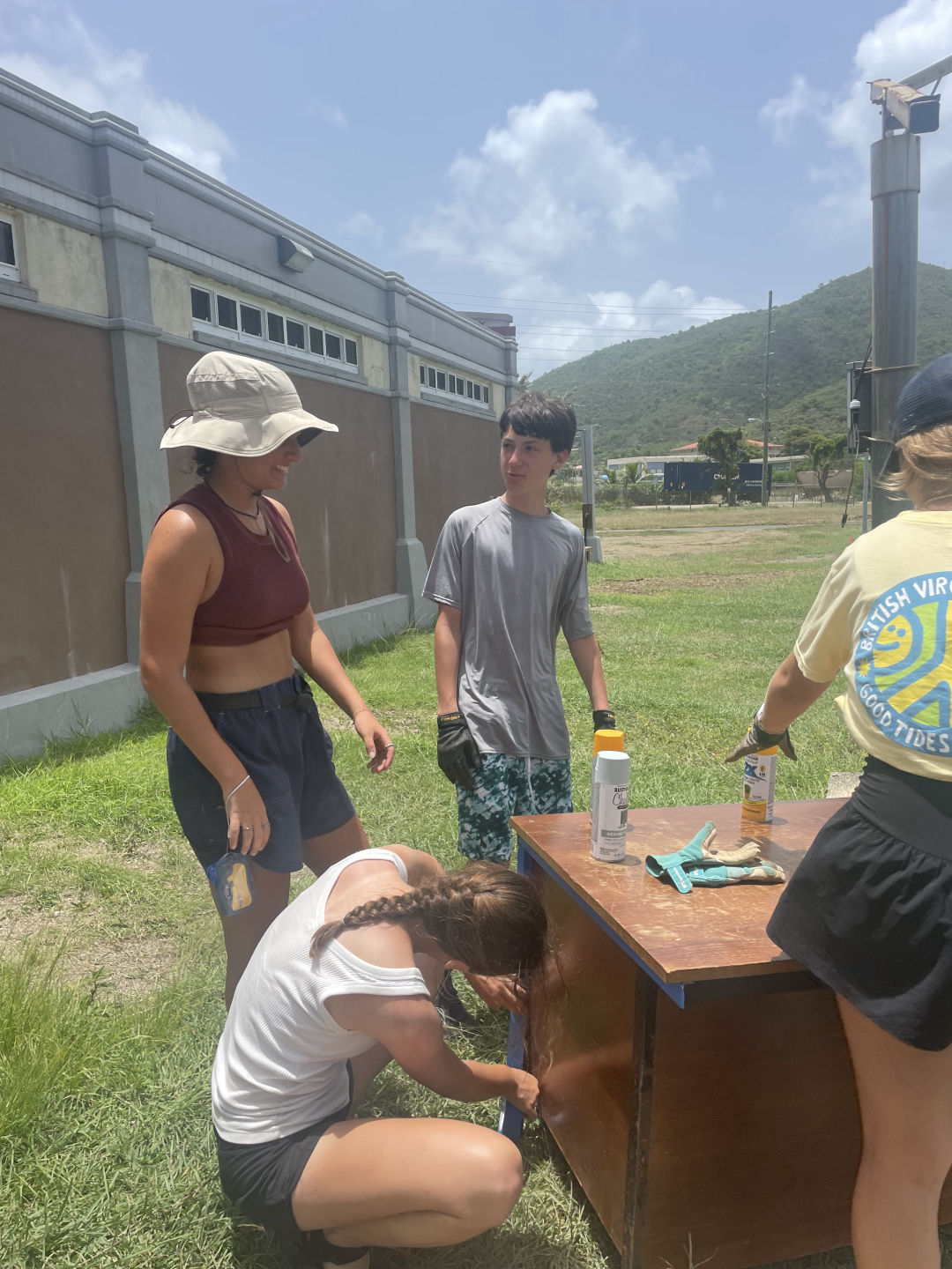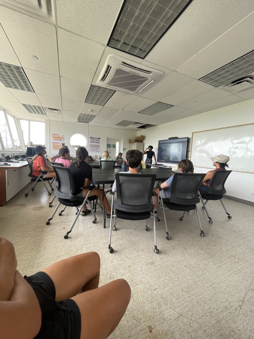 Waking up in Trellis Bay, I couldn’t help but sit on the roof admiring the view. We were surrounded by lush, green islands sprinkled with white mansions: an enchanting scene straight from a movie. As skipper of the day, it was my sorrowful duty to wake everyone up this morning at 7 to get to our service spot on time: the marine biology college. We had the most delicious fluffy pancakes prepared by Natalia, Olivia, and Emma. Fresh, crunchy starfruit from yesterday and sweet cantaloupe helped elevate the meal. Once we arrived, we were greeted by Nia, a highly knowledgeable young woman who gave us a presentation on the three main species of mangroves in the islands: red, black, and white, and a “cousin” named buttonwood. Everyone was fascinated and asked countless questions while soaking in the refreshing air conditioning. Nia and Susan guided us on a tour through the mangroves, pointing out their differentiating features, such as the shape of their leaves, pneumatophores, or roots that provided them oxygen. Nia explained the importance of the trees to the economy and wildlife and showed us how to know if the propagules were ready to be harvested.