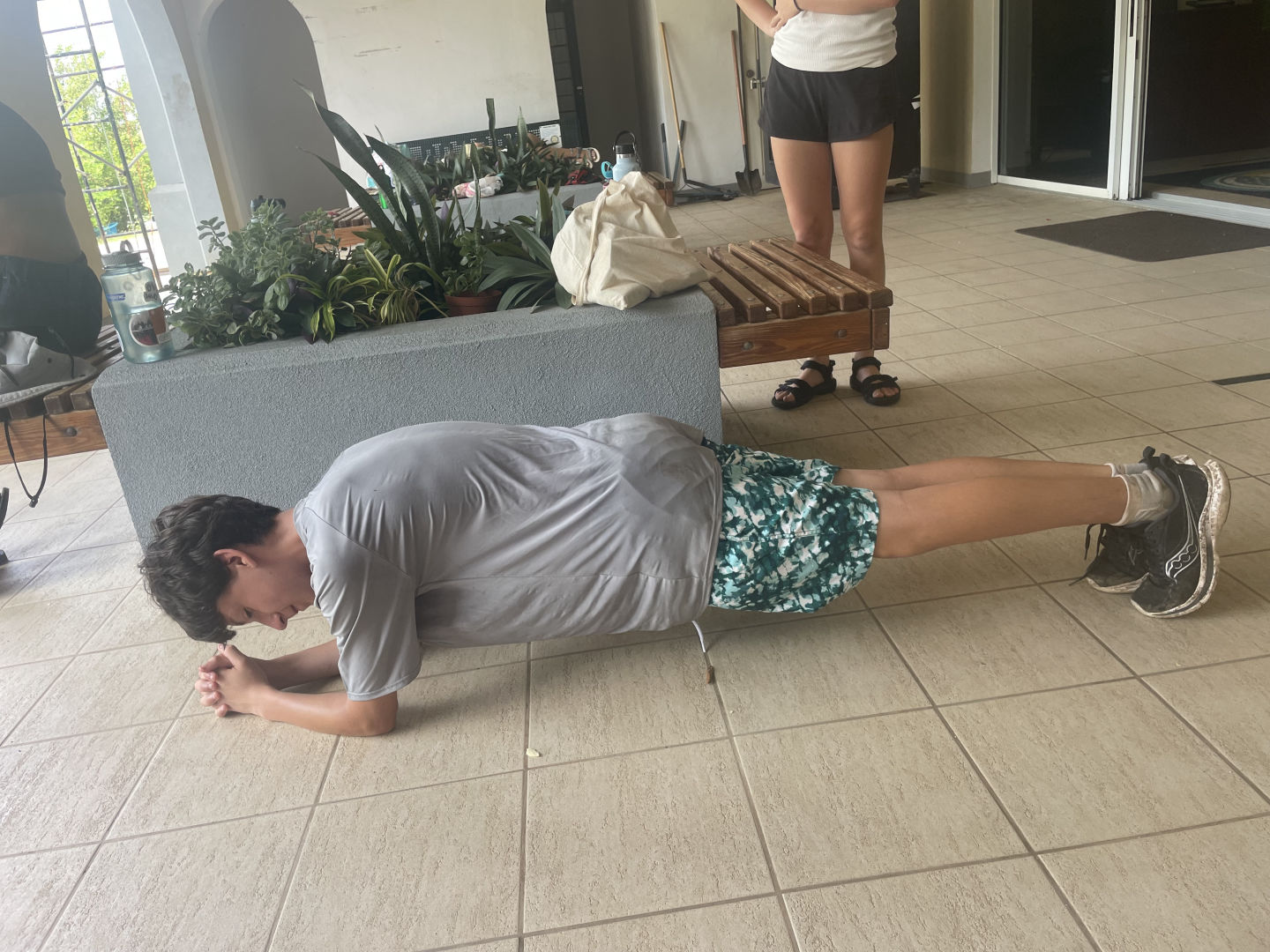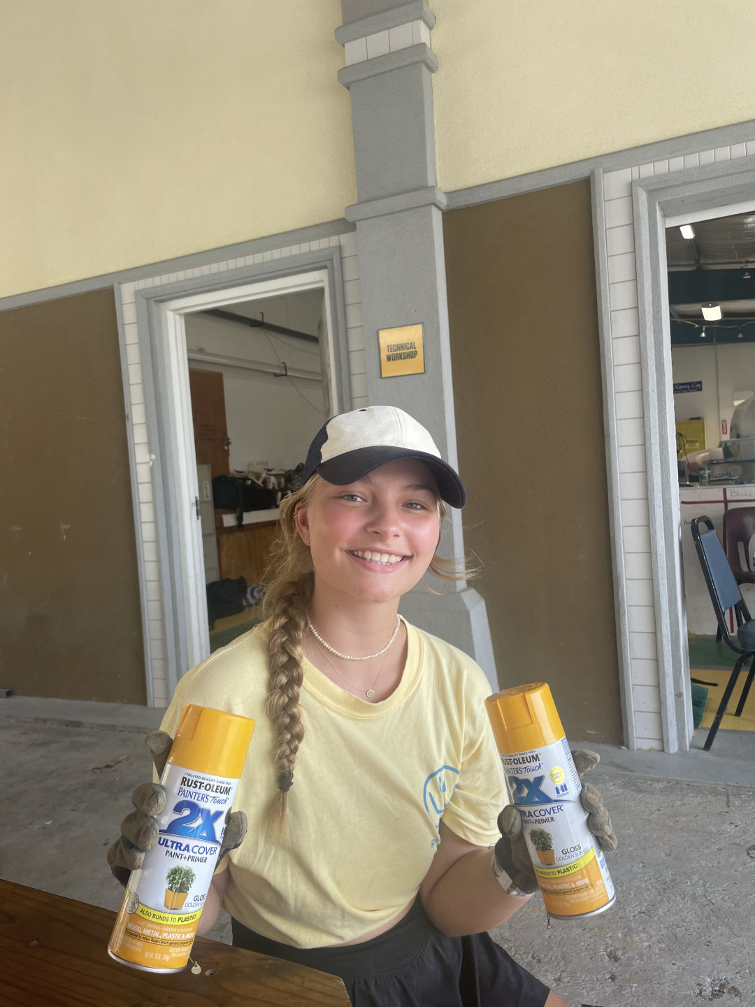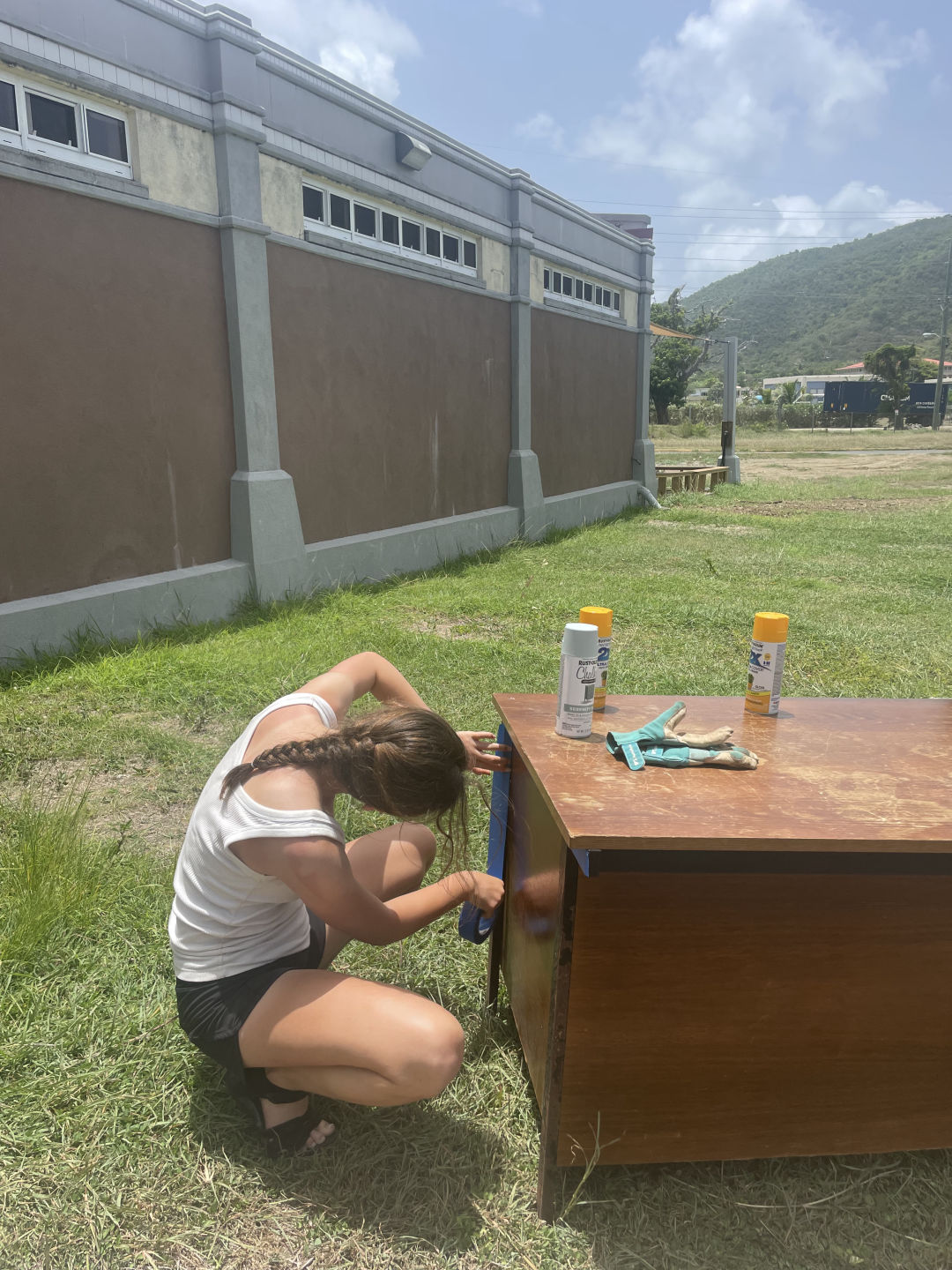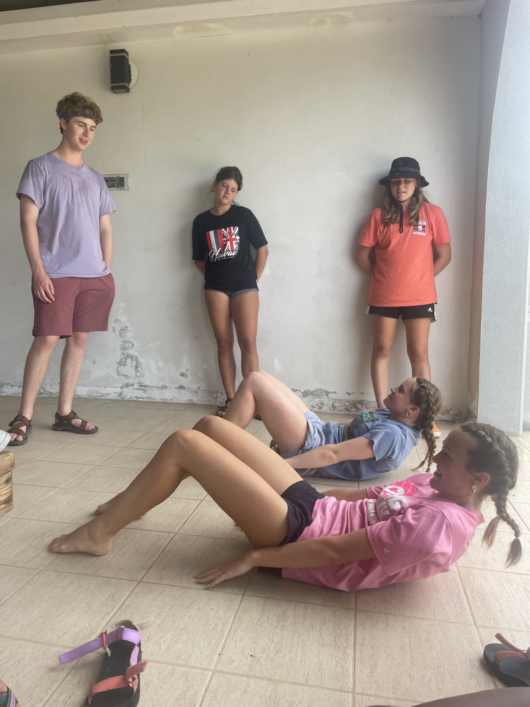 We then broke for a lunch of PBandJ sandwiches with the option of Nutella, a group favorite. All of us were fascinated by the vending machine, and some of us tried blueberry soda, and Lindsey found some old quarters for her collection. After lunch, we decided it would be an excellent idea to do a wall sit competition, which absolutely burned my legs in the best way possible. Natalia won, with Beth a close second. We decided to do a plank (Nate won), a sit-up, and a push-up competition. Susan offered us a huge platter of barbecue meatballs, which we absolutely ravaged. We then broke up into groups by our numbers. Sadie, Nate, Mariana, and I went with Susan to paint a desk and a mysterious yellow object. Luke, Olivia, Sophia, and Rory painted a crate for a fire stimulation to be used by the students. Melina, Natalia, Emma, and Stella mixed up soil for further mangrove planting, stirring up dirt in huge bins. In the last hour, we all moved to the boardwalk by the mangroves to scrape barnacles off the buckets and weed the area. We had some free time afterward to visit the local shops and relax before heading back to the boat. We enjoyed chili and rice prepared by Luke and Natalia with a side of diced bell peppers and onions. To end the night, we took a quiz where we learned about the different leadership personalities. The color red meant your leadership style was logical, realistic, and analytical. Yellow was someone who led by example, often seen as reliable. Green personalities were the friendly, social types who liked building relationships within their groups. We had very few blues: dreamers who focused on the big picture. We ended the night with Luke playing some music on his kalimba before heading to bed. Love you, Mom and Dad!