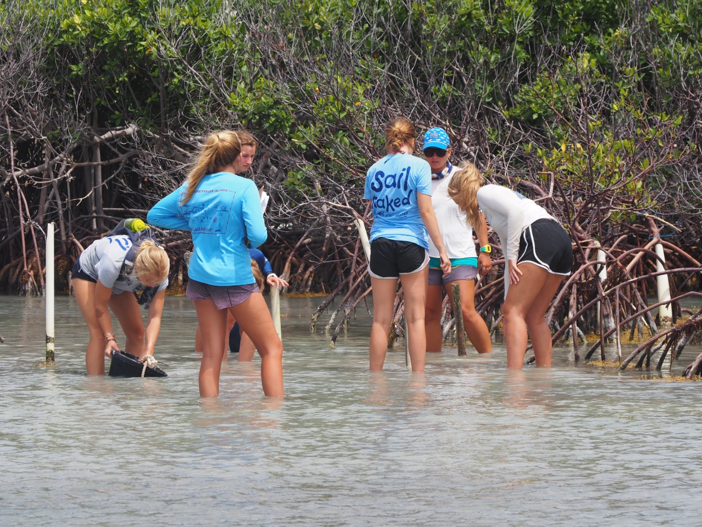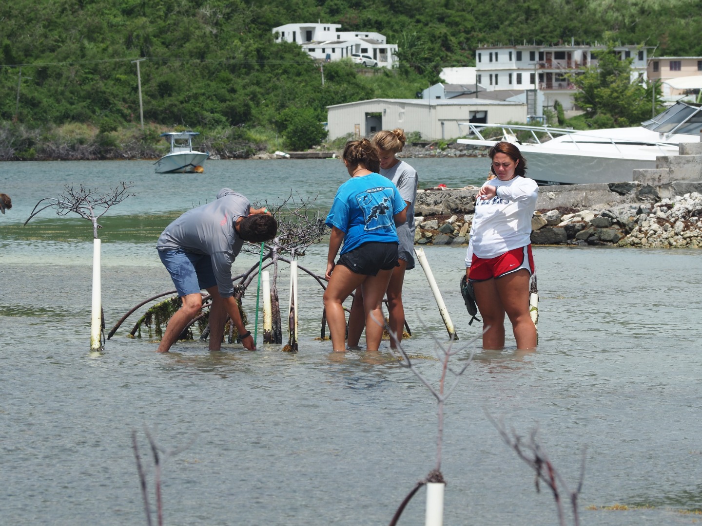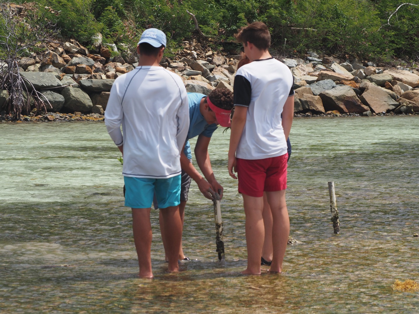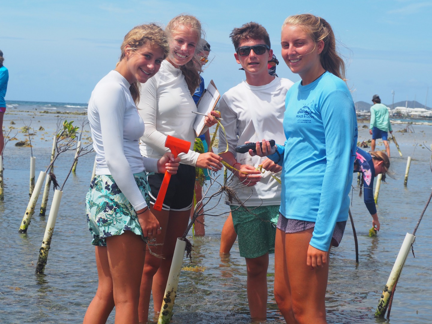 Today our boat went to Sea Cow Bay which is in Tortola. Then, we anchored and dinghied over to the mangrove site where we counted the pipes that were currently housing those plants. Then, we pulled the dead mangroves up and planted propagules. These were collected in Anegada, wherein our free time when we were tagging turtles. They fall off the mangroves as seeds and float. This is called a viviparous plant. After we finished, we sailed over to Road Town. It is the most industrialized area that we have been to. Here, we had shore time. There was a large grocery store where Darius bought a crate of Ting. Ting is a popular drink in the Caribbean that our whole boat is obsessed with so we all got to indulge when we got back to the boat. We then ate dinner and had a chill rest of our night.