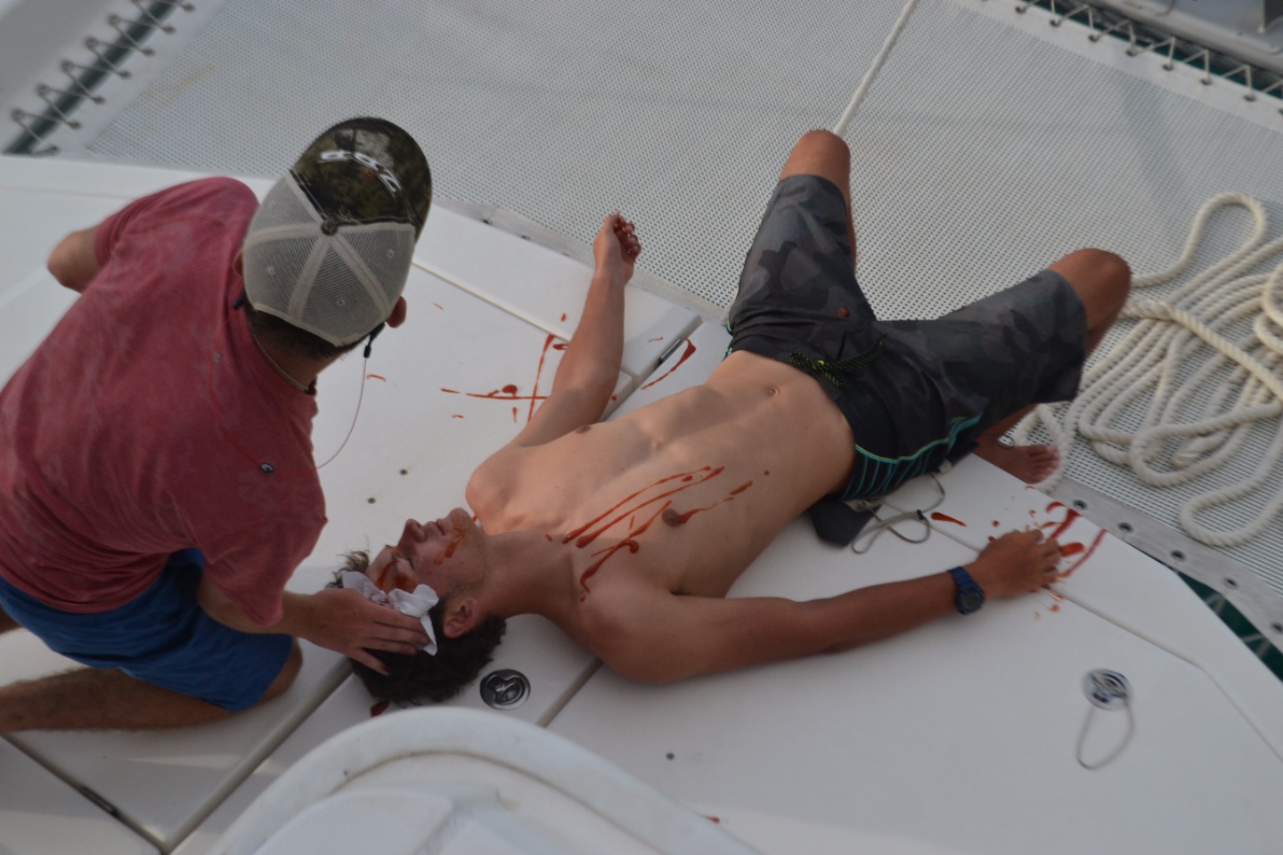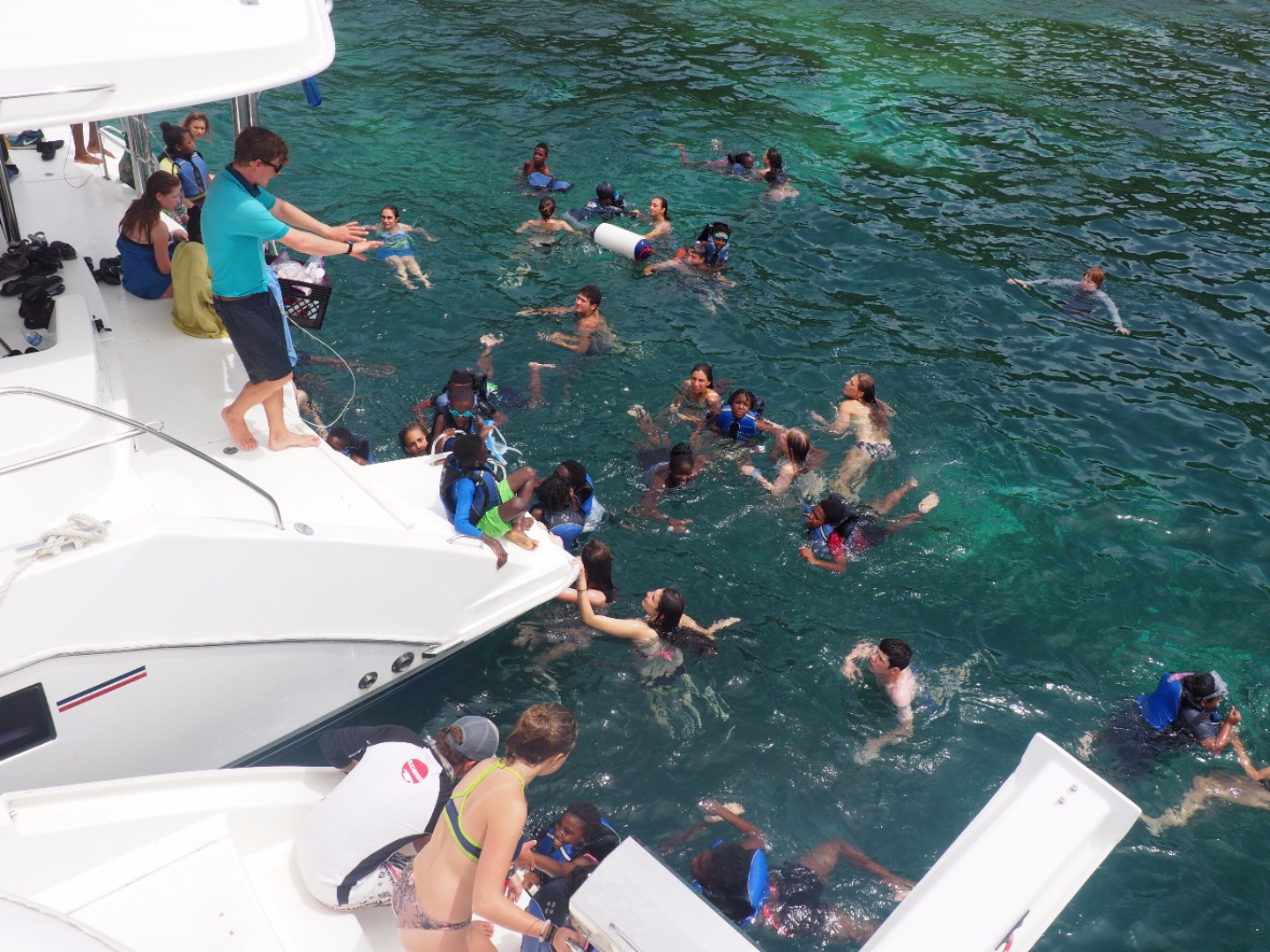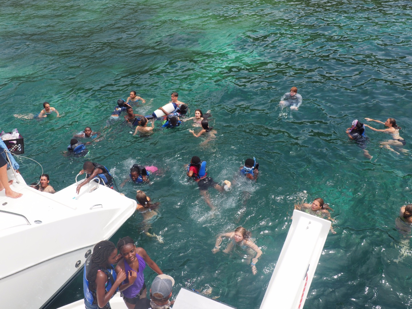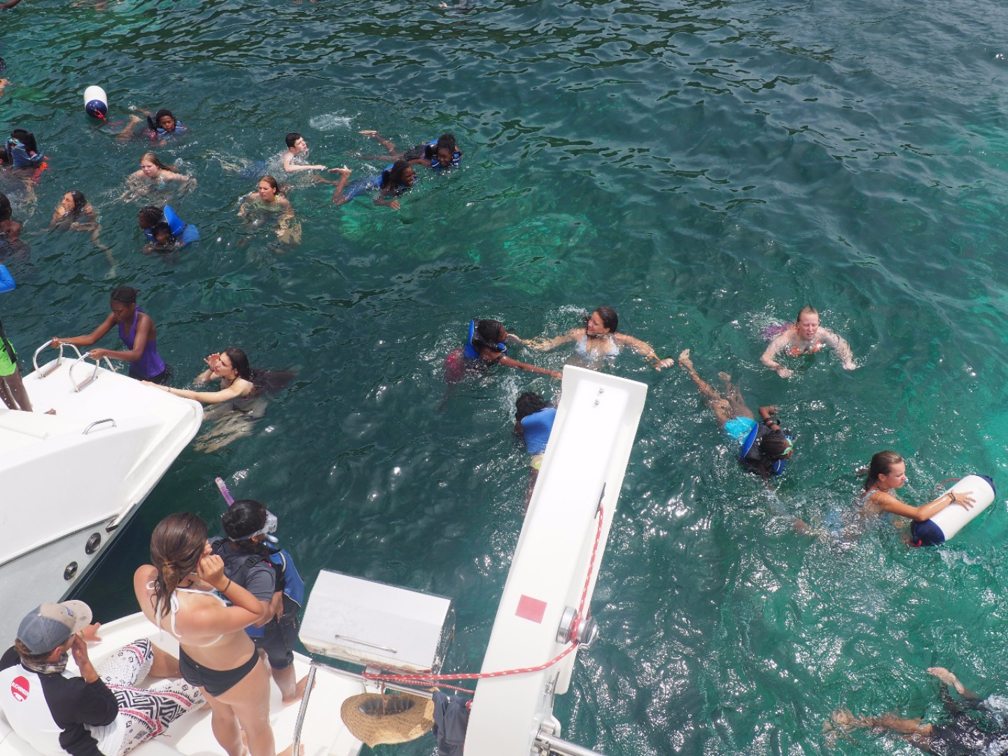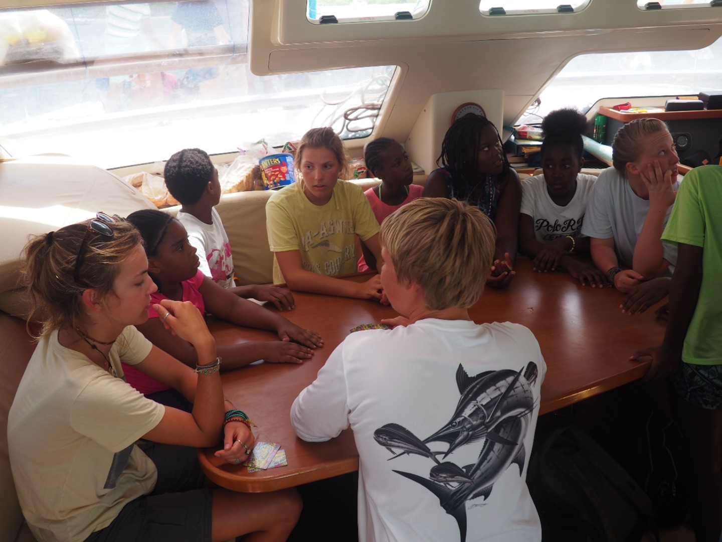 We woke up today to the delicious smell of scrambled eggs, peppers, and freshly cut tomatoes. We all got up from a great nights sleep and went straight to motoring over to Trellis Bay. After searching and successful looking for a mooring ball, we brought the dinghies to land. While on land, we were lucky enough to pick up some school children who are part of the organization YEP (Youth Empowerment Program). Once the children arrived on the boat, we started to join and make groups with them. Some of them where in the same grades as us, or we had shared interests with them. We motored over to Cam Bay, which is on Great Camanoe to help to clean up the beach. We had to note down each piece of plastic that we found before we could collect it. This information is going to be given to (Insert Organization Name). They work to help understand what happens with recycled plastics and more specifically, where they will turn up. Once finished with that we all had a bit of a swim off the back of the boat. Sadly, the short time that we had with our new friends had to come to an end. We turned back and motored to Trellis Bay, where once the kids were dropped off, we on the Go Beyond trip got to have some shore time. We got to go and visit the studio of Aragorn. He is a locally famous artist whose artwork is featured on islands such as Necker Island (Richard Branson’s Island). Once we had restocked all of our candy and potatoes chips that we had eaten in the last couple of days, we dinghied back onto the boat. Once we put away all of our sugary snacks and drinks, we got underway to get to Sommer’s Beach. Once we had arrived over at Sommer’s Beach, we started to do a V.I.S.A.R. Simulation. V.I.S.A.R, which stands for Virgin Island Search and Rescue, is a service that consists of all volunteer service men and women except for one permanent worker. Our simulation consisted of Griffin, a student on the other Go Beyond boat faking a head injury, and then V.I.S.A.R. coming over and attempting to save him and bring him to safety. After the simulation ended, we got to go on a joyride in there almost 500 horsepower super dinghy. After V.I.S.A.R. gave us all a talk on how they operate in the BVI, and some of the A.V.I, we got to go and eat and a beach barbecue with the rest of the Action Quest and Go Beyond members. We got to munch on burgers and pineapple punch before we got drenched on with rain. Tomorrow we hope for some better weather.