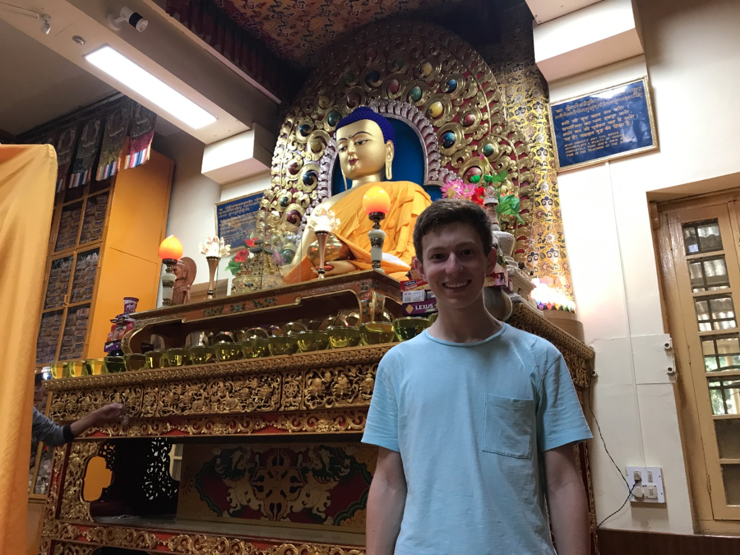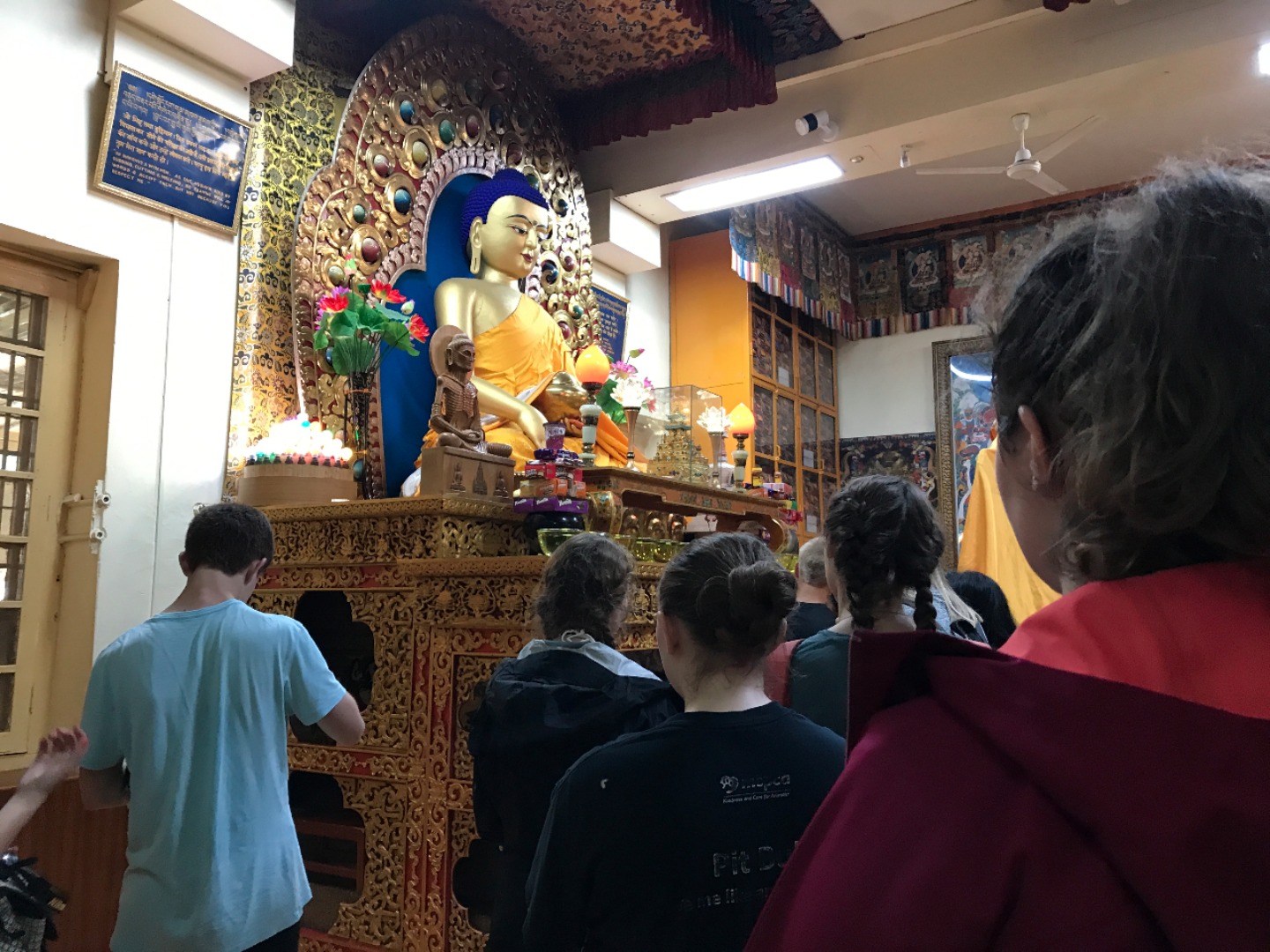 Today was another fun day packed with travel and adventure. After navigating the chaos of the New Delhi airport, we were lucky to enter the serenity of northern India’s McLeod Ganj. As we stepped off the plane, many of us were surprised at how different the natural environment was from that of Delhi. The whole Dharamsala area is engulfed in lush, green mountains, and the weather is much more temperate than the summer heat of Delhi. We settled in at our guesthouse and enjoyed a tour of Tsuklakhang, a complex containing both the home and temple of His Holiness the Dalai Lama. We got to walk all around the temple, viewing the beautifully adorned rooms where the Dalai Lama gives teachings and where Tibetan monks assemble. Rabsel, who used to be a monk in Tibet, was able to give us a lot of background on what we saw so that we could better understand it. Thus, we began to understand some of the basic principles of Tibetan Buddhism and its view of human suffering and how we can make each work to make the world a better place.
