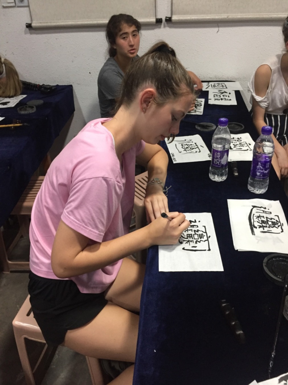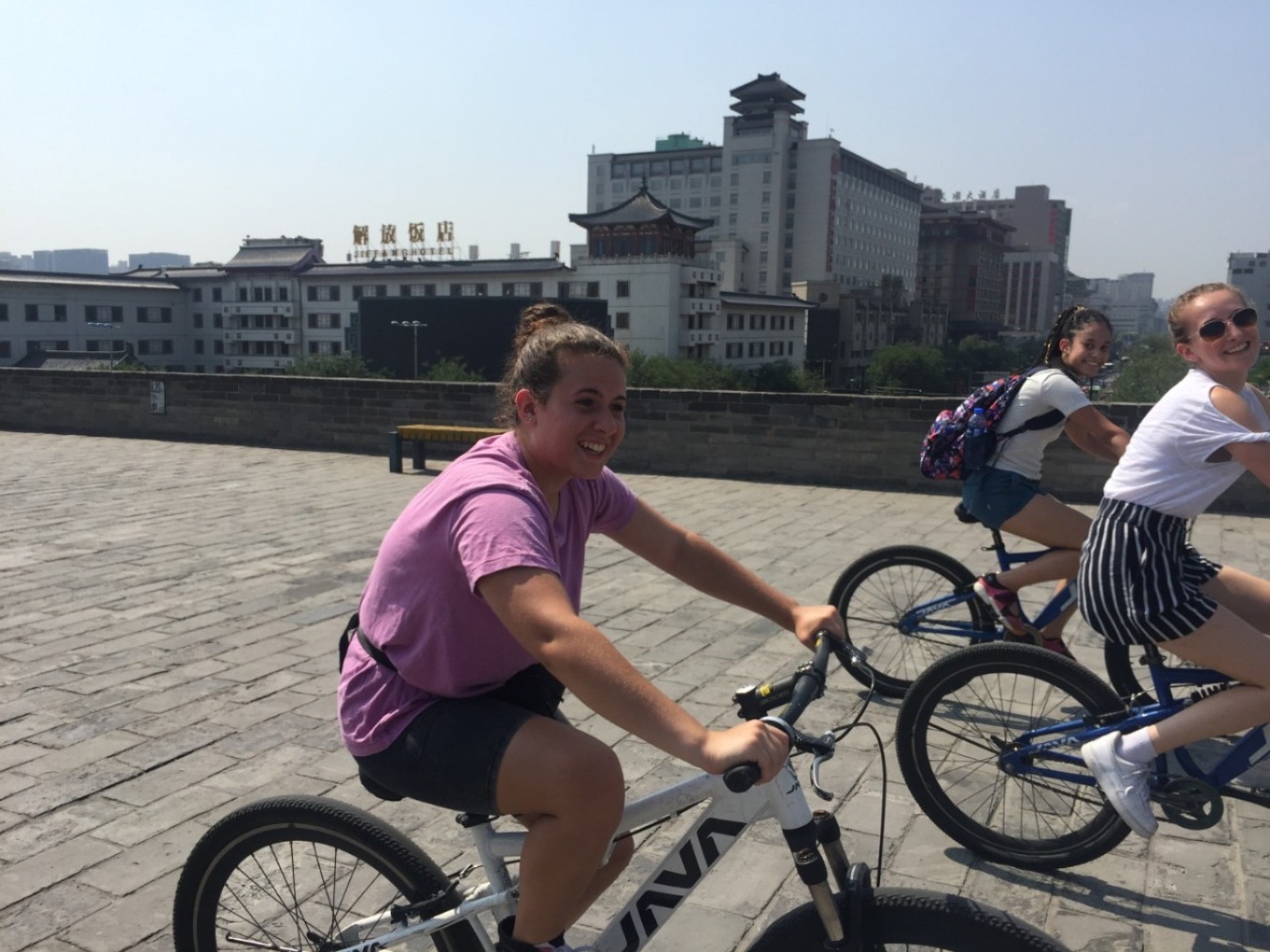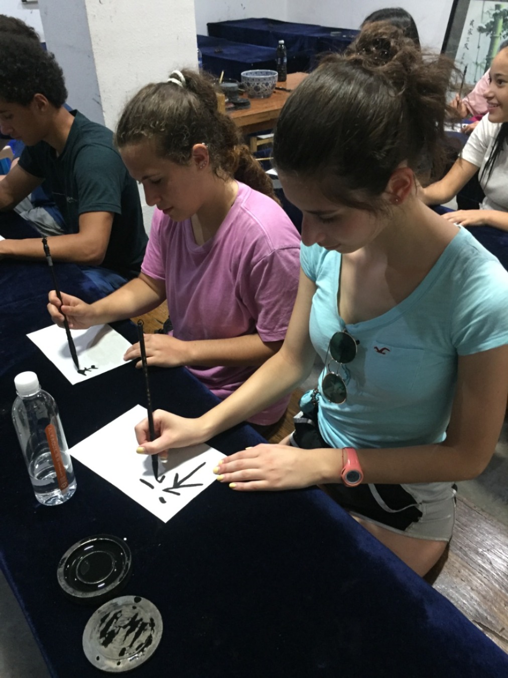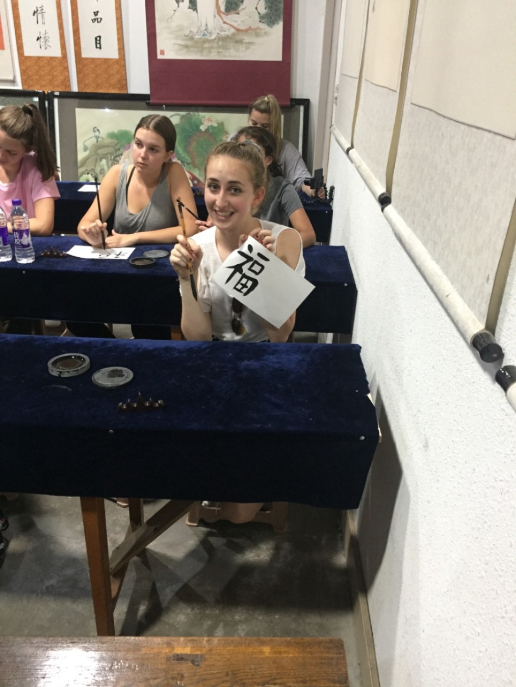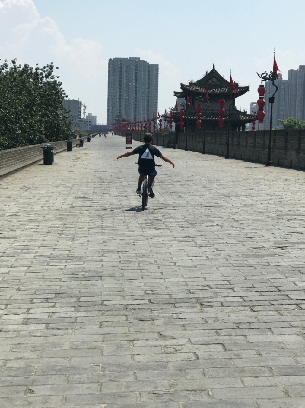 We woke up after an overnight train, and even though I didn’t get a whole lot of sleep, the rest of the group said they slept fine. Then we got to settle into the hotel for 2 hours and ate breakfast. After that, we went to go bike around the Xi’an City Wall. Some biked the whole distance, some biked halfway, and some only biked for a few minutes before heading back due to the 100-degree weather. After that, we did some calligraphy with a very nice man, and all I have to say is that it was very hard and much respect to anyone who can actually do that. Since I struggled way too much with the calligraphy, the world was instead blessed with my dear creation Bird Man (Evan will insert a photo somewhere of my drawing). After that, we went to Muslim street where we all bargained and collected many fake designer items or just cool small trinkets. I think I can safely say that most of us are bargaining EXPERTS. We scavenged for our own dinners there and explored a mall for a little. It was an eventful day, and I am ready to go to sleep, so I am ending this now. Goodnight.- – – – – – – – – – – – – – – – – – – – – – – – – – – – – – – – – – – – – – – – – – – – – – – – – – – – – – – – – – – – – – – – – – – – – – – – – – – – – – – – – – – – – – – – – – – – – – – – – – – – – – – – – – – – – – – – – – – -Here are some fun facts provided to you by Jake: Population Density inside walls — 4x Manhattan Population Density total city — 50x less than Manhattan population total city size — 7000 km^2City size inside wall — 5km^2Population inside city walls, 3 million population outside city walls, 9 million***Only city wall fully intact from one end all the way around the other in the entirety of China***