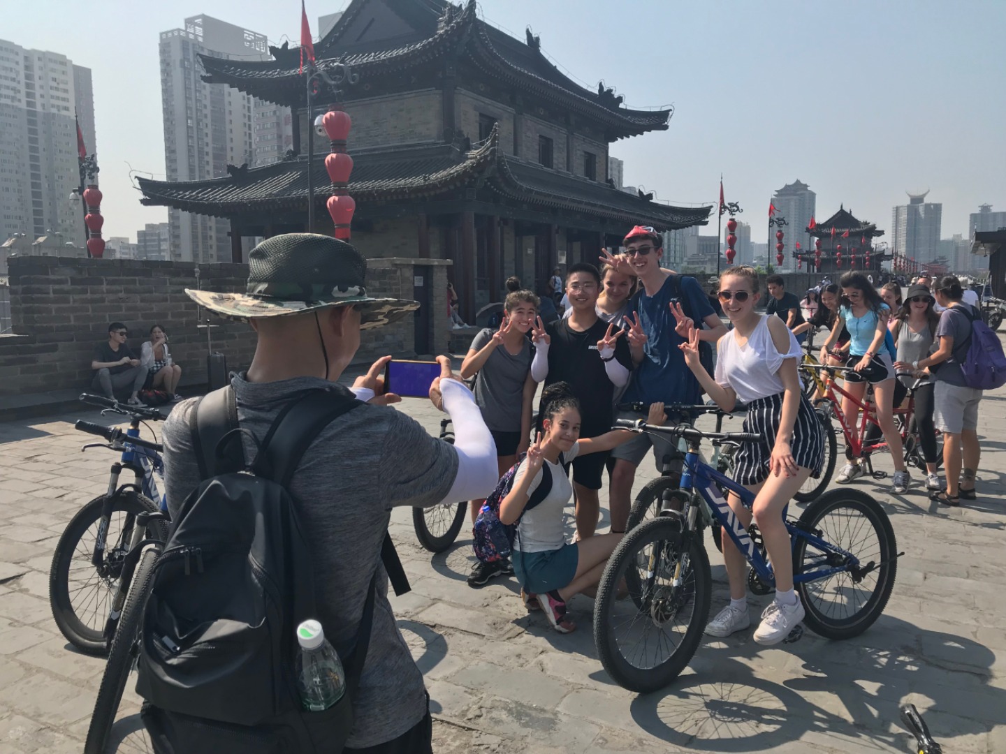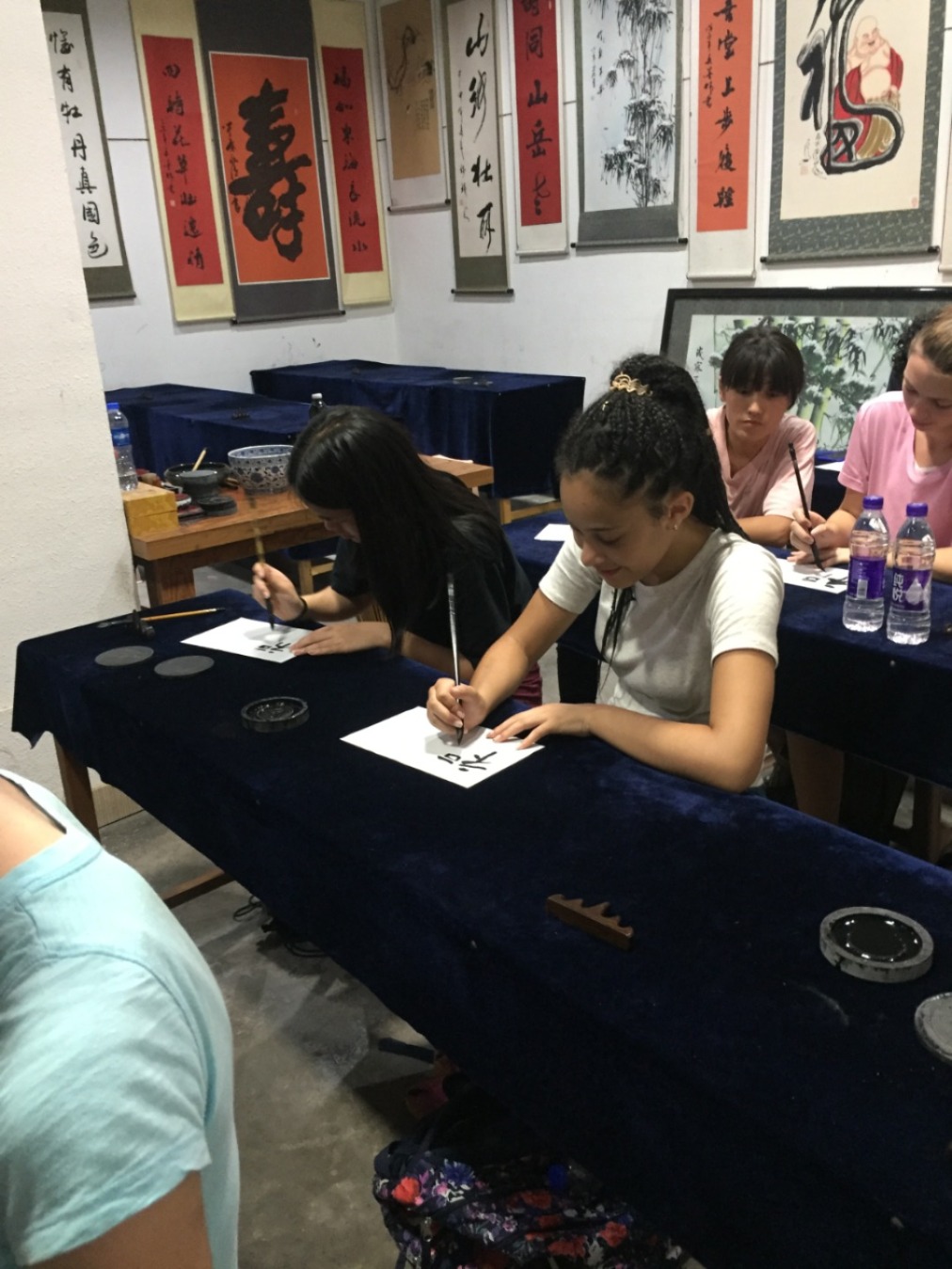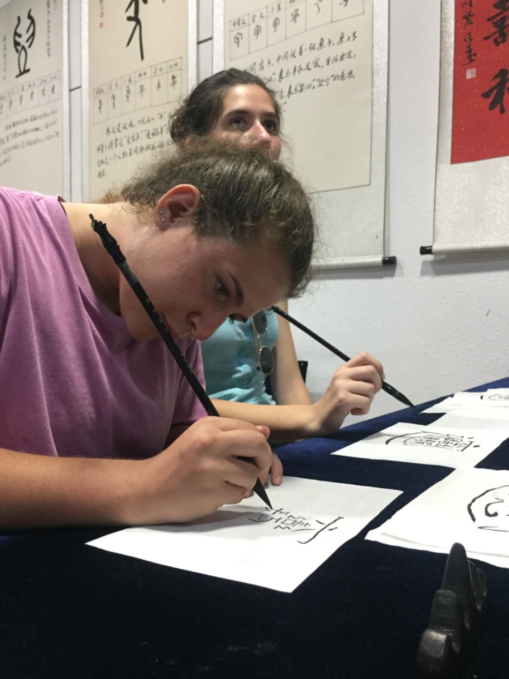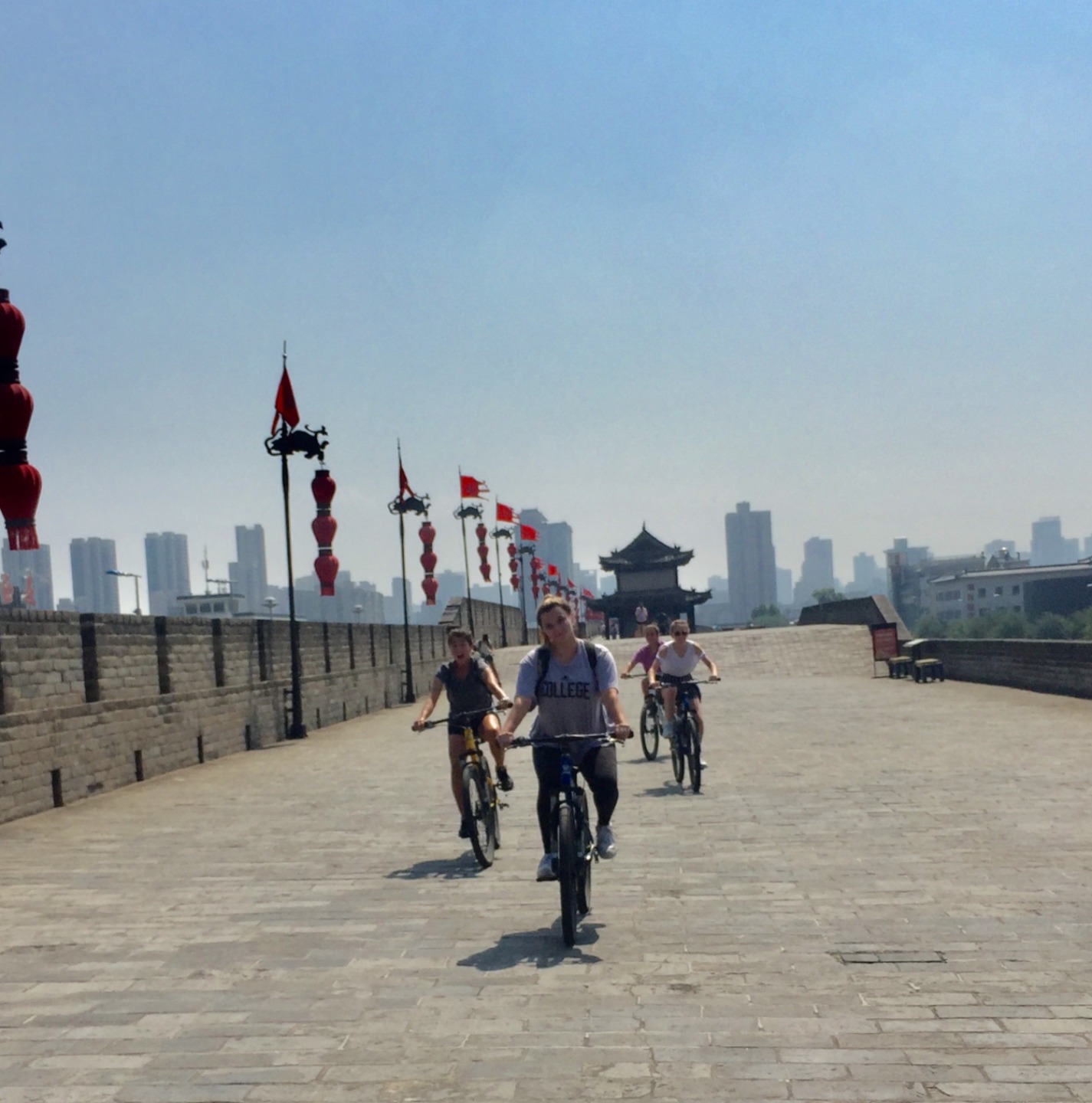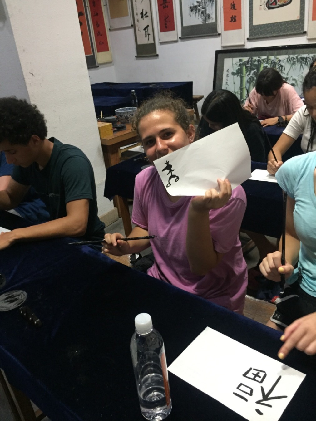 We woke up after an overnight train, and even though I didn’t get a whole lot of sleep, the rest of the group said they slept fine. Then we got to settle into the hotel for 2 hours and ate breakfast. After that, we went to go bike around the Xi’an City Wall. Some biked the whole distance, some biked halfway, and some only biked for a few minutes before heading back due to the 100-degree weather. After that, we did some calligraphy with a very nice man, and all I have to say is that it was very hard and much respect to anyone who can actually do that. Since I struggled way too much with the calligraphy, the world was instead blessed with my dear creation Bird Man (Evan will insert a photo somewhere of my drawing). After that, we went to Muslim street where we all bargained and collected many fake designer items or just cool small trinkets. I think I can safely say that most of us are bargaining EXPERTS. We scavenged for our own dinners there and explored a mall for a little. It was an eventful day, and I am ready to go to sleep, so I am ending this now. Goodnight.- – – – – – – – – – – – – – – – – – – – – – – – – – – – – – – – – – – – – – – – – – – – – – – – – – – – – – – – – – – – – – – – – – – – – – – – – – – – – – – – – – – – – – – – – – – – – – – – – – – – – – – – – – – – – – – – – – – -Here are some fun facts provided to you by Jake: Population Density inside walls — 4x Manhattan Population Density total city — 50x less than Manhattan population total city size — 7000 km^2City size inside wall — 5km^2Population inside city walls, 3 million population outside city walls, 9 million***Only city wall fully intact from one end all the way around the other in the entirety of China***