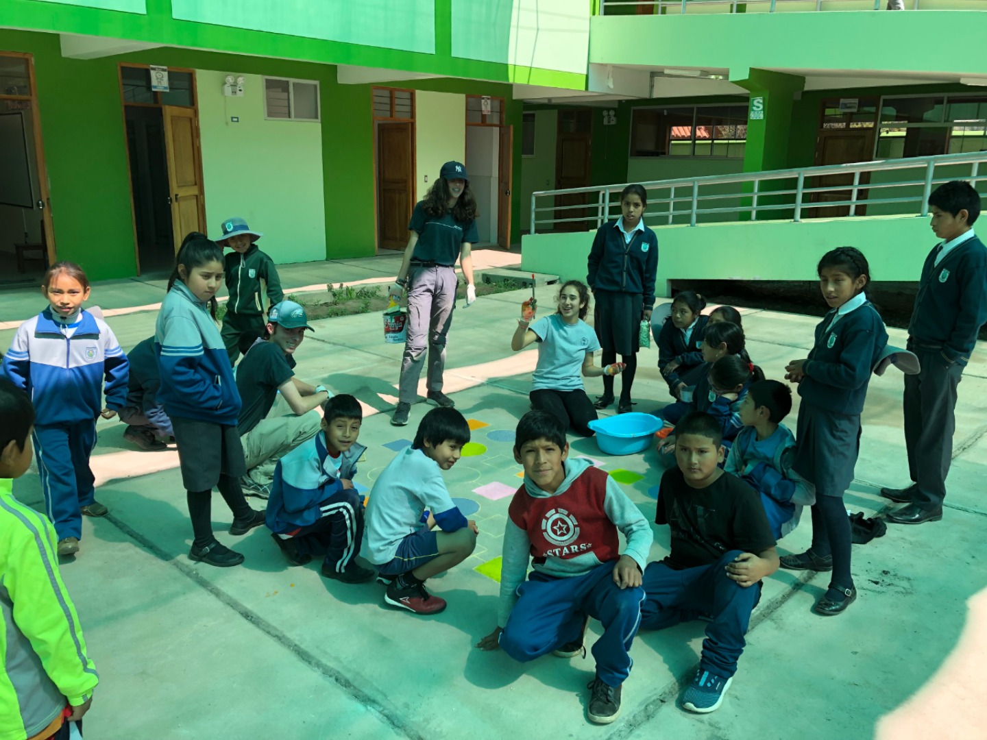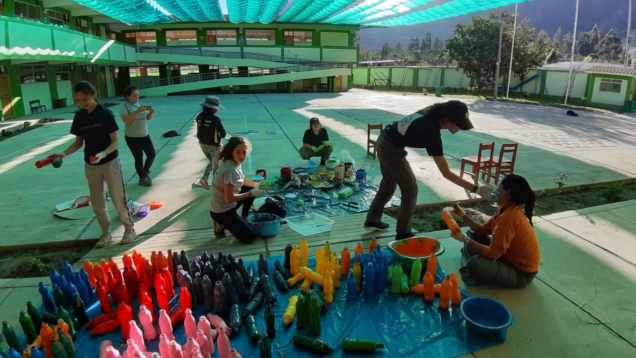 The first of July took our GoBeyond group deeper into the sacred valley to a local school in Huayllabamba. We worked with small help Peru to paint hopscotch, twister, and other games to promote learning the alphabet and numbers on the school’s courtyard. Wesley and Abby(myself) worked on twister, David, Lara, and Sienna painted the Spanish alphabet on the courtyard to help the younger students with learning, and Emilio and Bella started painting a large snake with numbers of 1-63 and the rest of us helped finish up the snake when we were done with our own projects. When we finished painting areas of the courtyard, we moved on to painting old water bottles as a project to reuse them and using them to beautify the schools garden. During the day, all of us got a chance to rotate working with playing with the school kids. We played soccer and telephone with the children in the beautiful field surrounded by Andean mountains. All in all, today was a great day!