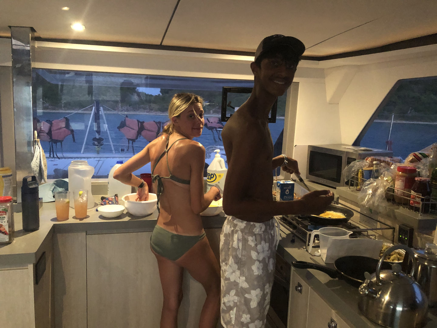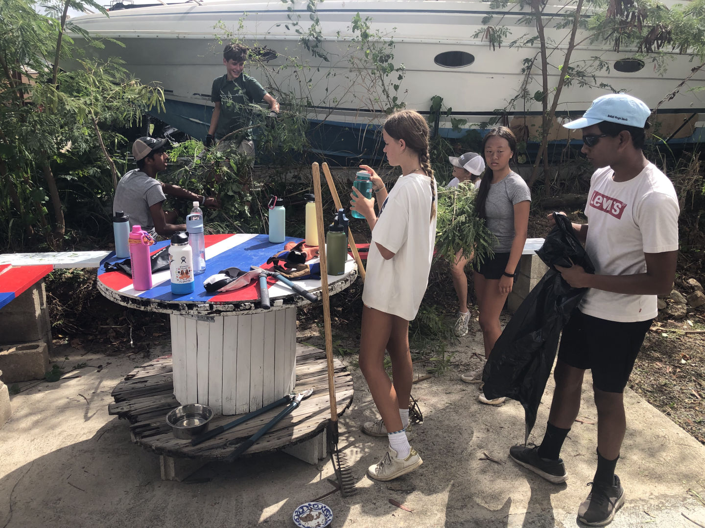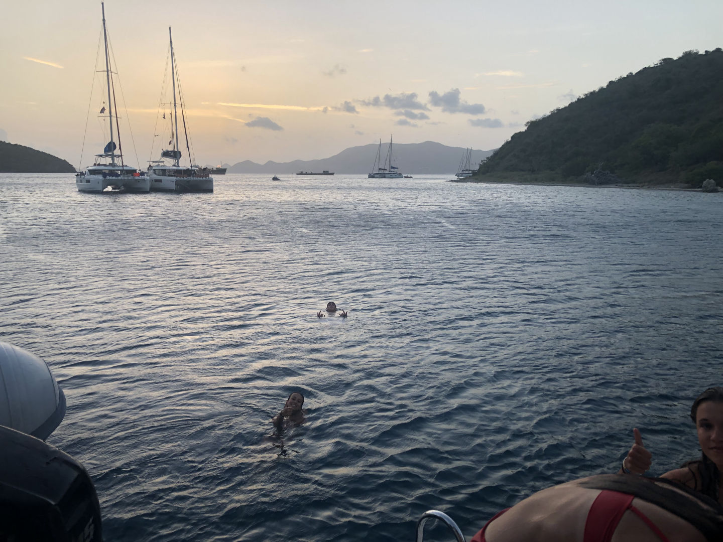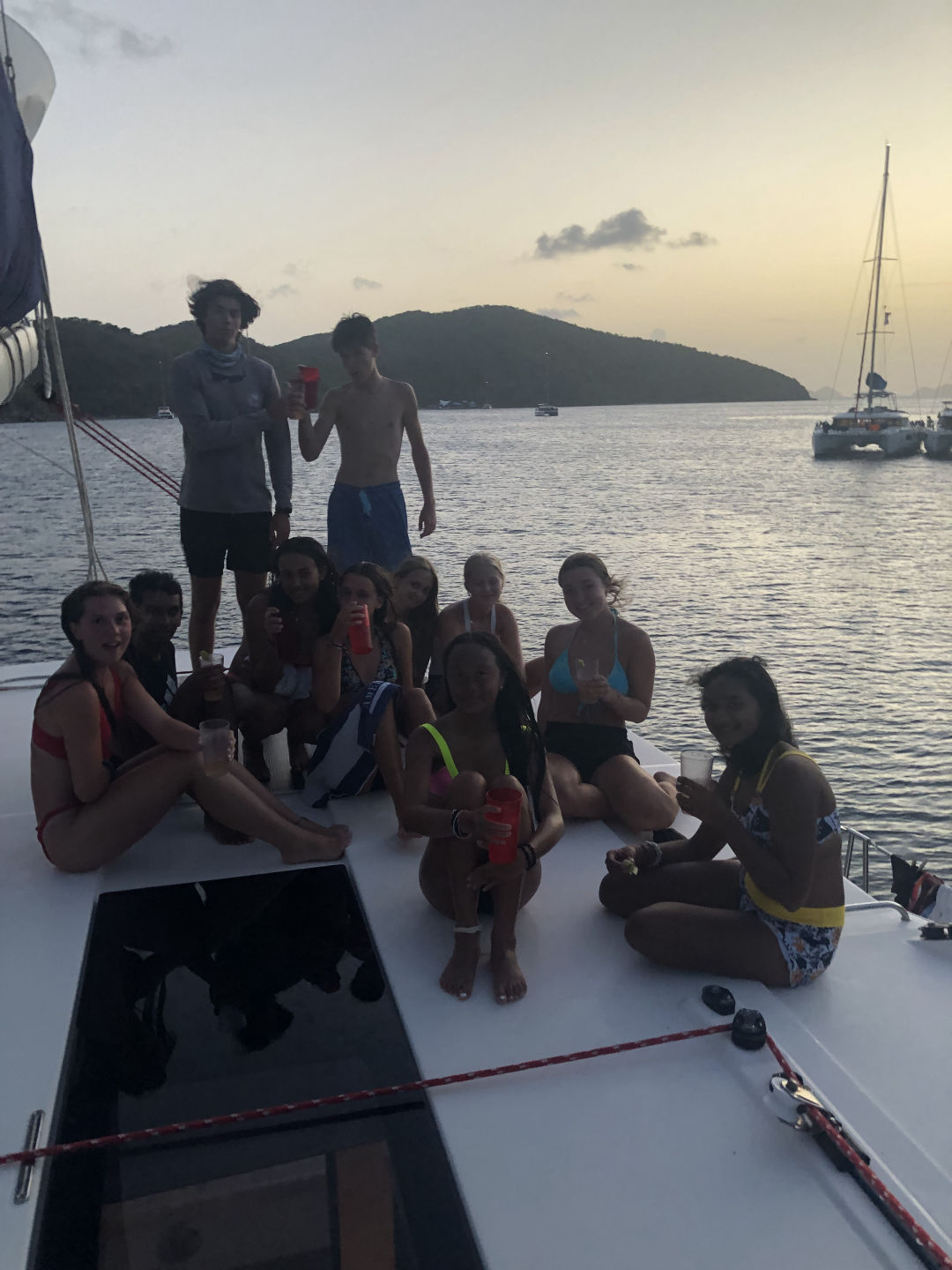 Today, we all woke up and felt really refreshed because Krisz had turned the air conditioning on. Everyone slept really well except for Manola, who took one for the team and slept on the floor. After we ate breakfast, we went to the Virgin Islands Search and Rescue (VISAR). When we first arrived, we started gardening. Most of us were picking at the small weeds while Wil and Rishi were cutting down all the trees. After we had gardened, we had to decide our devious plan for tomorrow to train the volunteers for situations in the future. After we got back to the boat, we ate grilled cheese, peanut butter, and jelly sandwiches, and some of us bought lunch. When we finished eating, we went to the pool and shopping, and at least half of the boat bought the BVI sailing team shirt because it’s super cute. After swimming and shopping, we went back to the boat and had to wait an extra hour to start moving because we had to wait for Riley. While sailing, we traded snacks and listened to absolute bops while Talula was throwing up in the bathroom for a solid two hours. After arriving, we got to talk to another boat, which we never do. Then we took our ocean shower and enjoyed Arnold Palmer while watching the sunset. Margaux and Rishi cooked us an amazing meal for dinner even though they used all of the dishes, so dishy pit was really long. After cleaning up after dinner, Wil caught a crab. We ended the night talking on the boat, and we are all really excited for tomorrow and to be back home in 3 days!!!