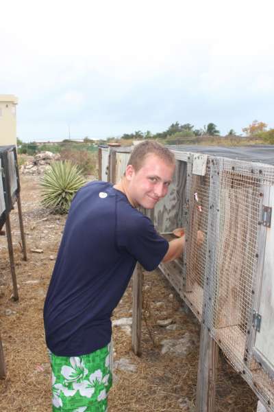 Everyone was a little slow getting up at 6:30 this morning, but we had lots to do and a tight schedule, so I rallied everyone out of their beds. Eggs and blueberry muffins were enough to get everyone to shake off their sleepiness and prepare for a long today. First, we gathered all of the equipment we needed and piled into Smoke and Hot Pocket. After a short, bouncy ride in the cab, we arrived at the Anegada Rock Iguana Rehabilitation Center. We started by tending to the small endangered creatures that Kelly, the herpetologist, helps maintain. We started by cleaning the young iguanas’ food and water dishes, and then refilled them.