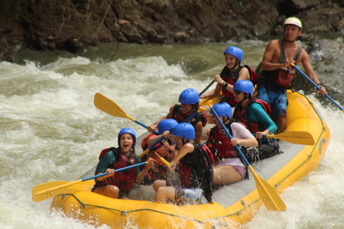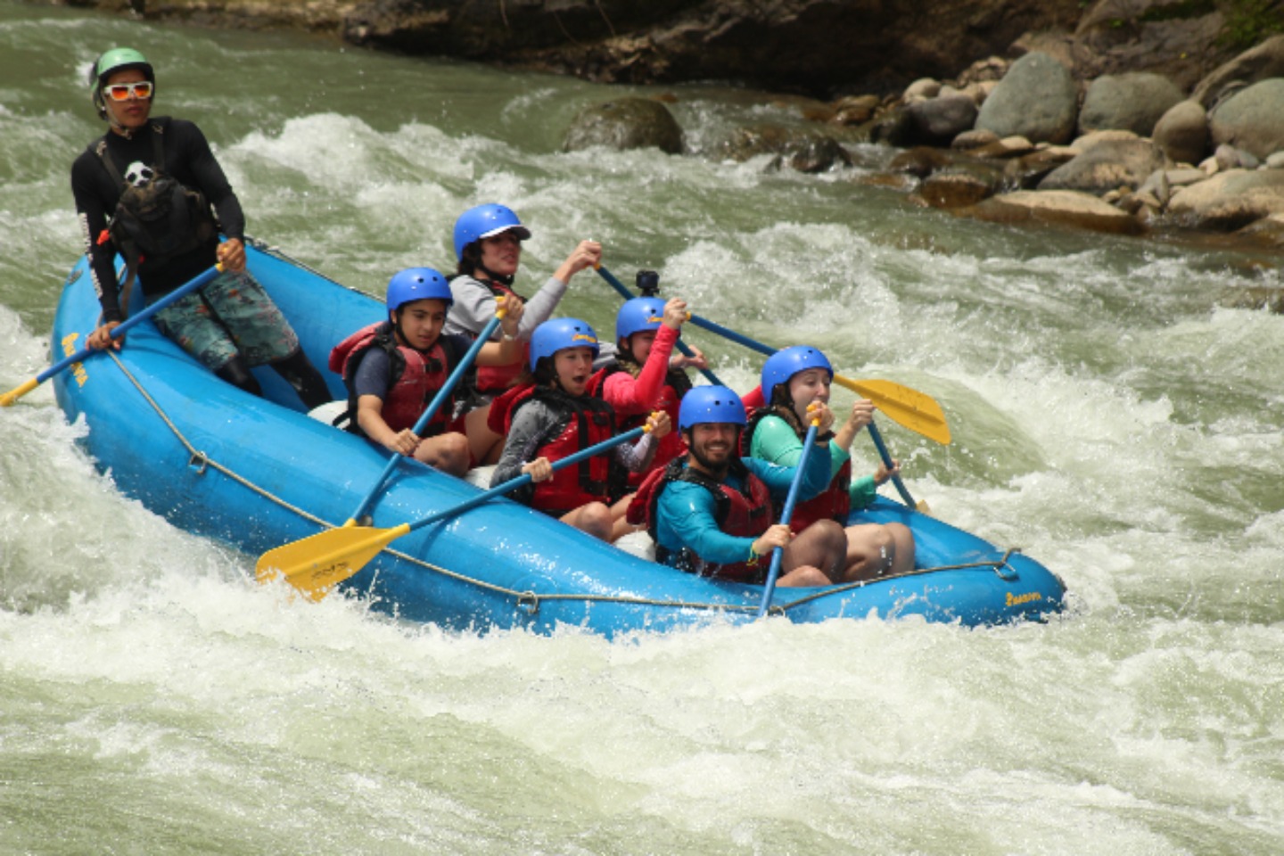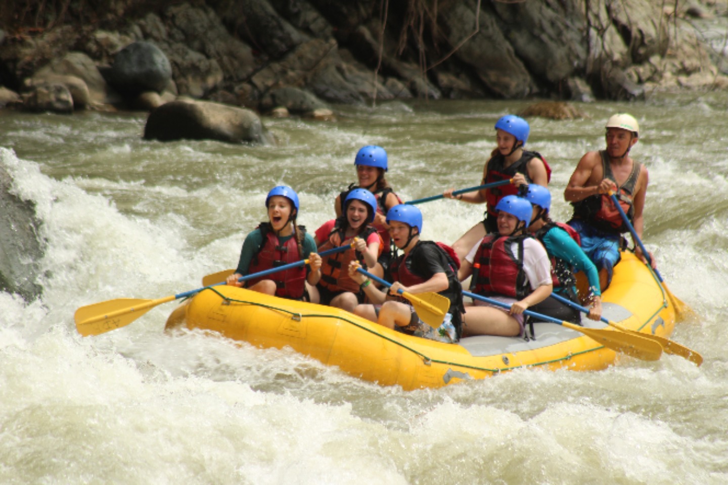 Our group briefly met in the lobby of the hotel, before loading up on our assigned bus. This is where our adventure started. After a quick breakfast and briefing, we were back on the bus and on our way to the river on which we would put in. We made our way up winding dirt roads, through rivers, and over hills. On the way to the river, the bus was relativity quiet. Everyone was soaking in our surroundings. Soon we were on the river. We were briefed about the risks of the river and were reminded of the basics of rafting. “Enough to survive today,” in the guide’s words. Then we were off. The rapids came one after another, moving our boat any way they pleased. The guide would scream paddle and positioning commands, turning us to hit the wave head-on. We all were having a great time. Around 20 rapids later, we made it to our halfway point. We all hopped off the rafts, eager to stretch our legs. In the distance, we could see a waterfall. This is where we would have a check-in and eat snacks. After five minutes of walking, we made it to the waterfall. There was a thick mist in the air, and all that could be heard was the roar of thousands of gallons of water hitting the rocks. After a couple of minutes of admiring the waterfall, we made our way down the mossy, slippery rocks and around the waterfall to take pictures. It was a highlight of the trip. Soon it was time to get back on the boats. Twenty minutes later we had paddled through the last rapid. We were all sad that we had to go, but the group was exhausted. Climbing onto the bus, we said our last goodbyes to the guides and started our journey home. It was an exciting, action-packed day, one I won’t forget for a long time.