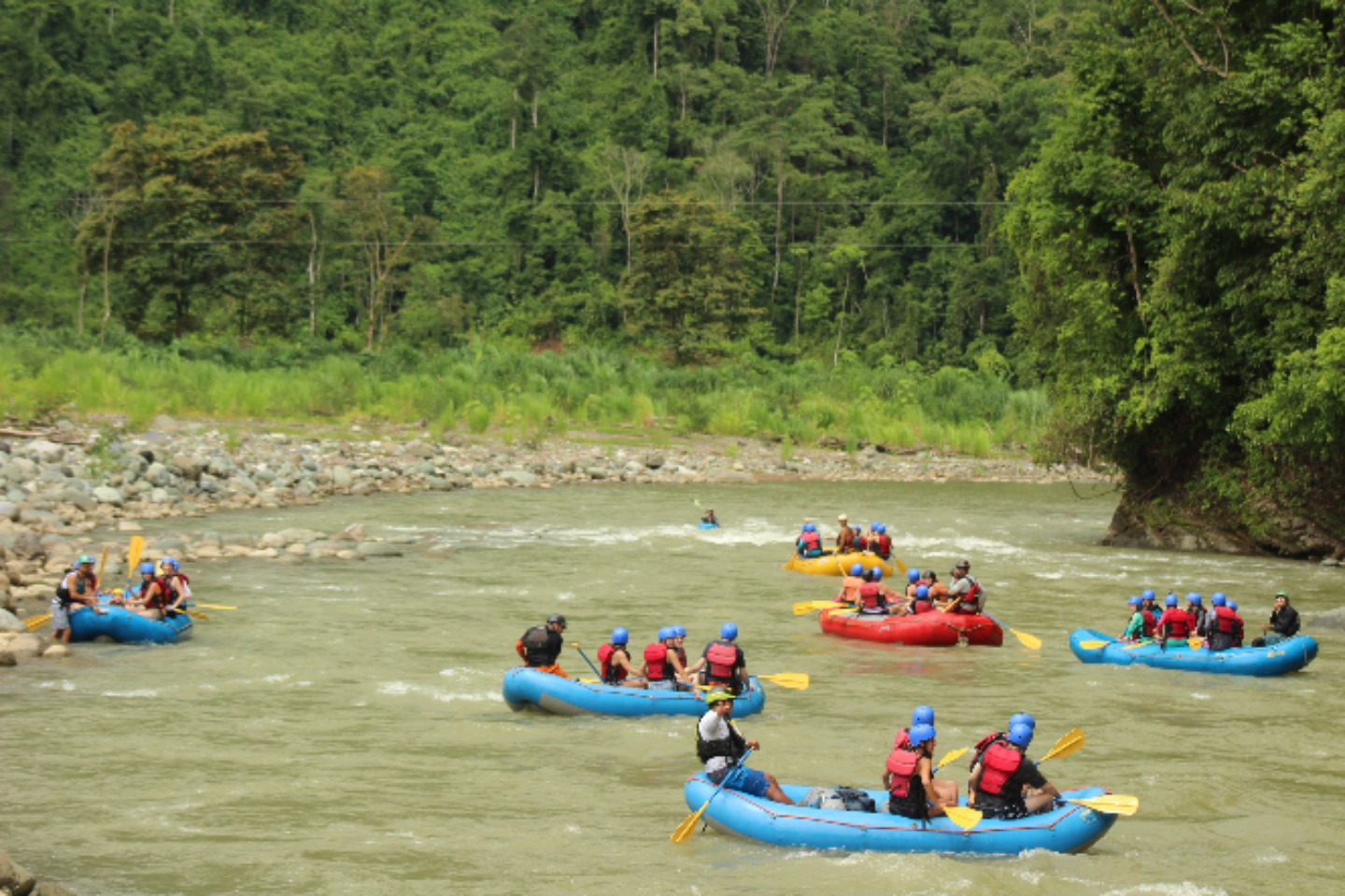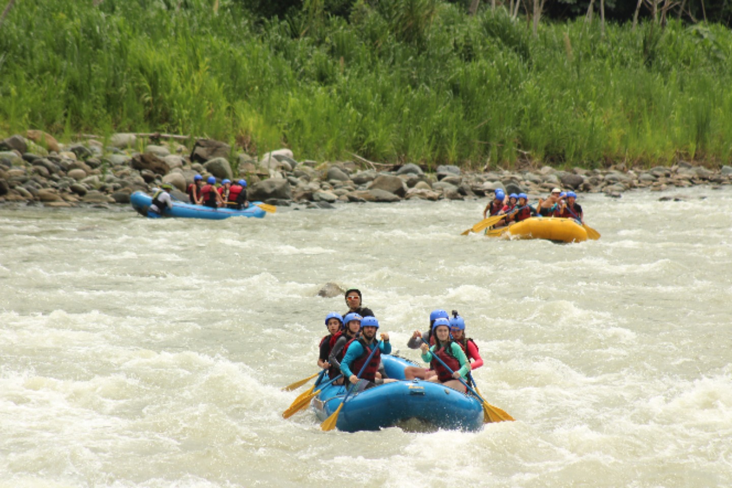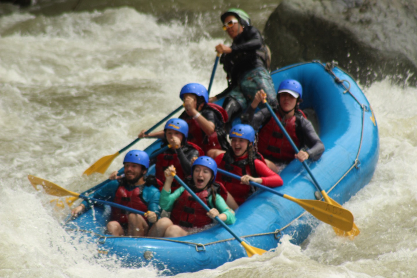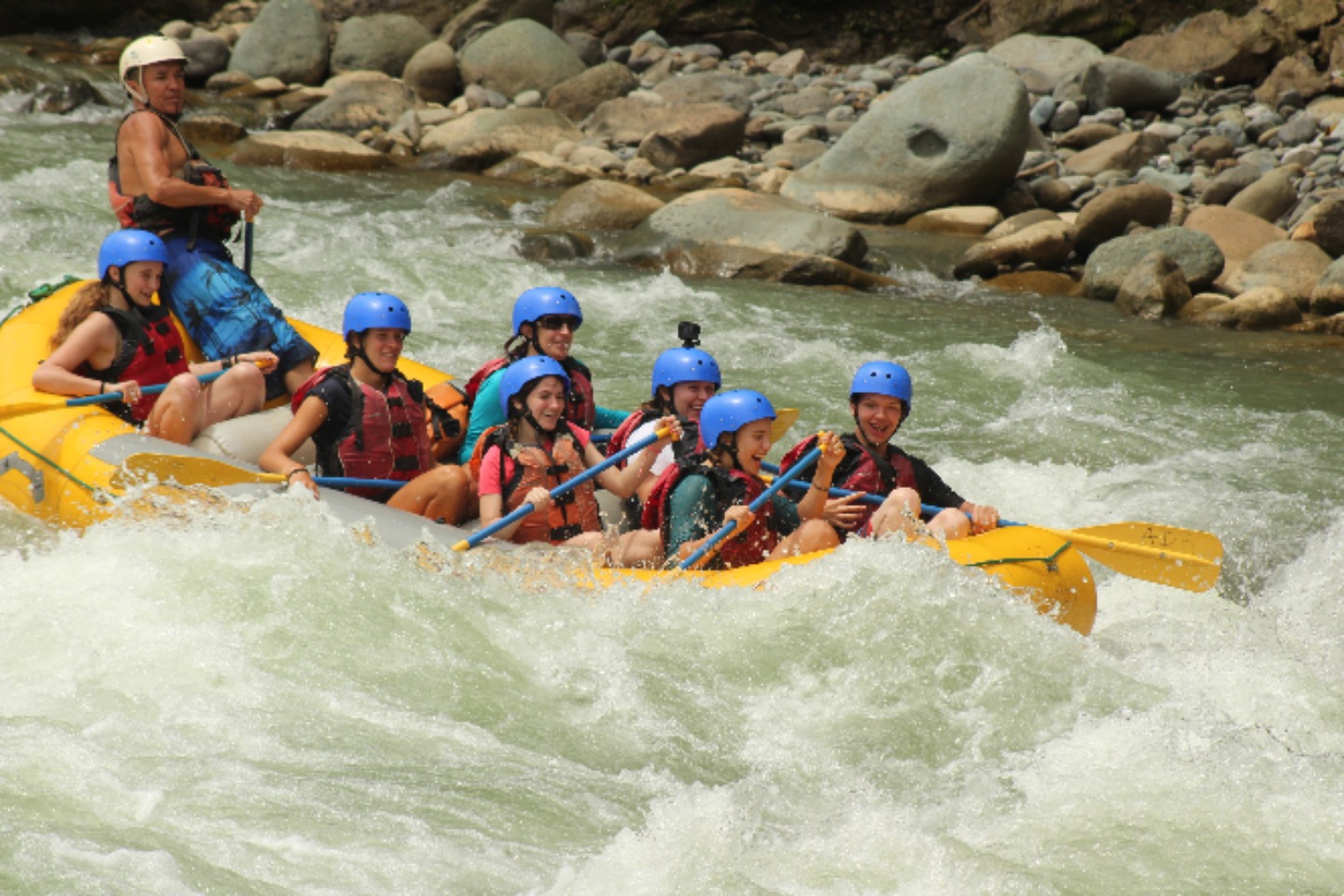 Our group briefly met in the lobby of the hotel, before loading up on our assigned bus. This is where our adventure started. After a quick breakfast and briefing, we were back on the bus and on our way to the river on which we would put in. We made our way up winding dirt roads, through rivers, and over hills. On the way to the river, the bus was relativity quiet. Everyone was soaking in our surroundings. Soon we were on the river. We were briefed about the risks of the river and were reminded of the basics of rafting. “Enough to survive today,” in the guide’s words. Then we were off. The rapids came one after another, moving our boat any way they pleased. The guide would scream paddle and positioning commands, turning us to hit the wave head-on. We all were having a great time. Around 20 rapids later, we made it to our halfway point. We all hopped off the rafts, eager to stretch our legs. In the distance, we could see a waterfall. This is where we would have a check-in and eat snacks. After five minutes of walking, we made it to the waterfall. There was a thick mist in the air, and all that could be heard was the roar of thousands of gallons of water hitting the rocks. After a couple of minutes of admiring the waterfall, we made our way down the mossy, slippery rocks and around the waterfall to take pictures. It was a highlight of the trip. Soon it was time to get back on the boats. Twenty minutes later we had paddled through the last rapid. We were all sad that we had to go, but the group was exhausted. Climbing onto the bus, we said our last goodbyes to the guides and started our journey home. It was an exciting, action-packed day, one I won’t forget for a long time.