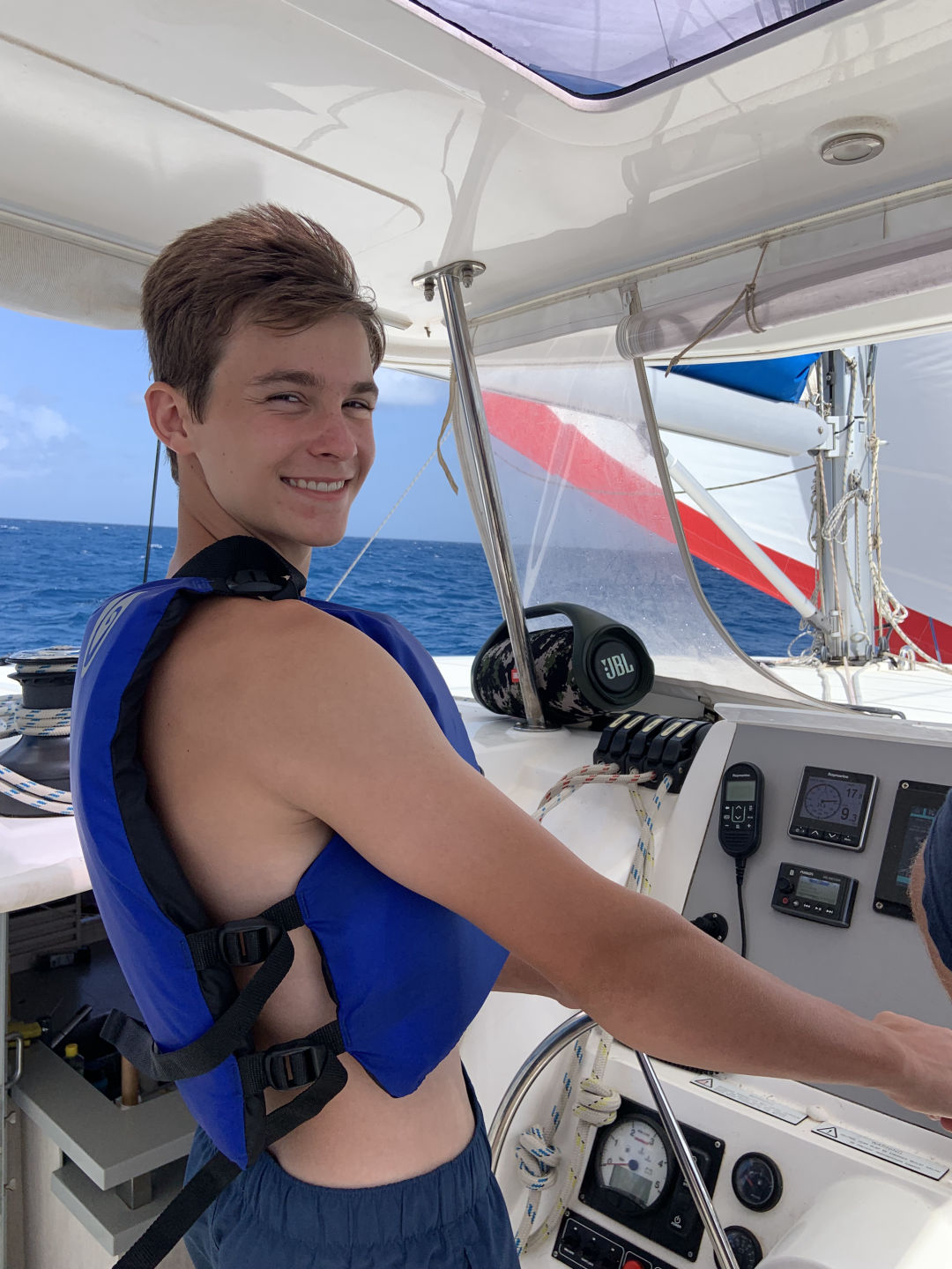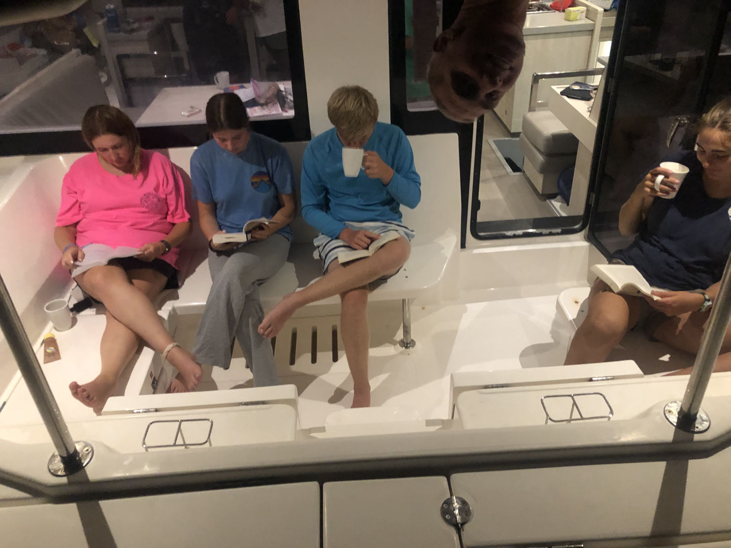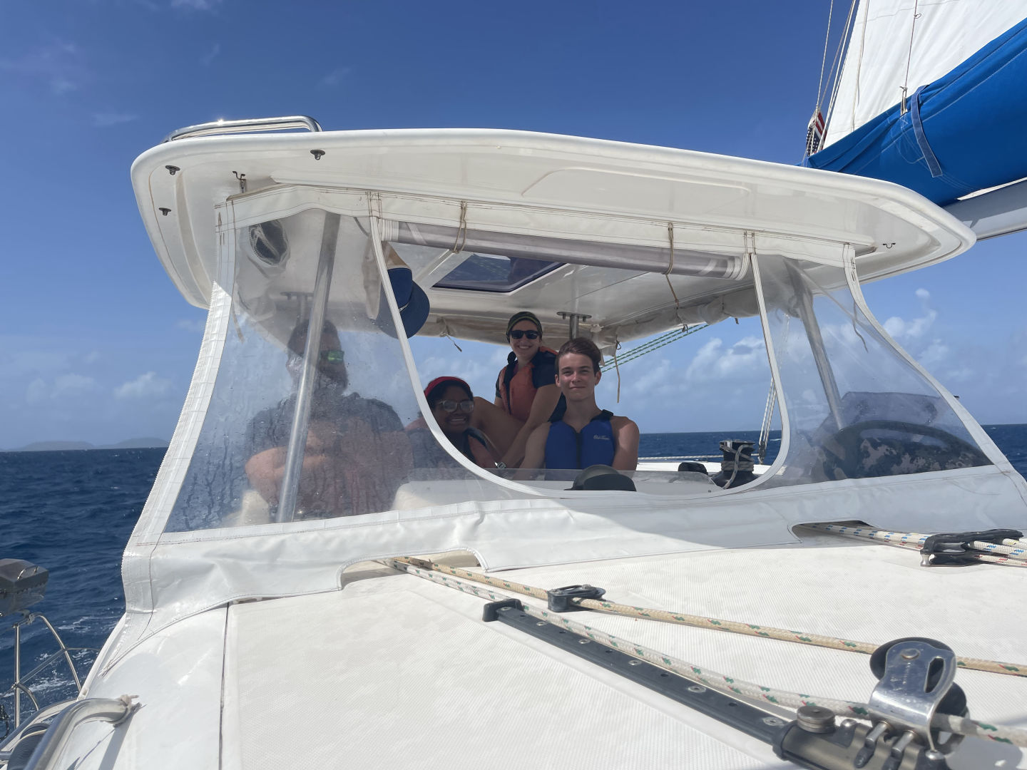This morning, much to everyone’s surprise, we woke up at a much more reasonable time than the past few days. With nowhere to be late, too, we took our time with breakfast, prepared by Avah and Shaila. As we got cleaned up and got ready to make the three-hour-long voyage to Anegada, our first mate Riley announced that we would be sailing for the first time the entire trip. Liam decided to get on the helm for the sail over. While we headed out of Leverick Bay, Chris and Elle both got comfy with their books at the front of the boat. It didn’t take long for waves to start splashing over the bow, drenching both of their books. After mooring in Anegada, we all hopped in the water for a quick swim, where Anne and Liam got jacked together by doing pull-ups off the back of the boat. Once everyone had dried off, and Anna S. and Lily had finished sun tanning, we gathered inside the salon of the boat and sat down for an inspiring documentary. Despite the intrigue that the documentary presented, it didn’t take long for Morgan and Lily to fall asleep. Much to their surprise, with the help of the first mate Riley, we all clapped, simultaneously waking them up. With less than 45 minutes left, technical difficulties were encountered, making the documentary unwatchable. Instead, we had a Lifeworks forum about the Ripple Effect. After taking a couple of very long naps, I joined Surya, Chris, and Morgan to watch a turtle that kept surfacing right near our boat. As I write this, full from the amazing taco dinner and cookie dessert that came after, I am being forced to move from my comfortable spot in the salon in order to allow Anna B. To clean. After a rest-filled recovery day, we are currently cleaning up and preparing to go to sleep.