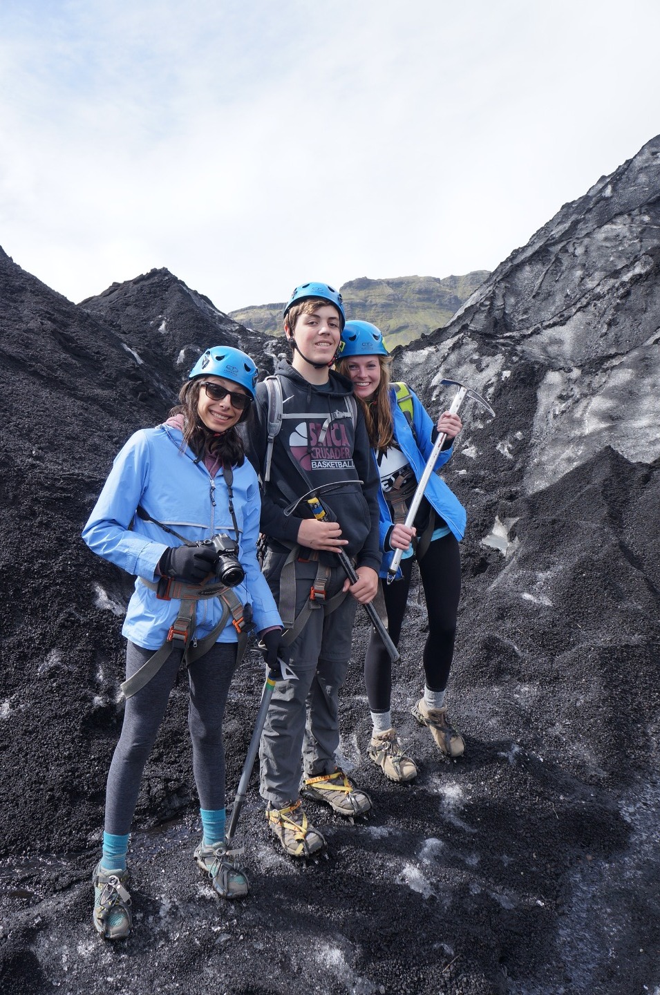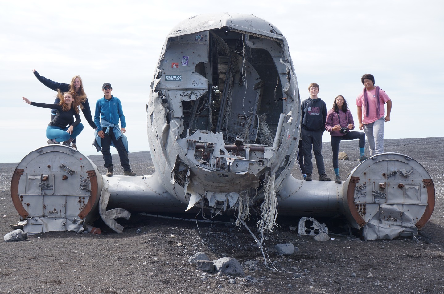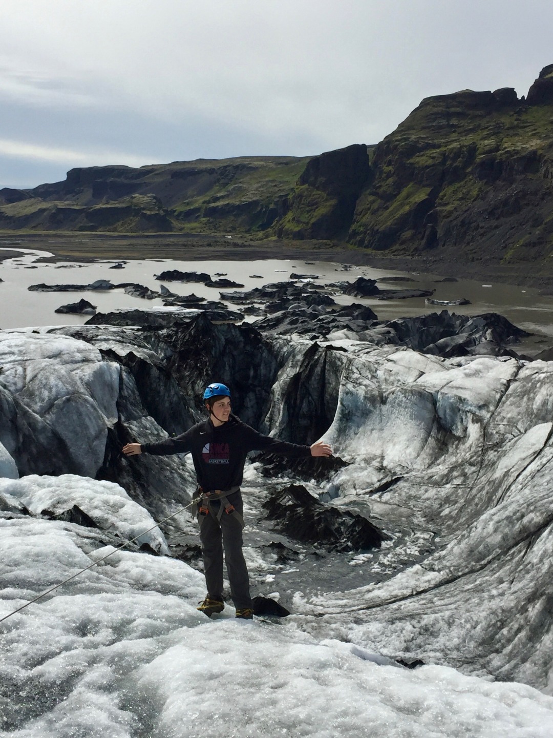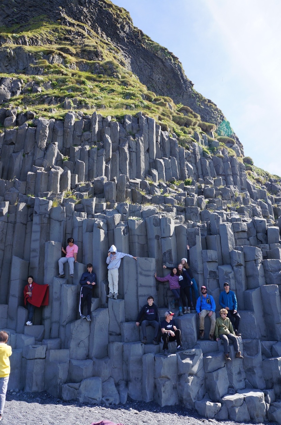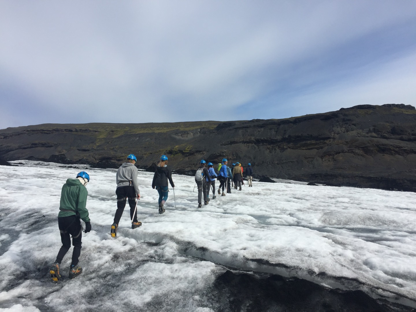 Today was a travel day but still full of activities. We had an early wake up to get everything packed up to hit the road at 9:00 am to head back to Reykjavik. During the bus ride, we made several stops to check out some of the beautiful views near the coast of Iceland. Our first stop was at Dyrholaey and Reynisfjara. Here, we got to see the beautiful black sand beaches and basalt columns, stacks, and arches. The black sand was such a unique thing to see because there is nowhere like that around where I live. After we took a few photos on the columns and got to climb a little, we got back on the bus. The next stop was a plane crash site. A plane had to make an emergency landing in 1973 and was preserved to create a tourist site. Our guide told us that Justin Bieber had actually filmed one of his music videos on top of the plane and showed us the clip, which was really cool to see. We got back on the bus again to make the biggest stop of the day. We got to do a glacier walk with our guide Mat at Solheimajökull. We had to hike quite a bit on the ice to get to the flat part on top. Just the fact that we were walking on top of a glacier blew my mind.