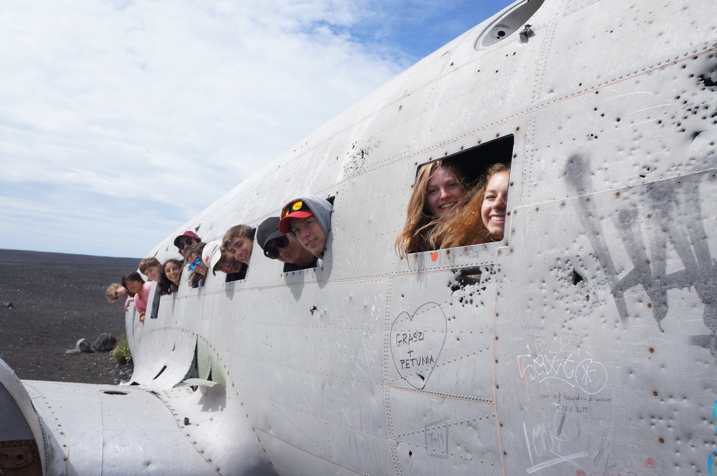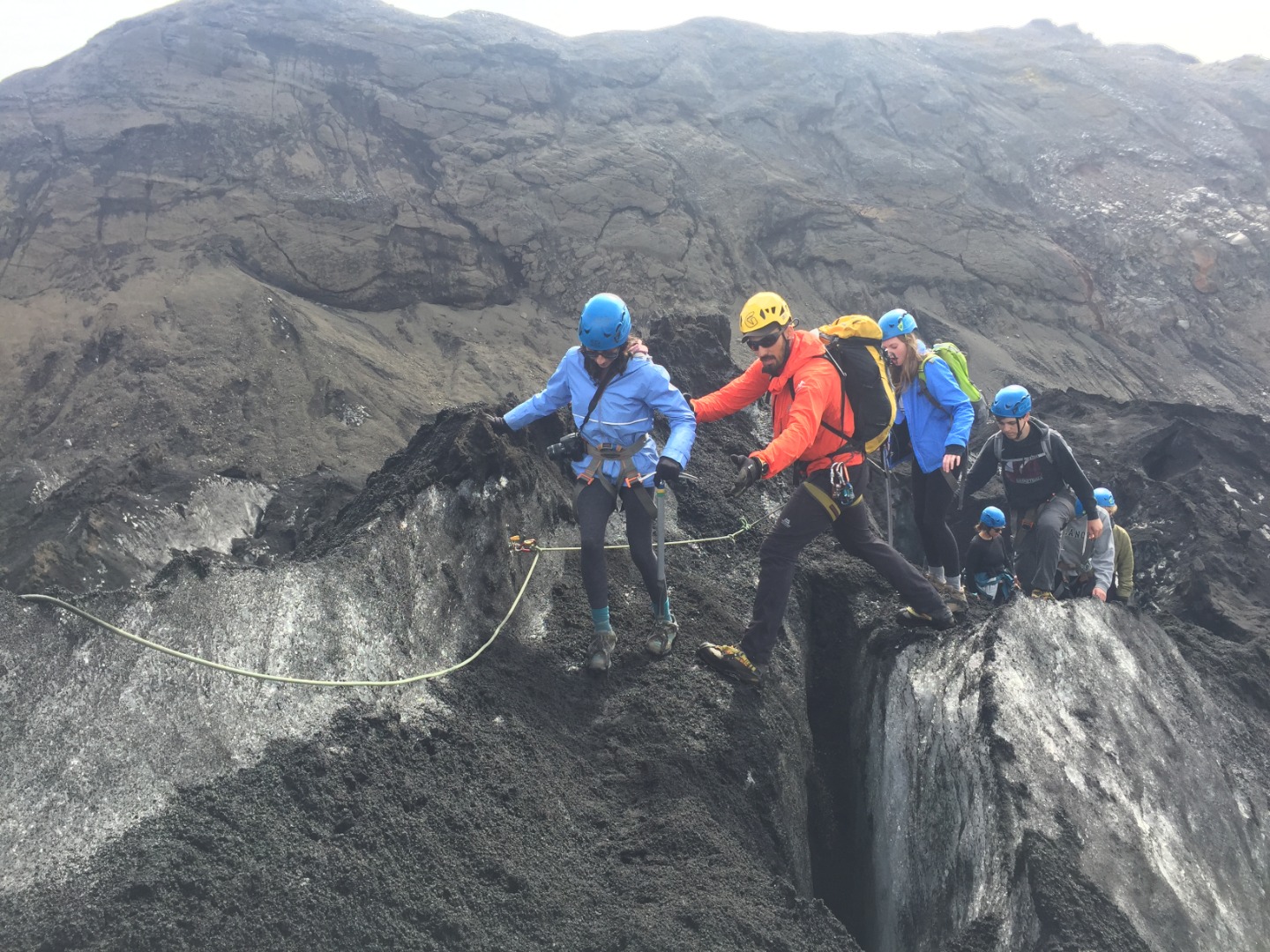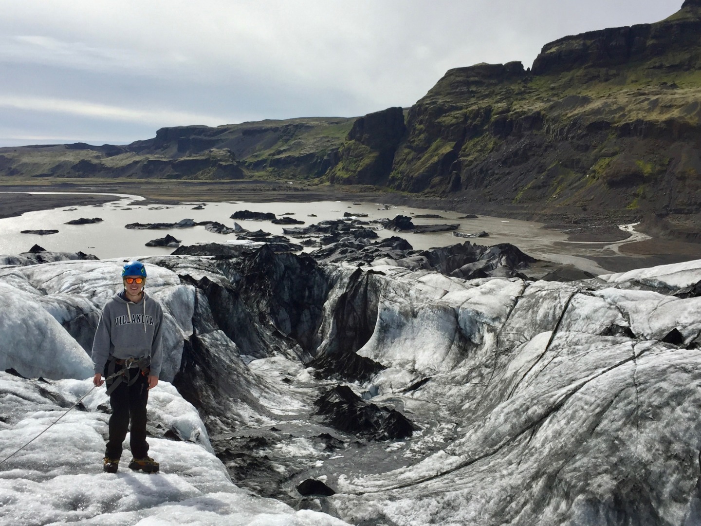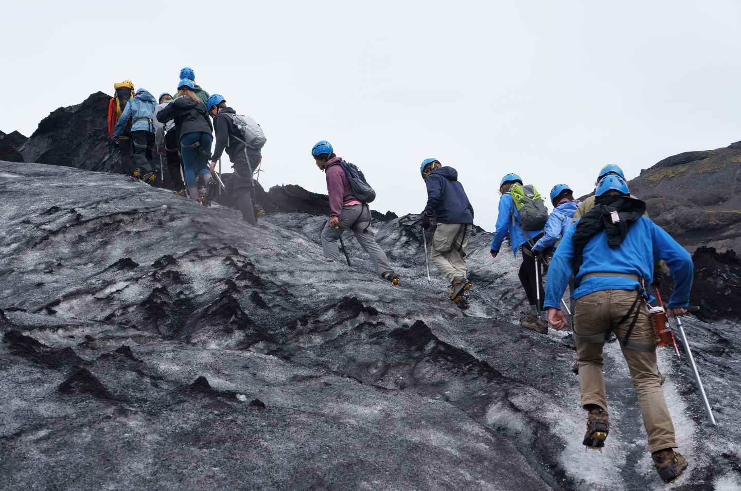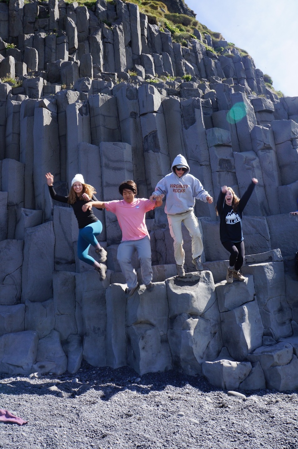 Today was a travel day but still full of activities. We had an early wake up to get everything packed up to hit the road at 9:00 am to head back to Reykjavik. During the bus ride, we made several stops to check out some of the beautiful views near the coast of Iceland. Our first stop was at Dyrholaey and Reynisfjara. Here, we got to see the beautiful black sand beaches and basalt columns, stacks, and arches. The black sand was such a unique thing to see because there is nowhere like that around where I live. After we took a few photos on the columns and got to climb a little, we got back on the bus. The next stop was a plane crash site. A plane had to make an emergency landing in 1973 and was preserved to create a tourist site. Our guide told us that Justin Bieber had actually filmed one of his music videos on top of the plane and showed us the clip, which was really cool to see. We got back on the bus again to make the biggest stop of the day. We got to do a glacier walk with our guide Mat at Solheimajökull. We had to hike quite a bit on the ice to get to the flat part on top. Just the fact that we were walking on top of a glacier blew my mind.