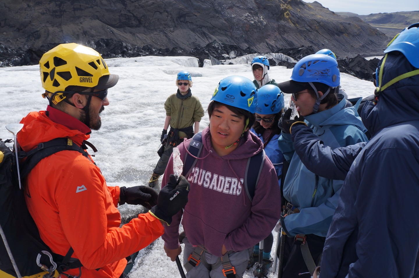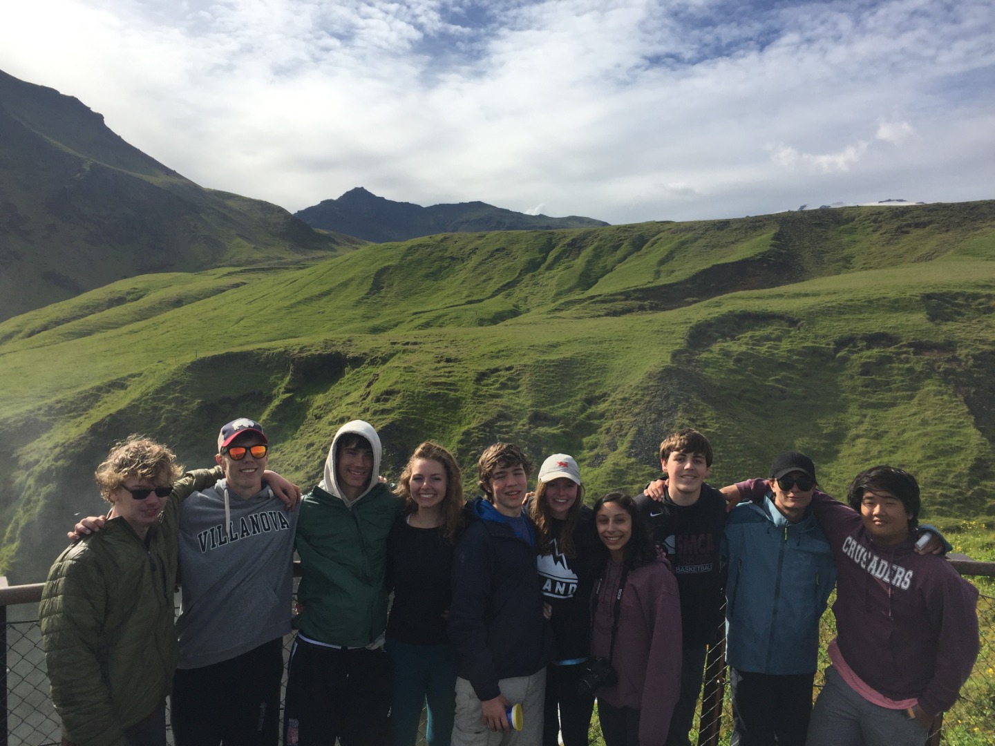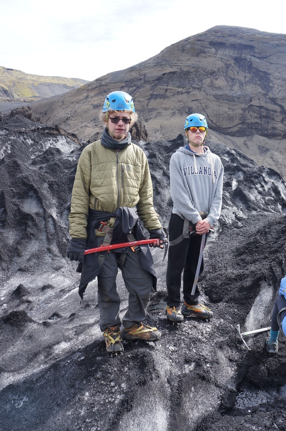 We had to have lots of gear including crampons, which are something you put on the bottom of your shoe to help your feet grip the ice, a harness, a helmet and an ice ax for our safety. Once we got to the top, we were able to clip into a rope and lean back and look into a crevice in the ice to see a different perspective. Getting to do this glacier hike was such a unique experience. After the glacier, we got to visit two different waterfalls called Skogafoss and Seljalandsfoss. To get a beautiful view of Skogafoss, we climbed 427 stairs, but it was definitely worth it. Seljalandsfoss was interesting because we got to walk behind the waterfall to see it from a different side and we got soaked, but also, it was definitely worth it. By the end of all this, we were all exhausted and ready for some food, so we stopped at a gas station to get famous Icelandic hotdogs, called pylsunur here. After a tiring but exciting day, we arrived in Reykjavik at 9:00 and got settled into our rooms for a good night’s sleep.