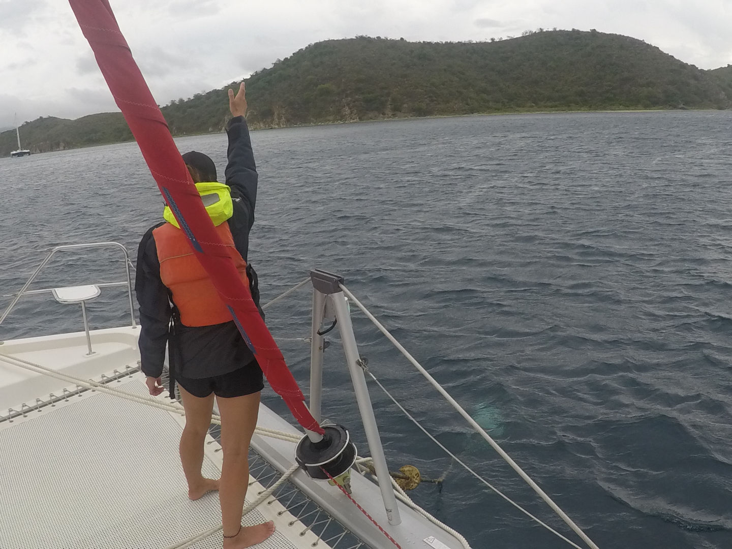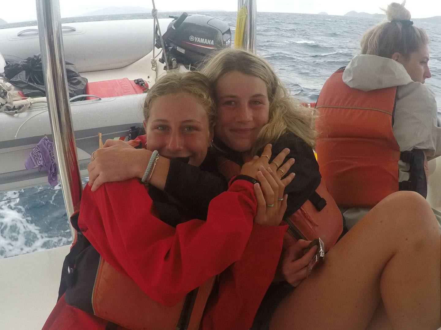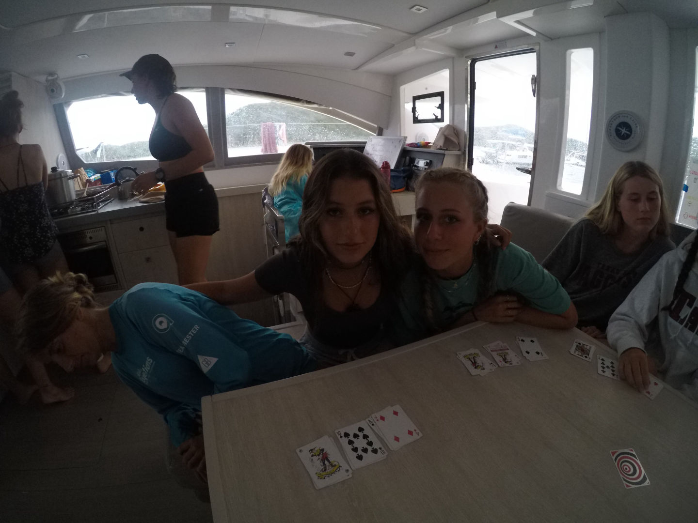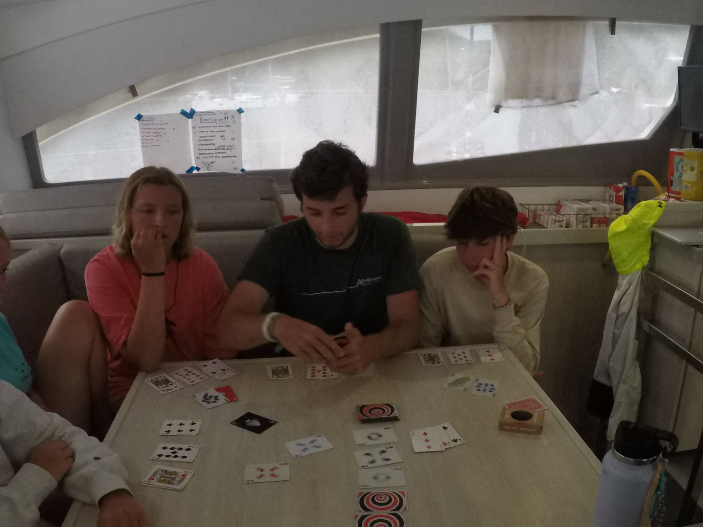 The morning started late, to my utmost delight. The warning of storms meant we would have to leave to join the rest of the fleet early in the morning, so the wonderful staff let us sleep as they sailed to port. Many other crew members and I took advantage of the late morning to take time to ourselves by sleeping late, reading, or journaling. However, we were all up by the time we got to port to fill our water supply. Em pointed out that the storm clouds gathered just over where we would be sailing. Many others and I had mixed feelings about sailing into a storm, but to no surprise, we were all excited about the challenge. As we rode into the storm, the waves crashed against the boat, and the rain-drenched it. Fun fact: no matter how good of balance you have on a boat in a storm, you will run into things and have to hold on in order to avoid falling. This made making French toast and eating breakfast a bit of a challenge, but definitely something we won’t forget. When the cooking was done, we all had to eat the French toast by hand for fear of losing dishes or silverware overboard. We used one bowl in the center for syrup, and surprisingly no one double-dipped. When we got to the fleet, the rain and waves had settled, and we took the opportunity to shower. After all that, the day was relaxed and spent reading, journaling, playing card games, etc. It rained on and off all day, but nothing bad. Later we had lunch, but by evening many of us became restless. That was when some of us learned to play poker. For the record, we didn’t use money — we had two packs of cards, and one was used as currency while the other was used as the actual cards. Many joined in on the game, and I learned that: 1) I can’t bluff, and 2) I should never play poker in a real game because I am not great at playing. As the time passed, we hadn’t even noticed that dinner was done, and we were being called outside. We had Mexican for dinner, and it was delicious as our meals usually are. Clean-up was swift, as we needed to do squeeze for the night, and it was as fun as always. We then decided to make a small cake, but someone stole the frosting and ran outside with it, so we locked them out until they brought it back. You could hear running and shouting from all sides, but after about ten minutes, they brought it back. While we waited for the cake to cool, we had an epic dance party with flashing and loud music. It was the best. As we settled down and ate cake, we found that we had actually been pretty tired. We laid down in our sleep spots, and we were out almost instantly.