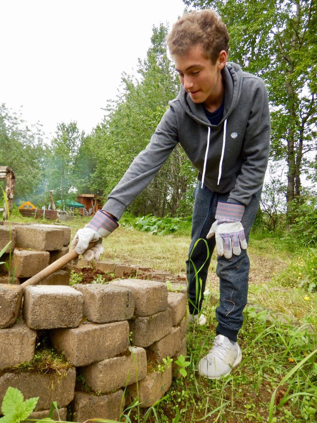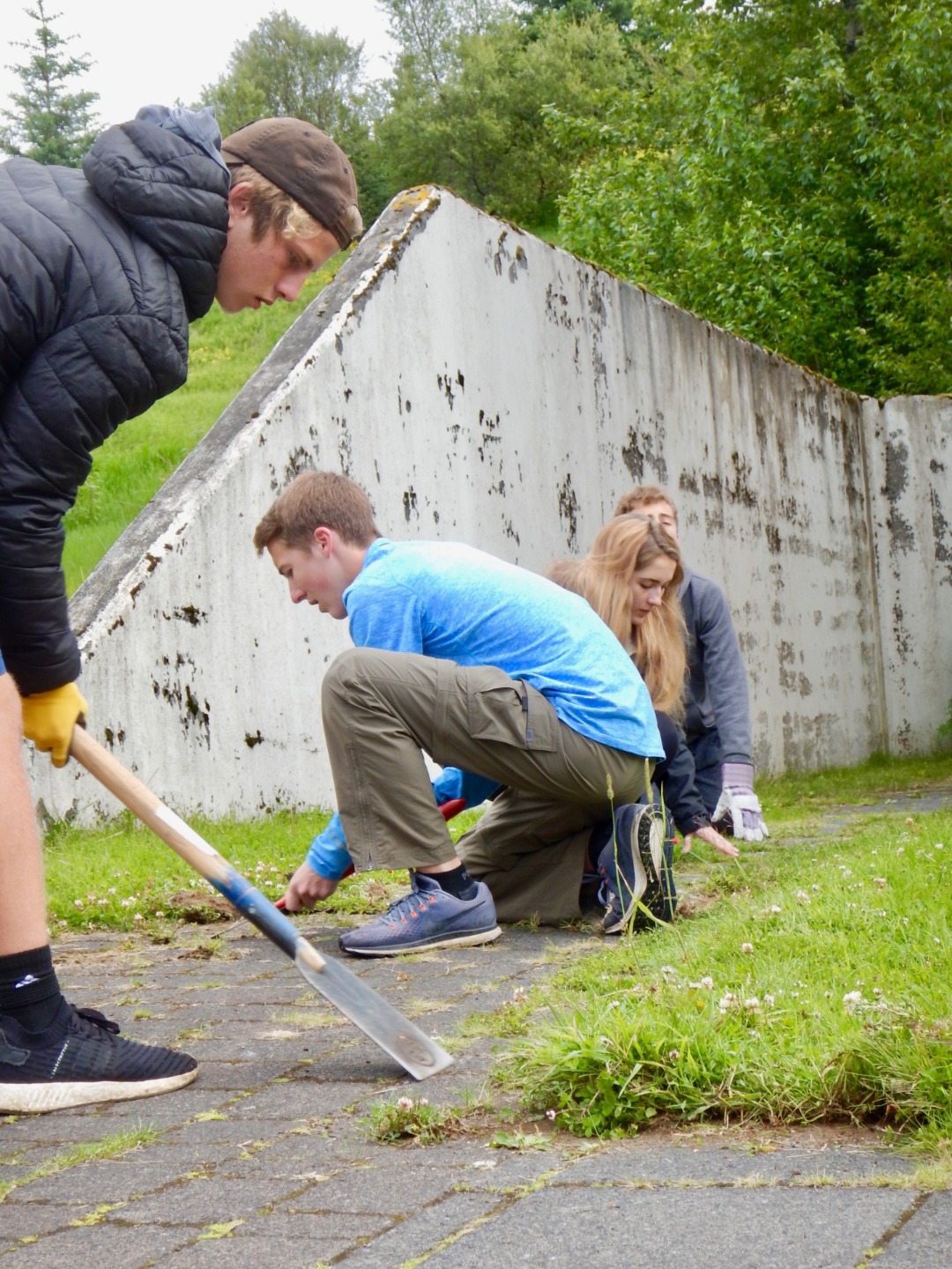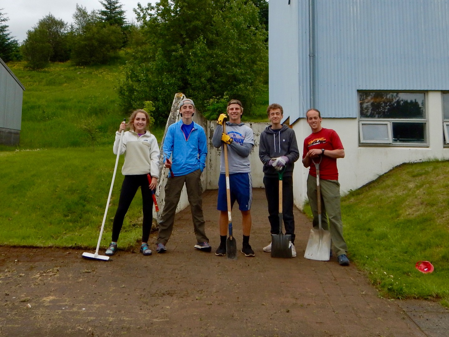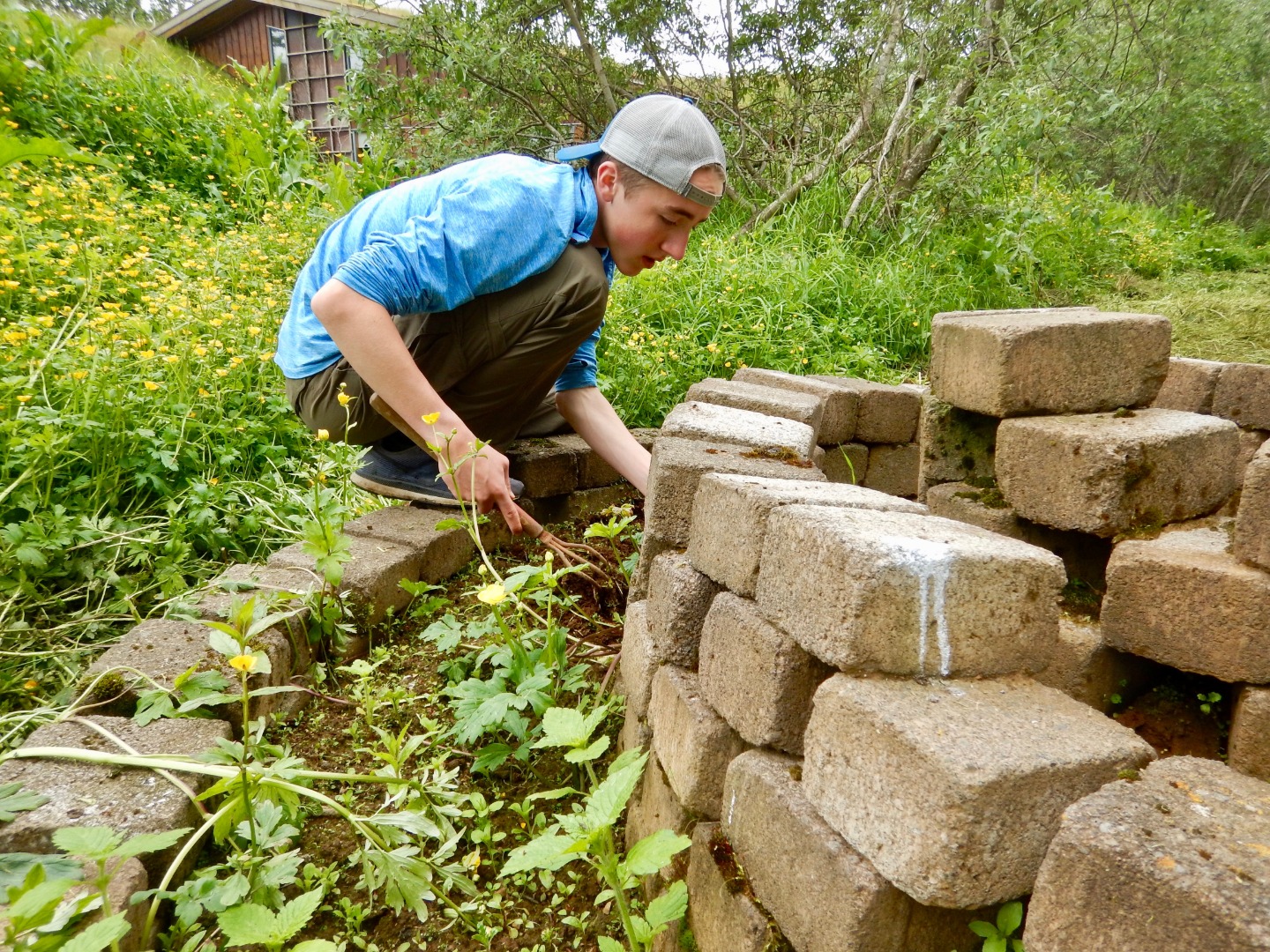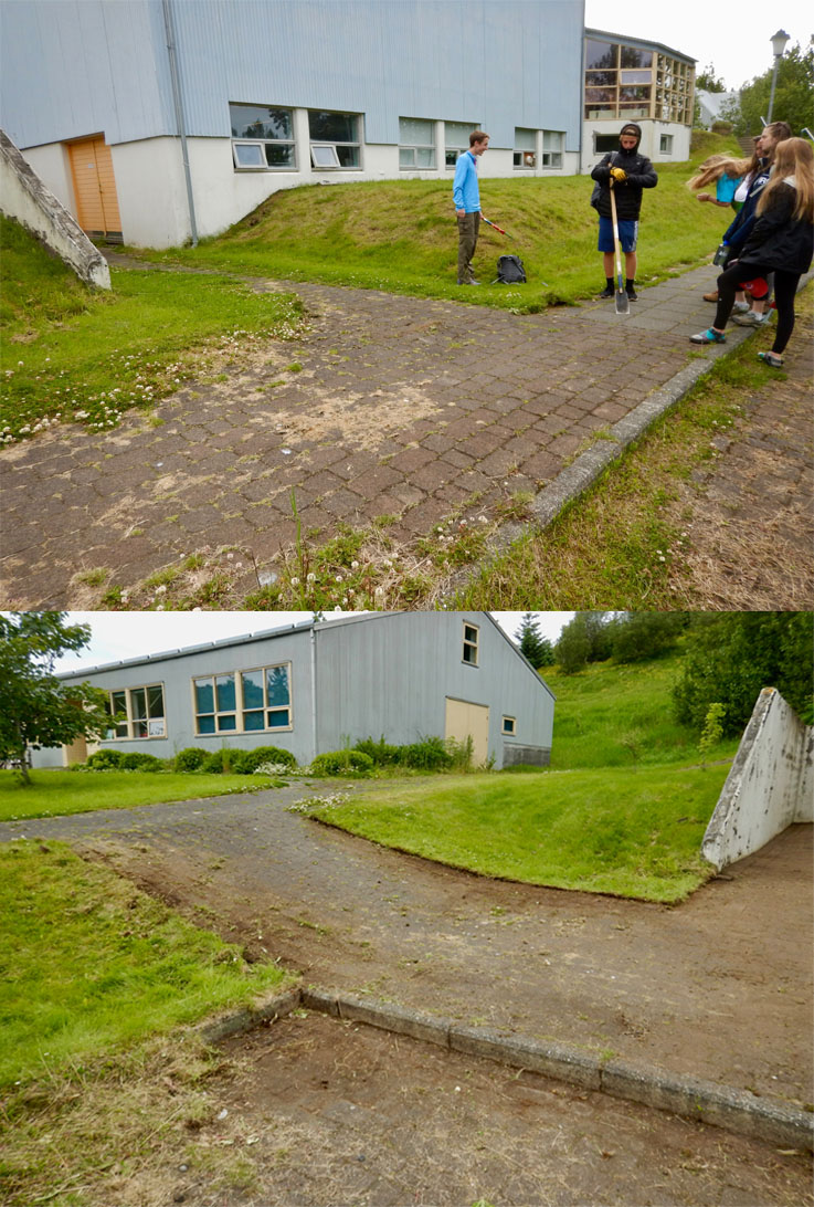 Much like yesterday, we ate breakfast in the cafeteria and then gathered in the yard with the Sólheimar locals to stand in a circle, hold hands, and start the day together. Immediately afterward, we headed to the troll garden and continued our work from yesterday: picking out weed roots, raking grass, and preparing the dirt for planting. Several of us hacked the overgrown grass away behind the workout room, and by lunchtime, the garden was ready for planting.