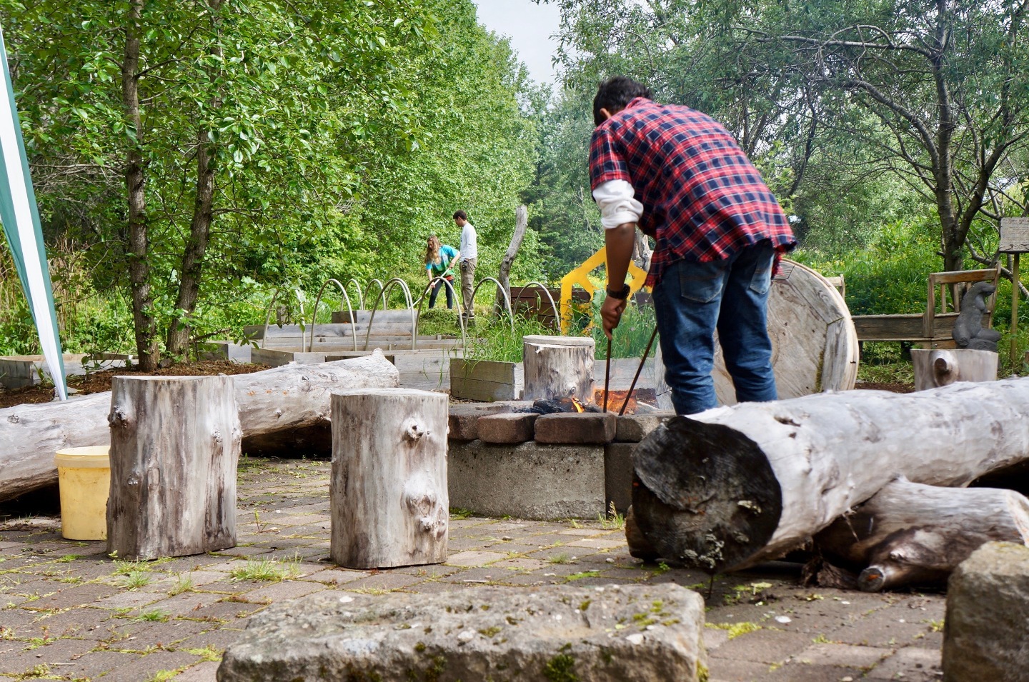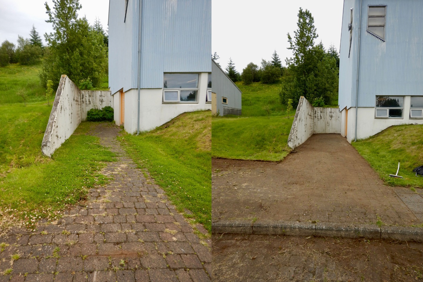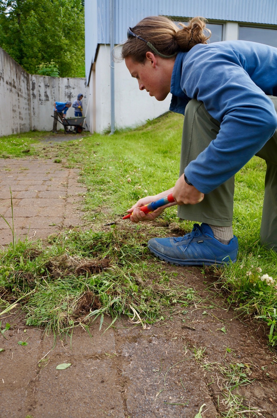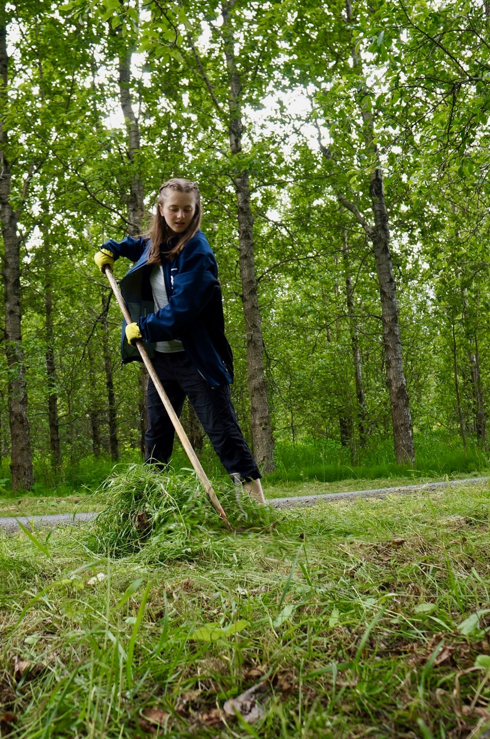 Much like yesterday, we ate breakfast in the cafeteria and then gathered in the yard with the Sólheimar locals to stand in a circle, hold hands, and start the day together. Immediately afterward, we headed to the troll garden and continued our work from yesterday: picking out weed roots, raking grass, and preparing the dirt for planting. Several of us hacked the overgrown grass away behind the workout room, and by lunchtime, the garden was ready for planting.