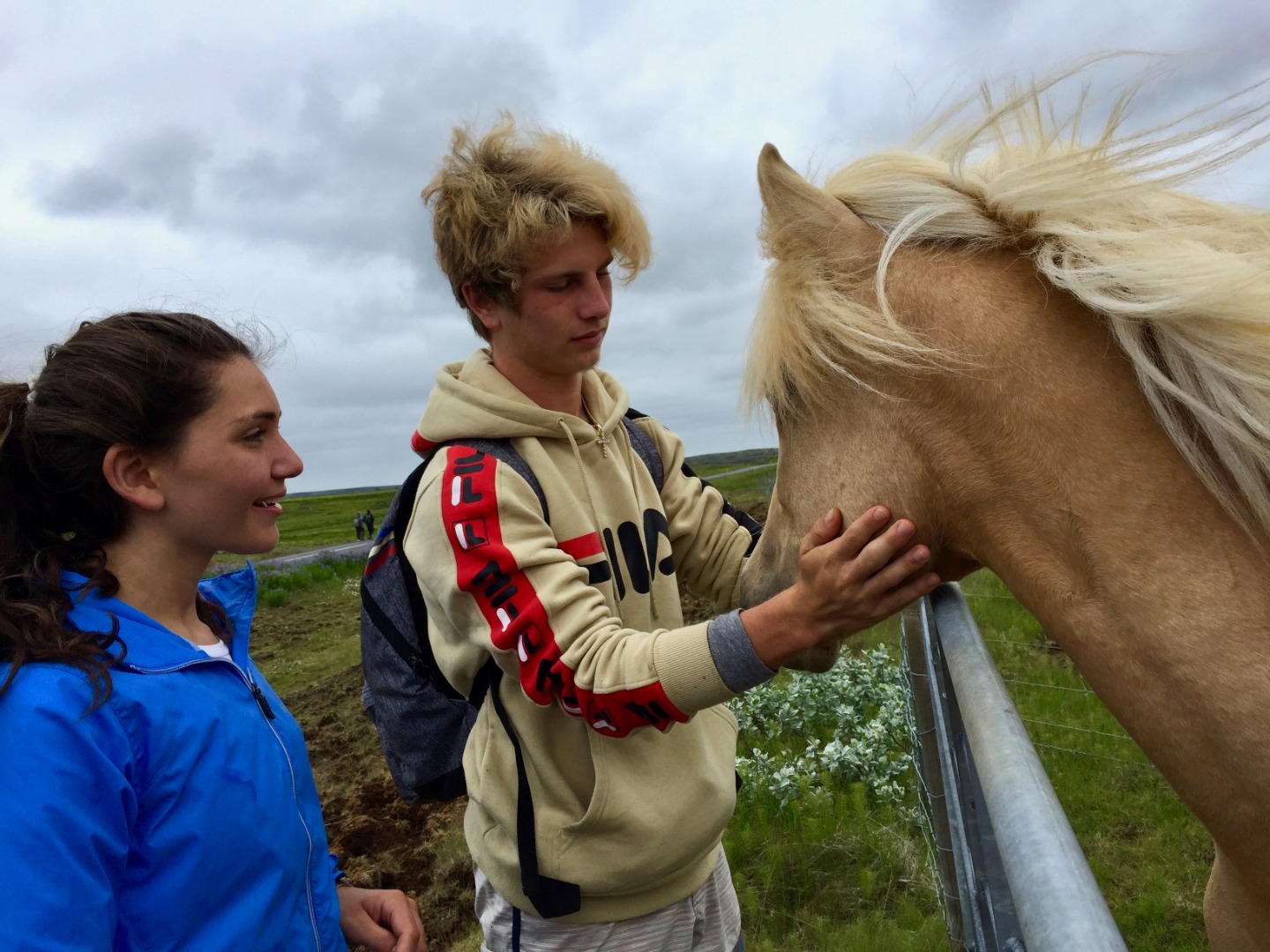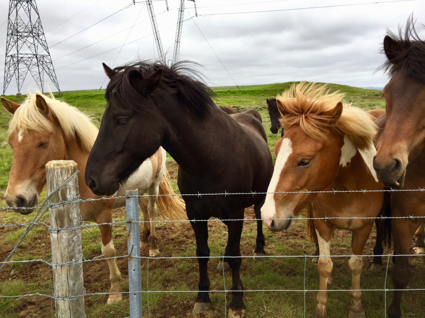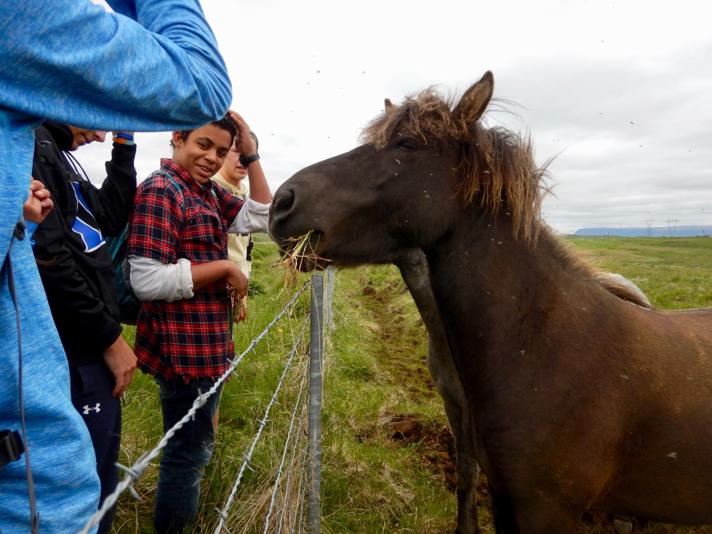 We climbed through the ditches to meet each herd of horses we passed. They trailed along beside us, nuzzling our jackets and eating grass from our hands. My favorite horse had a small white spot on his head and velvety brown skin and a whole swarm of flies buzzing around his head. He was friendly, ate my grass, and didn’t get scared away. As Eric said, a “pal 100”.