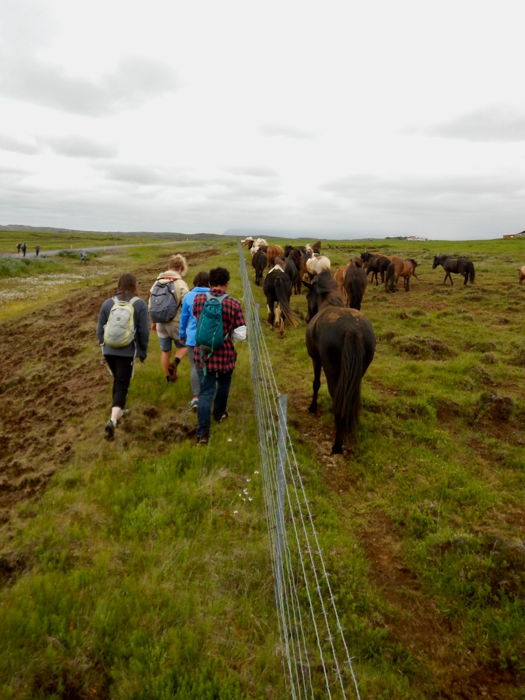 We took a breather for thirty minutes then started the 5.5-mile trek to the swimming pool, where we would spend the rest of the day. Thick layers of clouds blocked out the sunlight and painted the stereotypical Icelandic landscape: flat plains of grass and rock framed by distant mountains, bright fog wrapping around the peaks and silhouetting herds of horses running across the hilltops, and a long, open road.