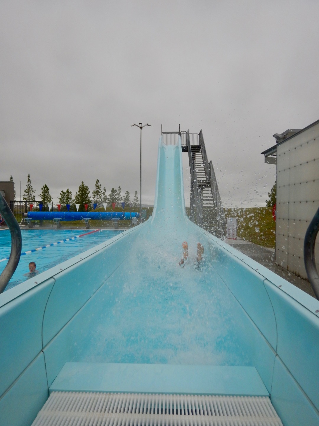 When we arrived at the swimming pool, we learned that its water comes from underground geothermic springs. There was a water-slide and three hot tubs, each at slightly different temperatures: 36 degrees Celsius, 39 degrees, and 42 if I remember correctly. There was also a sauna.