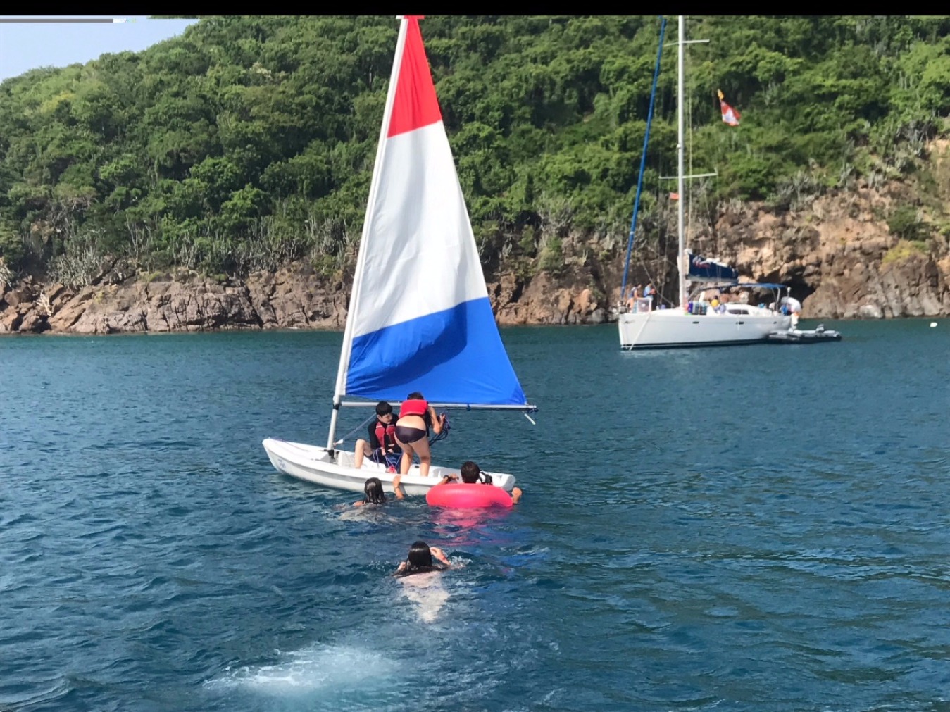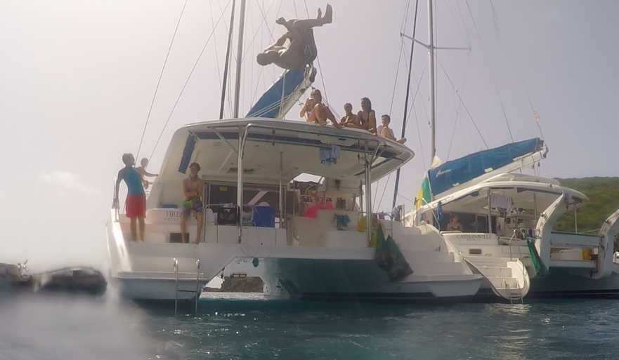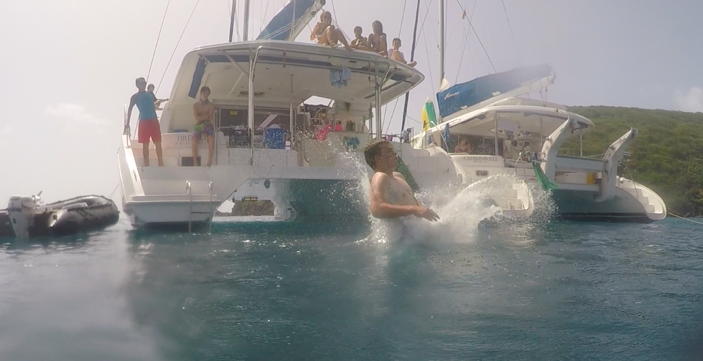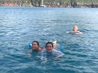 Today I woke up to the smell of pancakes cooking and an aching back from sleeping on the coach. It was a rough night due to the cool breezes that never stopped. We were all on our own this morning because of a staff meeting on shore. However, we were very successful in cooking, cleaning and leaving the boat spotless for when they got back. After that, as my skipper duties, I lead us in sailing to Muskmelon Bay. On our way, we passed many cool islands including Iguana Island, which is known for a rock formation in the shape of an iguana head. Once we got here, we had a really fun day by just hanging out with the other boat and doing various activities including knee boarding, water skiing, wakeboarding, jumping off the boat, and sailing on Picos. Picos are so cool because it’s a two-person sailboat that involves a lot of balance, which is something Emily and I don’t have. We capsized two times but had the time of our lives and laughed non-stop. After all the razzmatazz we all got settled and ended with a movie night and brownies. This day is definitely in the books!
