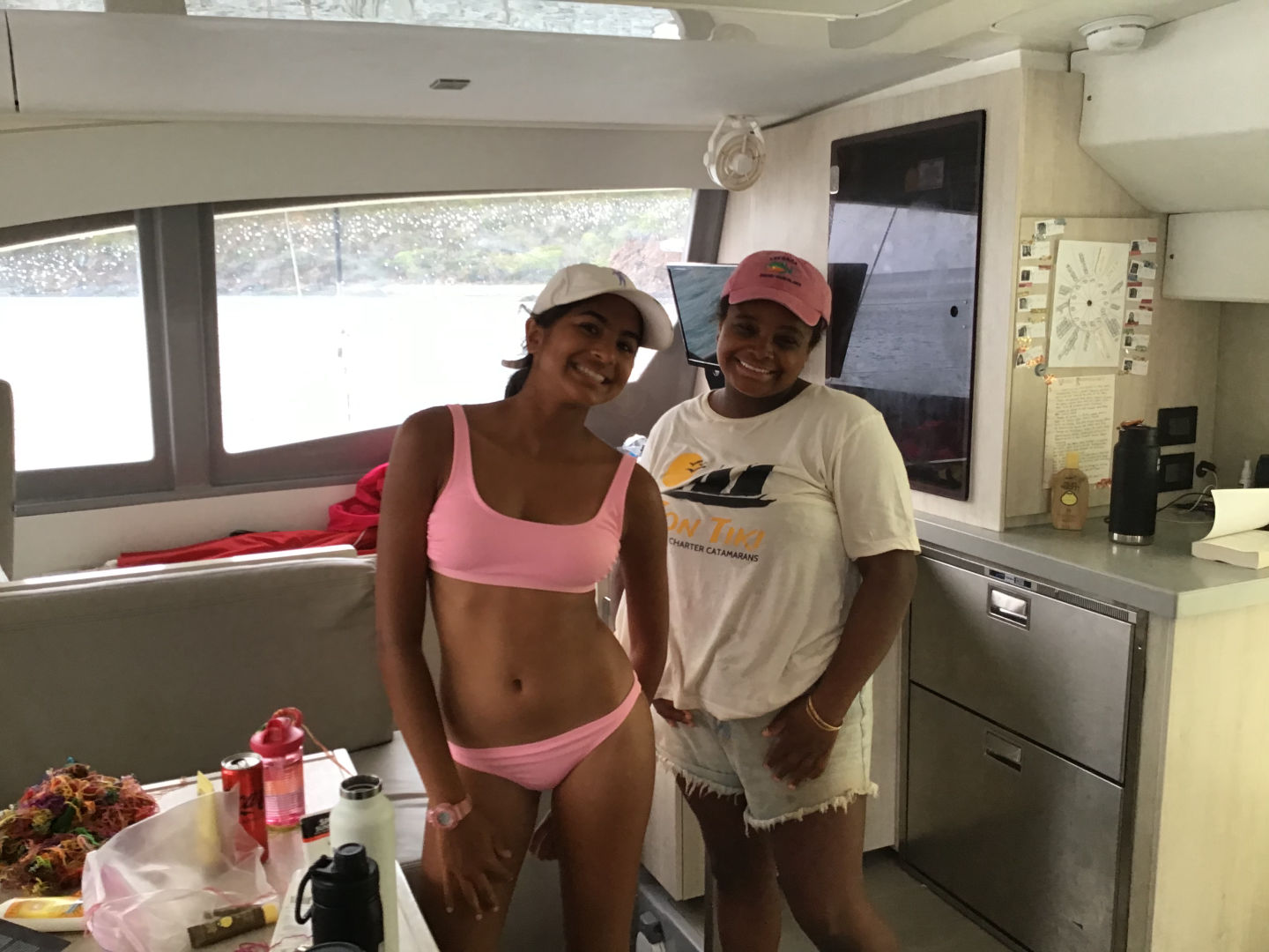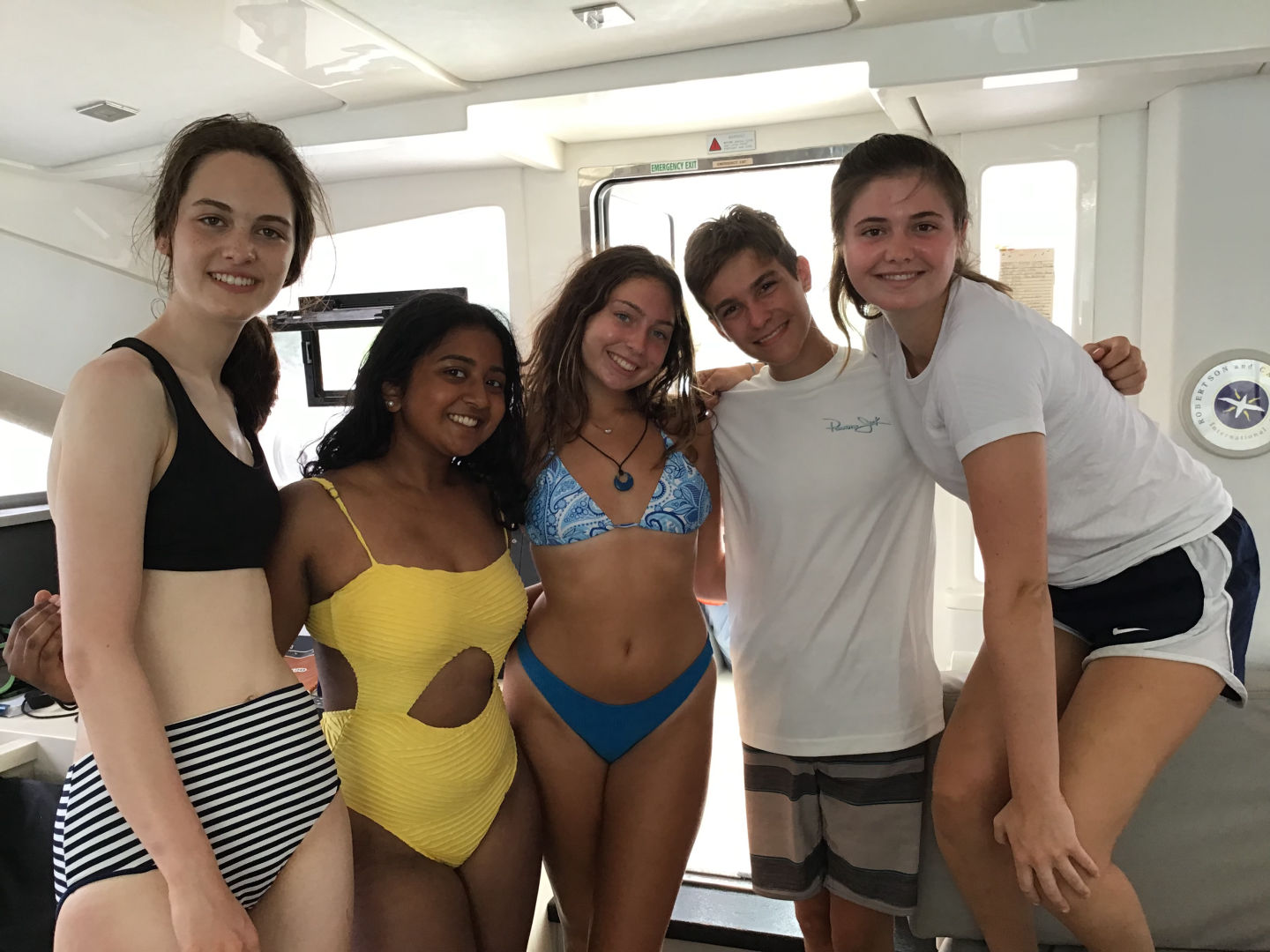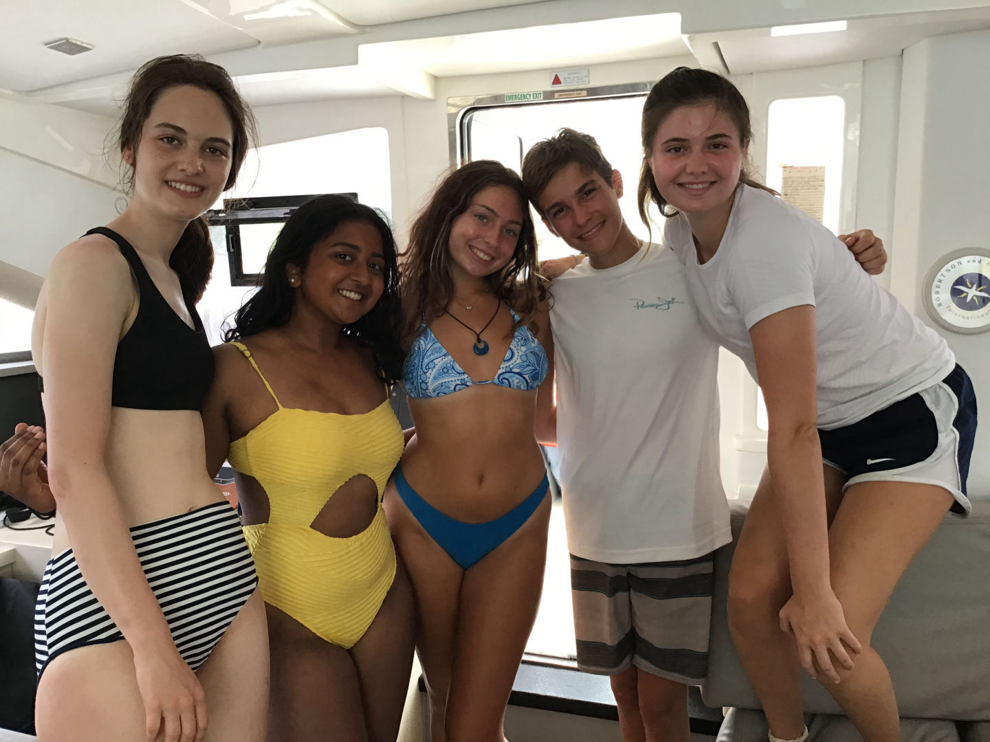 We all woke up tired due to the storm last night, which forced everyone who was sleeping outside to move indoors. But Liam and Elle pushed through, getting soaked, and slept through the night. When we finally woke up, we enjoyed cereal for breakfast while the counselors left for an hour-and-a-half-long meeting. While they were gone, Griffin, who was the deckie, almost slipped into the ocean but was fine. When the counselors returned, we got ready to sail to Muskmelon Bay on the North side of Tortola. During this time, Avah, Surya, and some others enjoyed reading to pass the time. After our arrival, Lily and Liam made grilled cheese for lunch, but we, unfortunately, ran out of propane. Shaila and I took pictures with the matching shirts we got in Anegada in front of the beautiful landscape. After that, our group was able to do water sports because the super-dinghy had arrived. The first group left with Benzie, and Liam, Griffin, and Anna B. all went water skiing. After they did that, Hannah and Shaila went boogie boarding, where they got lots of air time. Elle got to ride and watch in the dinghy the whole time.