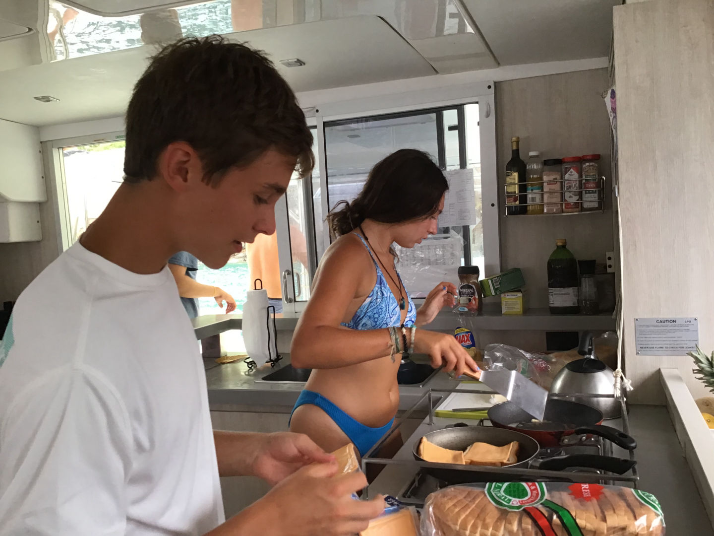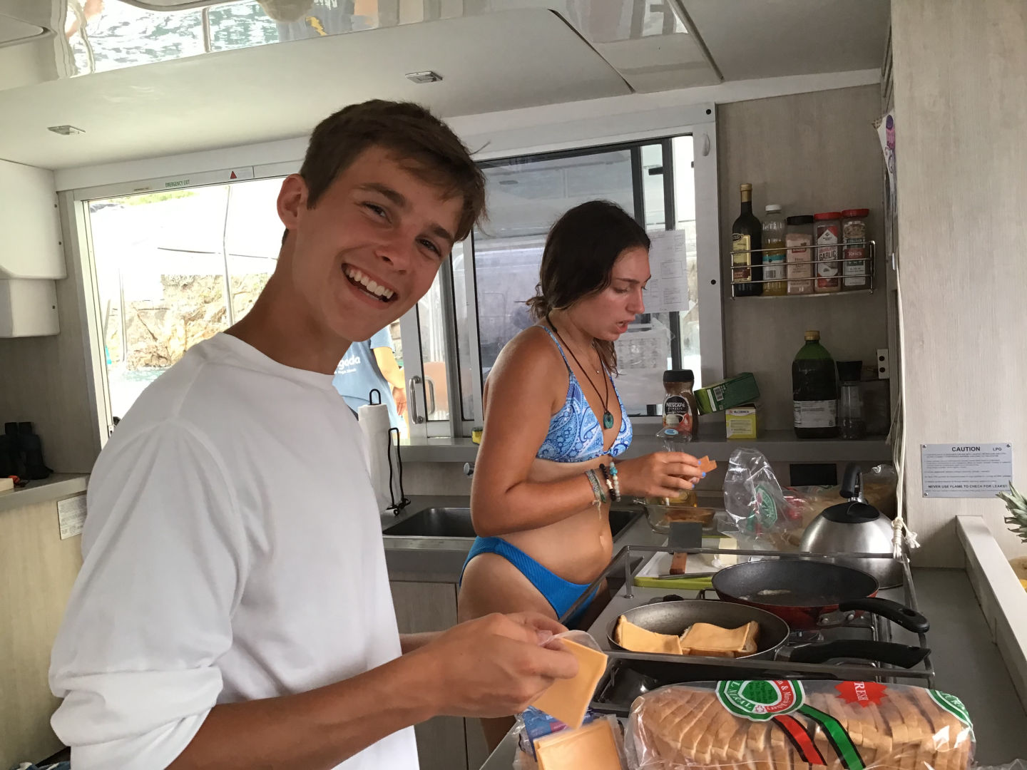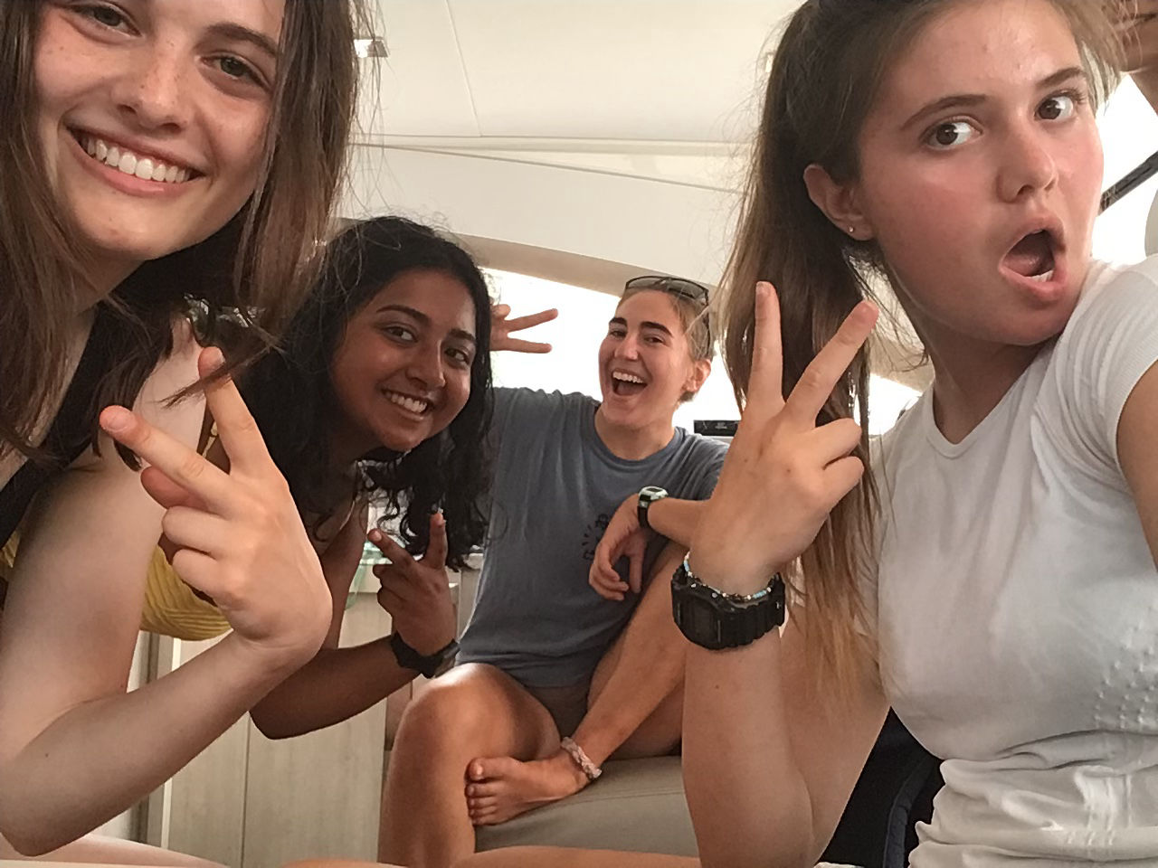 We all woke up tired due to the storm last night, which forced everyone who was sleeping outside to move indoors. But Liam and Elle pushed through, getting soaked, and slept through the night. When we finally woke up, we enjoyed cereal for breakfast while the counselors left for an hour-and-a-half-long meeting. While they were gone, Griffin, who was the deckie, almost slipped into the ocean but was fine. When the counselors returned, we got ready to sail to Muskmelon Bay on the North side of Tortola. During this time, Avah, Surya, and some others enjoyed reading to pass the time. After our arrival, Lily and Liam made grilled cheese for lunch, but we, unfortunately, ran out of propane. Shaila and I took pictures with the matching shirts we got in Anegada in front of the beautiful landscape. After that, our group was able to do water sports because the super-dinghy had arrived. The first group left with Benzie, and Liam, Griffin, and Anna B. all went water skiing. After they did that, Hannah and Shaila went boogie boarding, where they got lots of air time. Elle got to ride and watch in the dinghy the whole time.