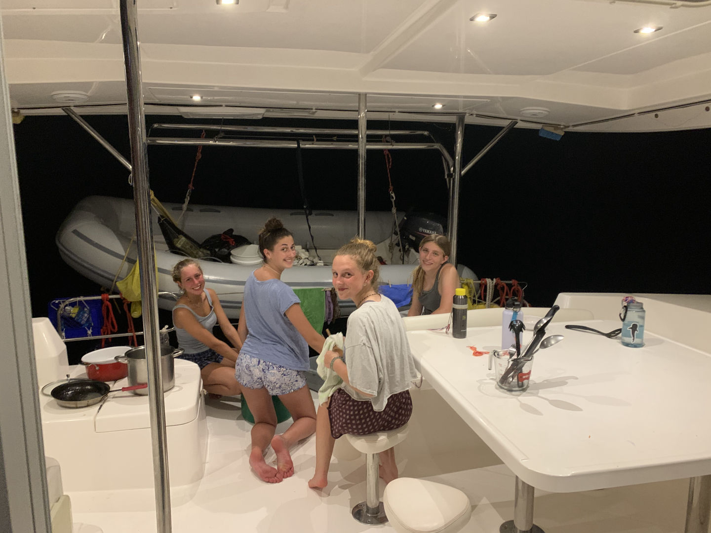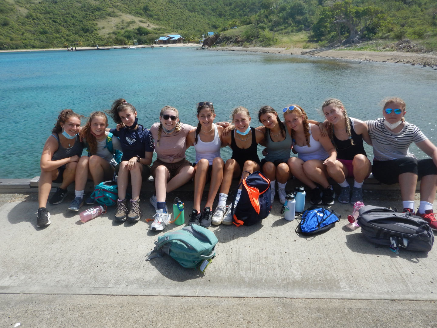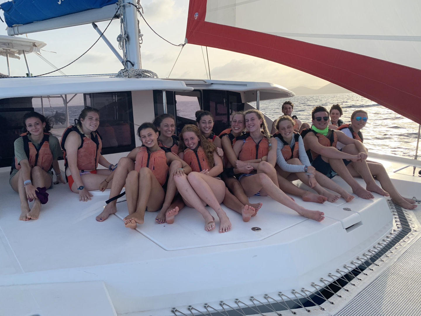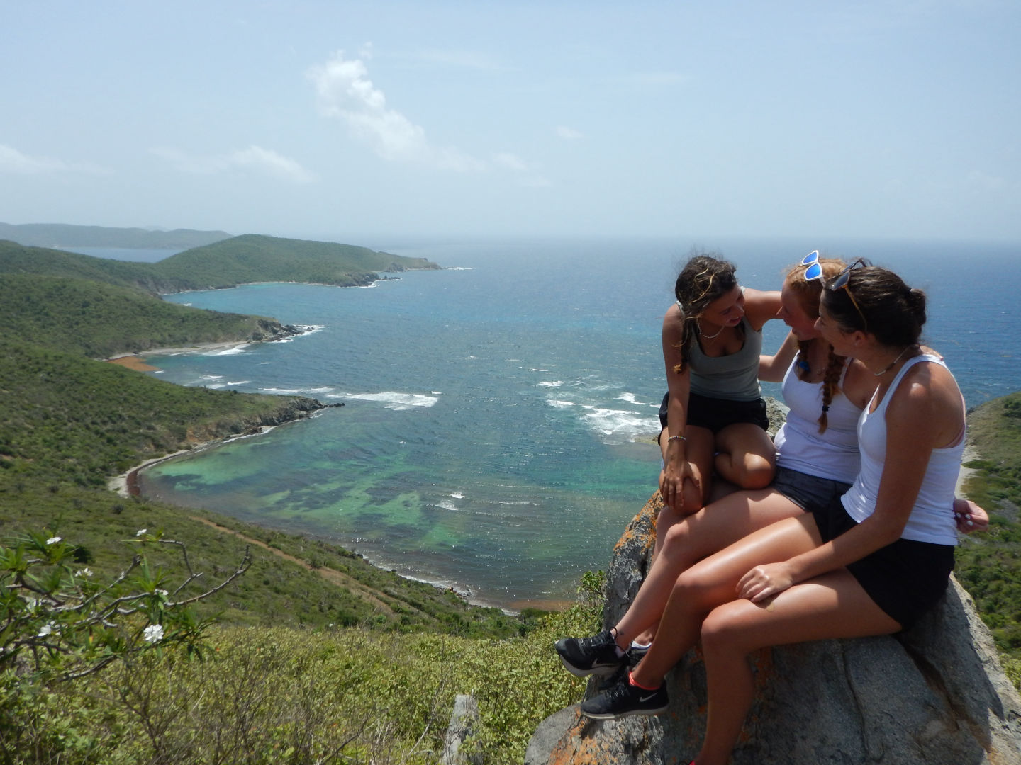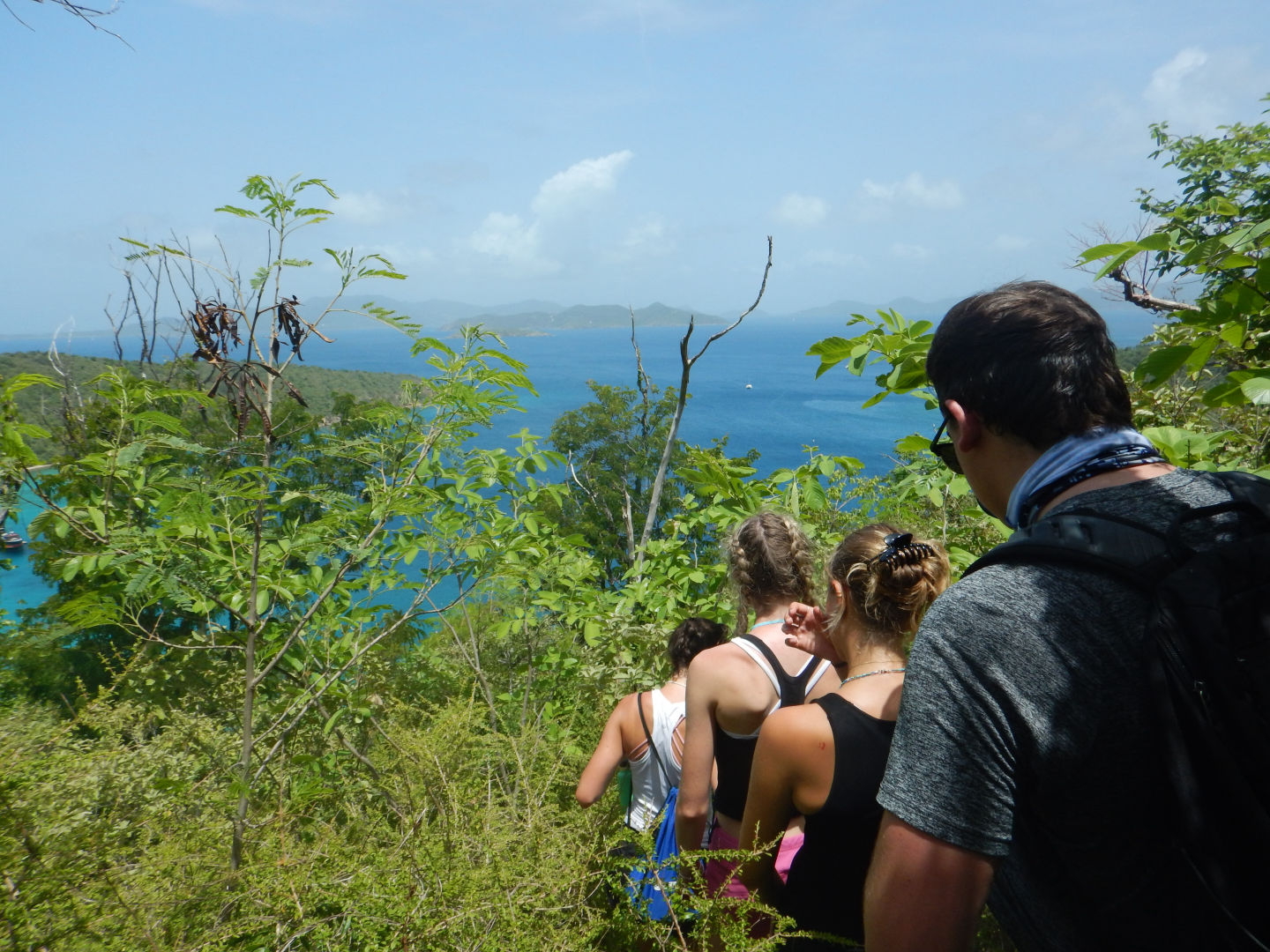 I woke up to the rain, and we had a relaxing morning. Rafa and I hung out on the bow of the boat as the rest of the crew started to wake up. We all gathered for breakfast and had some delicious eggs and cranberry muffins. I had never had cranberry muffins before, but they were pretty awesome. We settled in after breakfast and got ready for a big hike. Everyone got their stuff together and prepared to load the dinghy. We began the hike, and it started out as pretty chill and normal. But then we took a turn and began to climb up rocks, which was at first a little nerve-wracking, but it paid off big time with a beautiful view at the top. Then we sat as we watched the view. We then discussed things that made us happy and words that described us. After discussing our words, we started to head back down. Once at the bottom, we realized that a majority of the crew had taken a wrong turn somewhere. So, we headed back to the boat and waited for them to regain their location and make their way home. Thankfully everyone found their way back. We hoisted the sail and ate sandwiches as we headed to Road Town, Tortola. After docking, we were able to learn about the Islands. It was extremely interesting to learn about the area we are in. Following our chat, we hung out and set sail again to Mountain point. During the sail, we had a sail chat to learn more about our transportation from island to island. While we sailed up, we had an amazing view of the islands that we had previously been looking at from afar, just this morning. When we arrived, we began to learn how to anchor. I am looking forward to doing it again soon. After finally getting the anchor down, we took our first Hibiclens shower. This was an interesting process, but we made it fun with some music. After our showers, we sat down for some pasta with Alfredo and hotdogs. I really enjoyed this meal. Later tonight, we are hanging out and getting ready for whatever tomorrow brings.