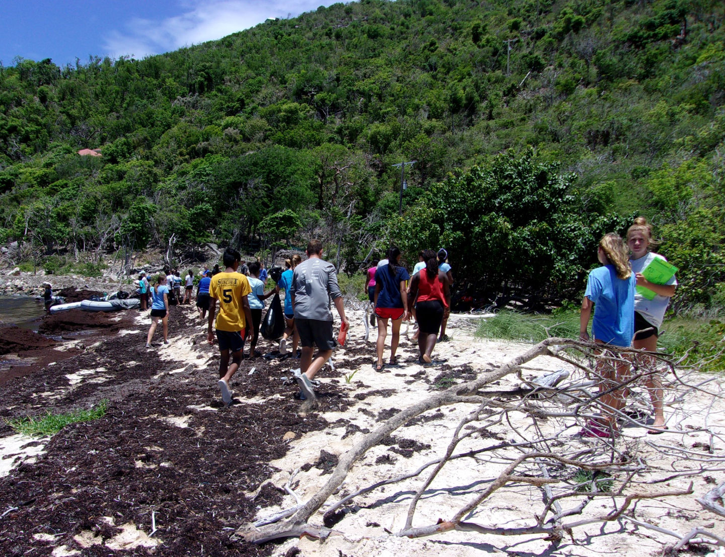 Today we had a “late” morning. We woke up at 8:00 am, and after we ate cereal and oatmeal, we started to sail to Trellis Bay to pick up local kids that were a part of an organization called YEP (Youth Empowerment Project). On the way, Ashley (one of our staff) dropped our deckie bucket in the water. At Trellis Bay, we would be bringing the kids back to our boat to sail to a near beach. At the beach, we picked up every miscellaneous piece of trash we could find to gather data for Ocean Conservancy. We, along with our local buddy, would bring every piece we found to one of the recorders who would tally down every piece of trash in its category. We cleaned up the entire beach and collected over 200 pieces of microplastic, several pieces in other categories and found a lot of bottle caps.