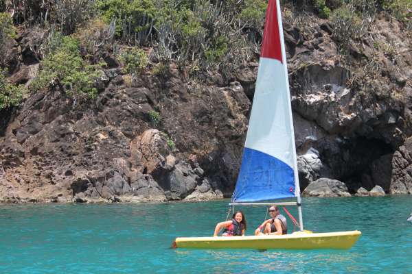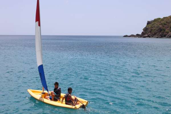 Today was pure relaxation. The beginning of the day started with a 45-minute sleep-in, then we all woke up to the sweet smell of pancakes and maple syrup thanks to Camille. Next, we did a quick motor from Marina Cay over to Muskmelon Bay. Once we arrived, I explained to everyone that we weren’t doing community service or going on a hike but that we were relaxing, swimming, snorkeling, water skiing, and sailing. Everyone was so excited. After a quick cleanup, everyone put their fins and masks on and jumped into the water. Everything was going well until a bit of a jellyfish scare. People rushed out of the water and looked down to see the jellyfish, but they were only a couple inches long and didn’t have a painful sting. Once we realized this, some shipmates went back into the water, while others started making friendship bracelets, and others went sailing in miniature sailboats called Picos. The day was flying by. It was already lunchtime! Mike the director of ActionQuest joined our boat for a meal of nice chicken caesar salad sandwiches. Once lunch was over, some of us gathered into Big Blue; the fastest boat ActionQuest has to offer, to go and check out some rare birds, the Brown-footed booby, a close relative to the Blue-footed booby located in the Galapagos Islands. The others that were not in Big Blue raced Big Blue back to the boat, but they didn’t stand a chance. Big Blue got back to the boat with time to spare. When we were all back, we jumped into the ocean and created our kind of jungle gym with the anchor chain. We all dove into the water and climbed on the chain having a great time, which personally was my favorite part of the day. After this, we cooked chili and rice and then enjoyed a lively Lifeworks Forum where we all shared our ideas about morals and our experiences with them. Today was by far my favorite day.