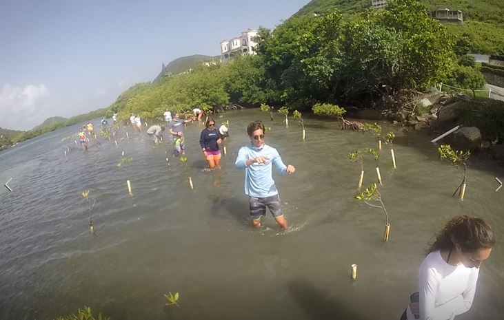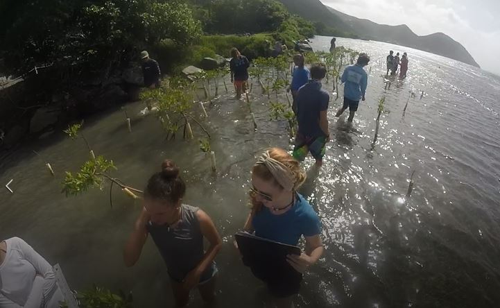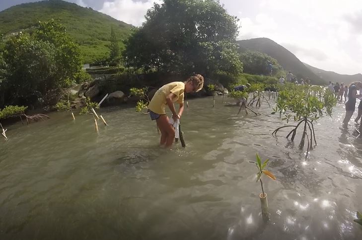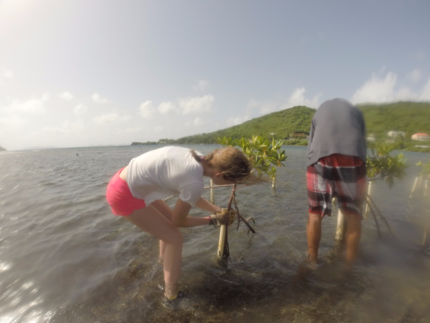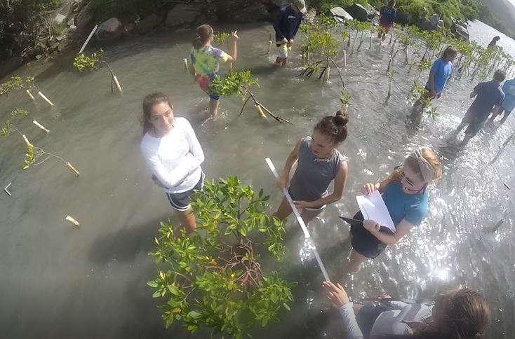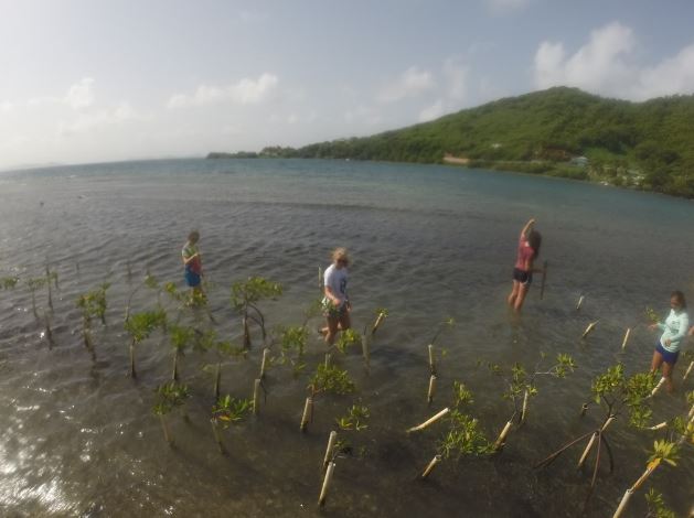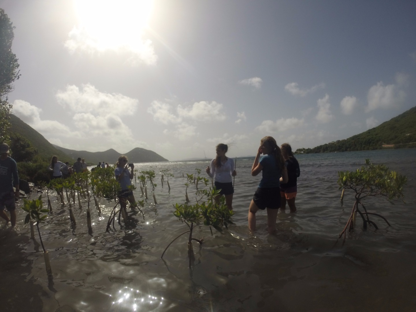 Anna, Maddy and I woke up this morning on the roof of the boat with the wind gently blowing and the sun starting to shine. We immediately set sail to West End of Tortola. After eating breakfast, several of us laid on the trampoline as we bounced in the air and got sprayed by water because of the huge waves. Getting soaked when sailing is always one of my favorite parts of the day. When we arrived at our destination, it was such a weird feeling because this is where we started our trip seventeen days ago and it was just strange being back with our experiences of this journey instead of our exceptions and predictions. All of us then walked over to the Mangroves to help check the growth rates and pick up trash in the area because mangroves are very important to the BVI. Although picking up the trash can be kind of gross, I kind of like it because I feel like I’m helping the environment. We then came back to the boats and headed off to Fat Hogs Bay to help more mangroves. On the sail there we all just napped on the trampoline for about an hour and a half. When we got there, we had lunch, danced a ton, and jumped on the trampoline. The dance parties we have, which are part of our daily routine, is another favorite activity of mine.