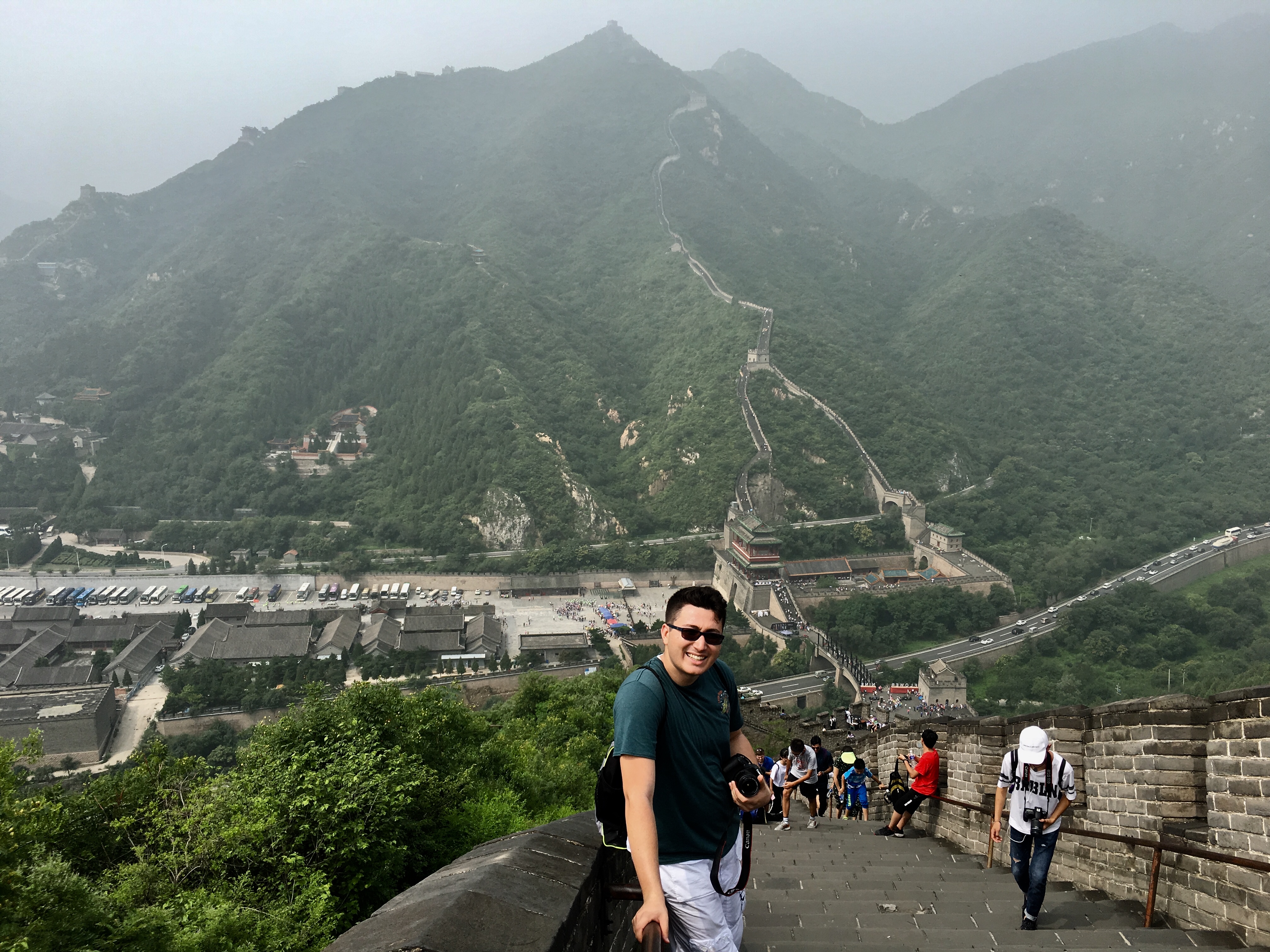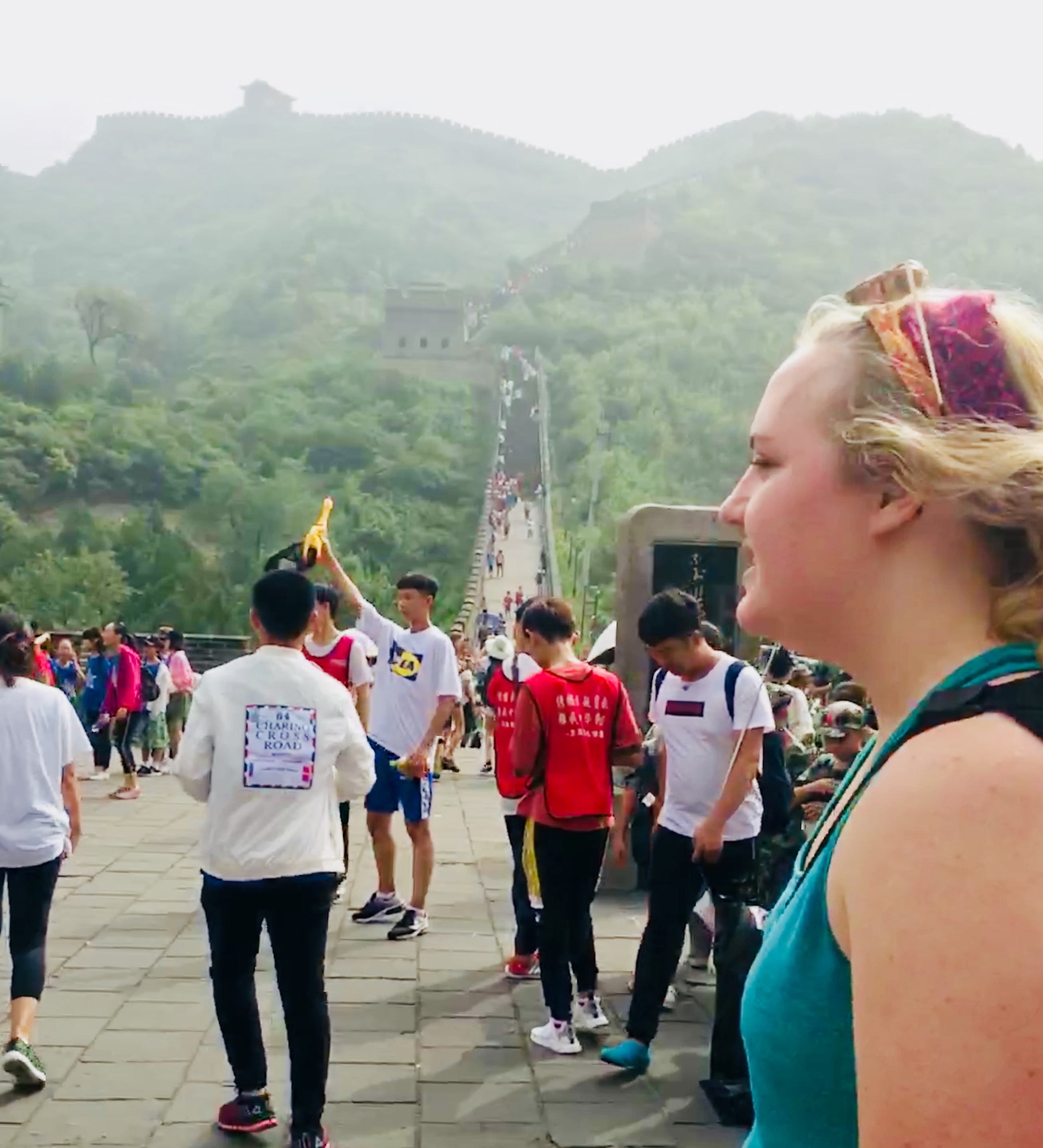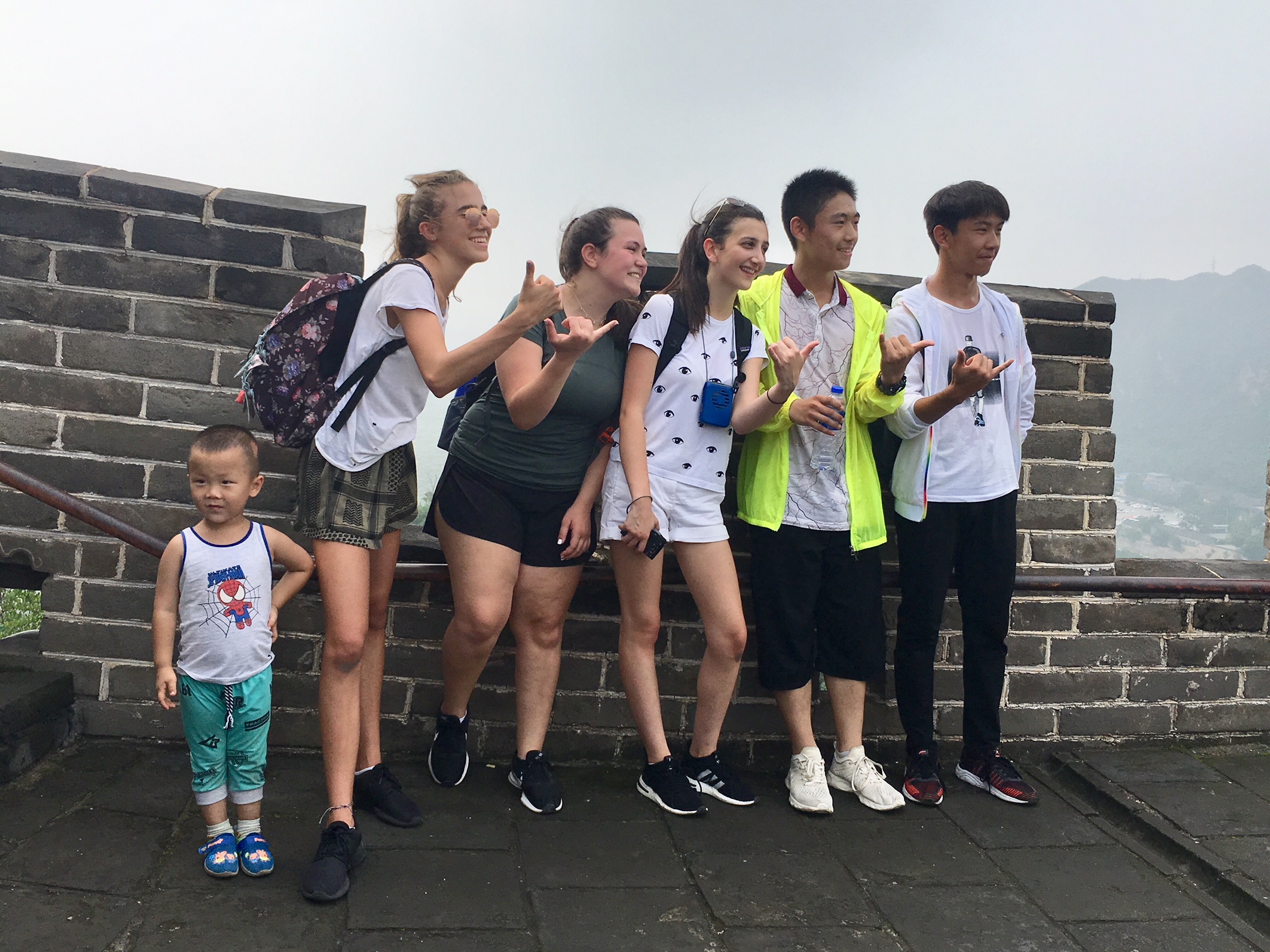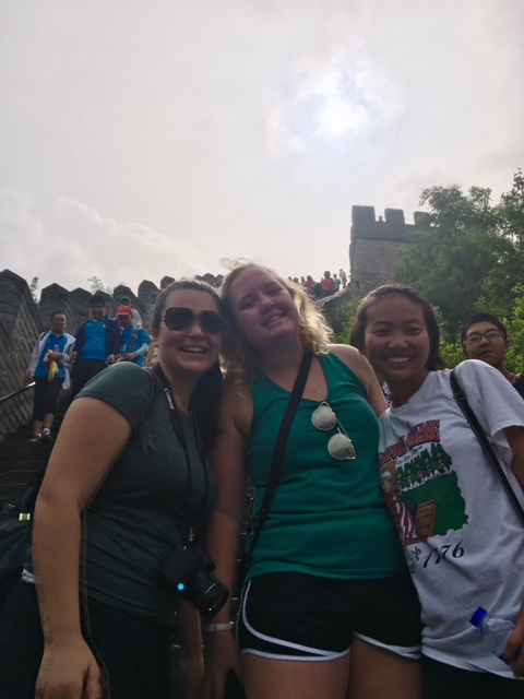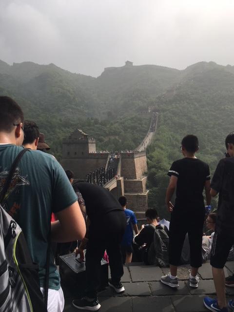 Hello friends and family! Today was our first full day in the fantastic city of Beijing, and it couldn’t have been more fun! Though we’re all still getting over our jet lag and the crazy time difference, it hasn’t stopped us one bit! We started today by climbing the Great Wall, and I think we all agree when I say it was the coolest thing we’ve done in our entire lives. The hike was no small feat between the thick air and heat, but we carried on none the less, and the views made it worth it. Throughout our hike, we kept getting stopped by Chinese locals to take pictures. That happens to foreigners a lot here. We took it in stride and laughed and posed for every photo, enjoying our fifteen minutes of fame. Looking out over the wall was incredible. It was so amazing to know you are standing on years and years of history.