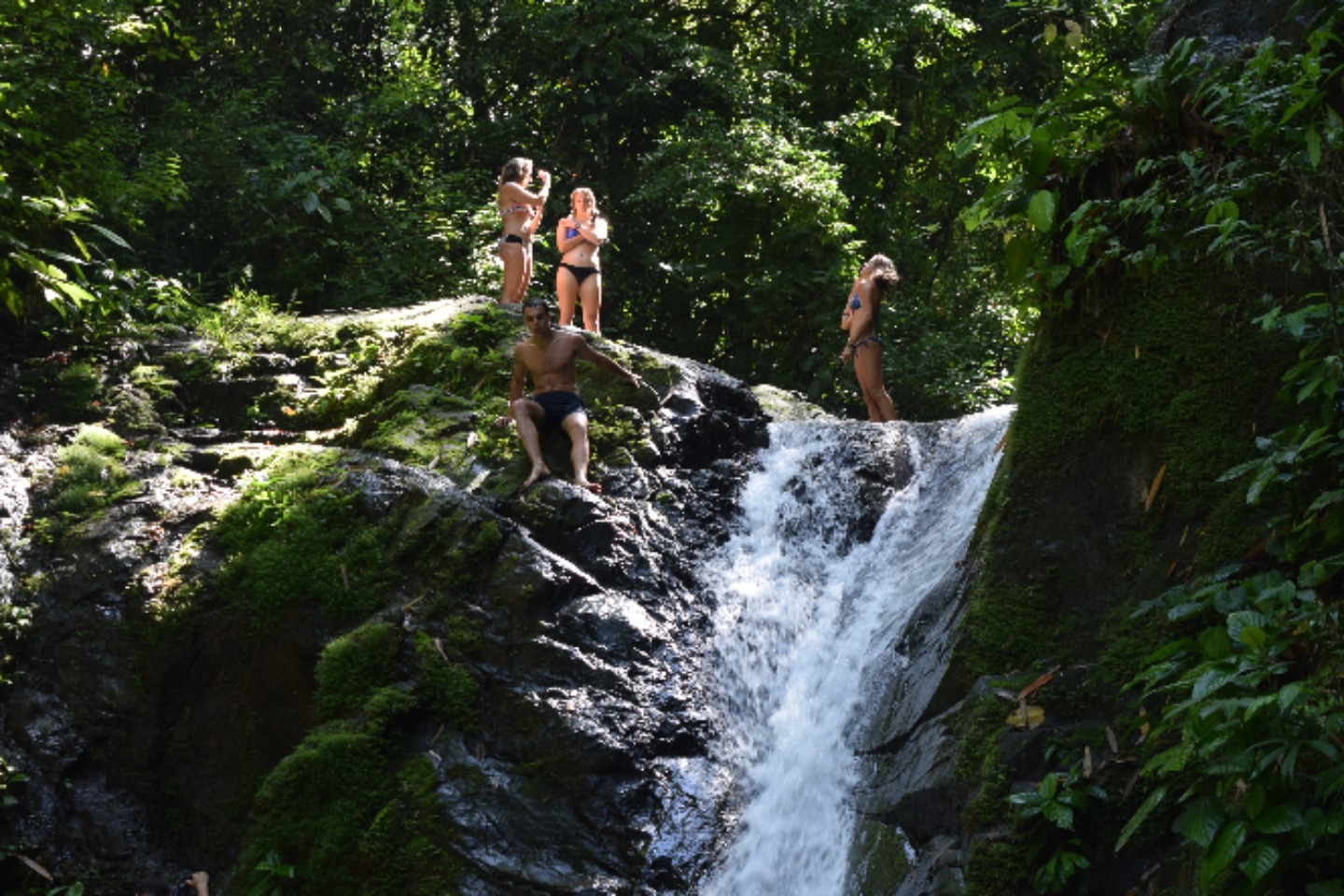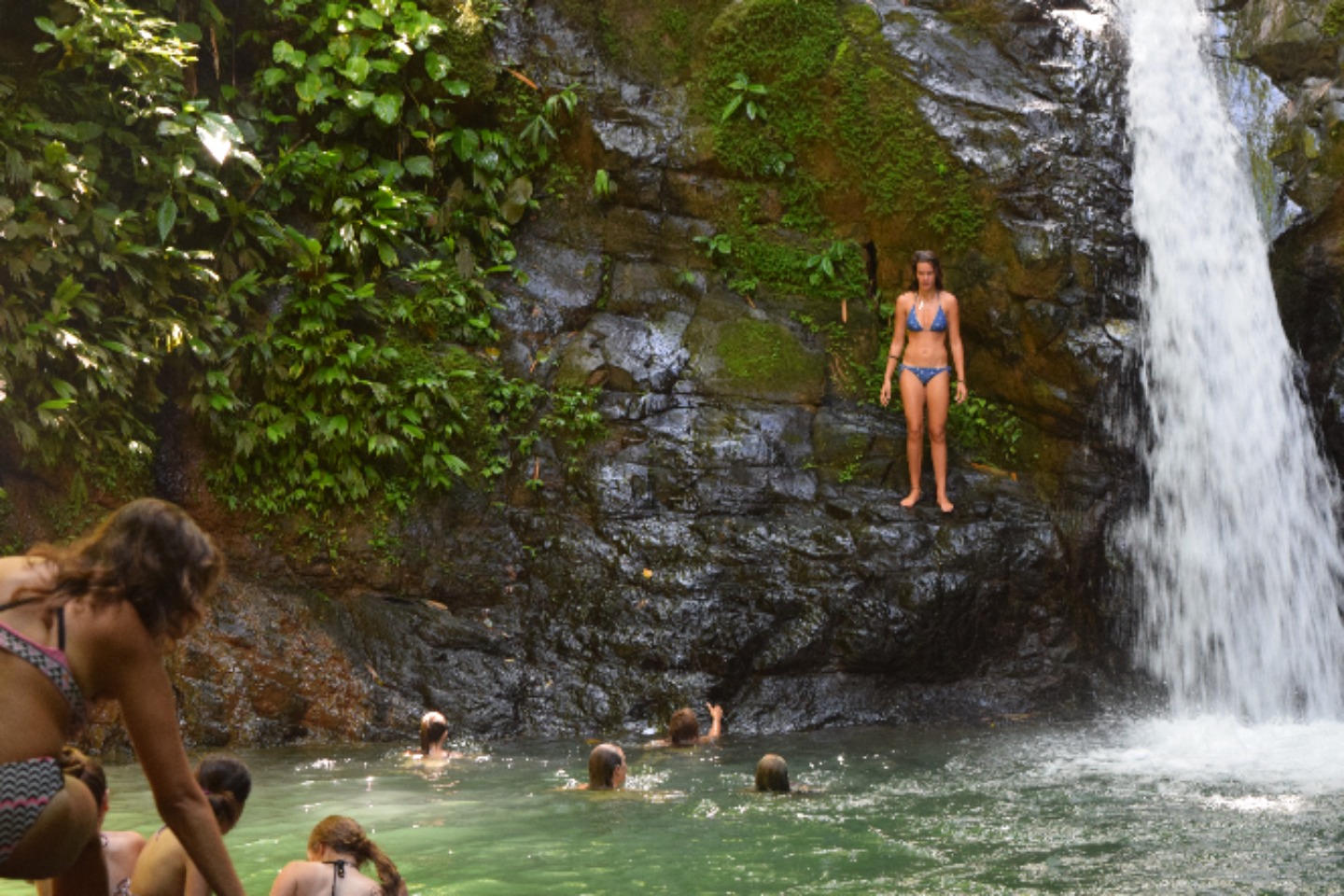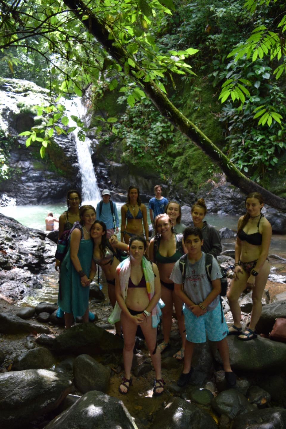 We woke up at a normal time (7:15), and had a delicious breakfast at Hotel “Suenos Tranquilos.” The normal – eggs, toast, rice, and beans – was our entree per usual. We were excited to start our hike to the waterfall. Little did we know we would be hiking on a sweltering, hot road. We were hiking for about forty minutes before we came to a stop at the entrance place for the waterfall. After 5 minutes of waiting, we finally got into the jungle. Our hopes and dreams were crushed when we figured out there was another hike to the actual waterfall. Fortunately, the walk was short and beautiful. After slipping and falling on the slippery rocks on our way, we finally made it to the waterfall. Although the water was cold, the water was hard not to get into. We were accompanied by daredevils that seemed to be from Costa Rica. They climbed the waterfall from the rocks. It was scary to watch because if they fell back onto their head, they could have been seriously injured or even killed. As they made their way higher and higher, everybody’s mouth dropped lower and lower. Finally, they made it to the top. After staring down below their feet for a minute, they jumped… Our jaws dropped. The sound of their body hitting the water was terrifying, but they were fully safe each time. After ten minutes of them repeatedly going up and down the waterfall, Mara and Kayla wanted to do the same thing that they were doing. The counselors were hesitant at first but then gave in. Anna, the instructor, took them up the long way, not the waterfall way, for safety purposes. After five minutes of not seeing them, they appeared out of the jungle. Their faces filled with excitement; they were ready to go down the waterfall. Mara was up first. She had a perfect slide down and went smoothly down into the water. Kayla, on the other hand, rotated a little bit backward and landed a back flop. The noise was terrible. Luckily, she came out of the water with a smile on her face.