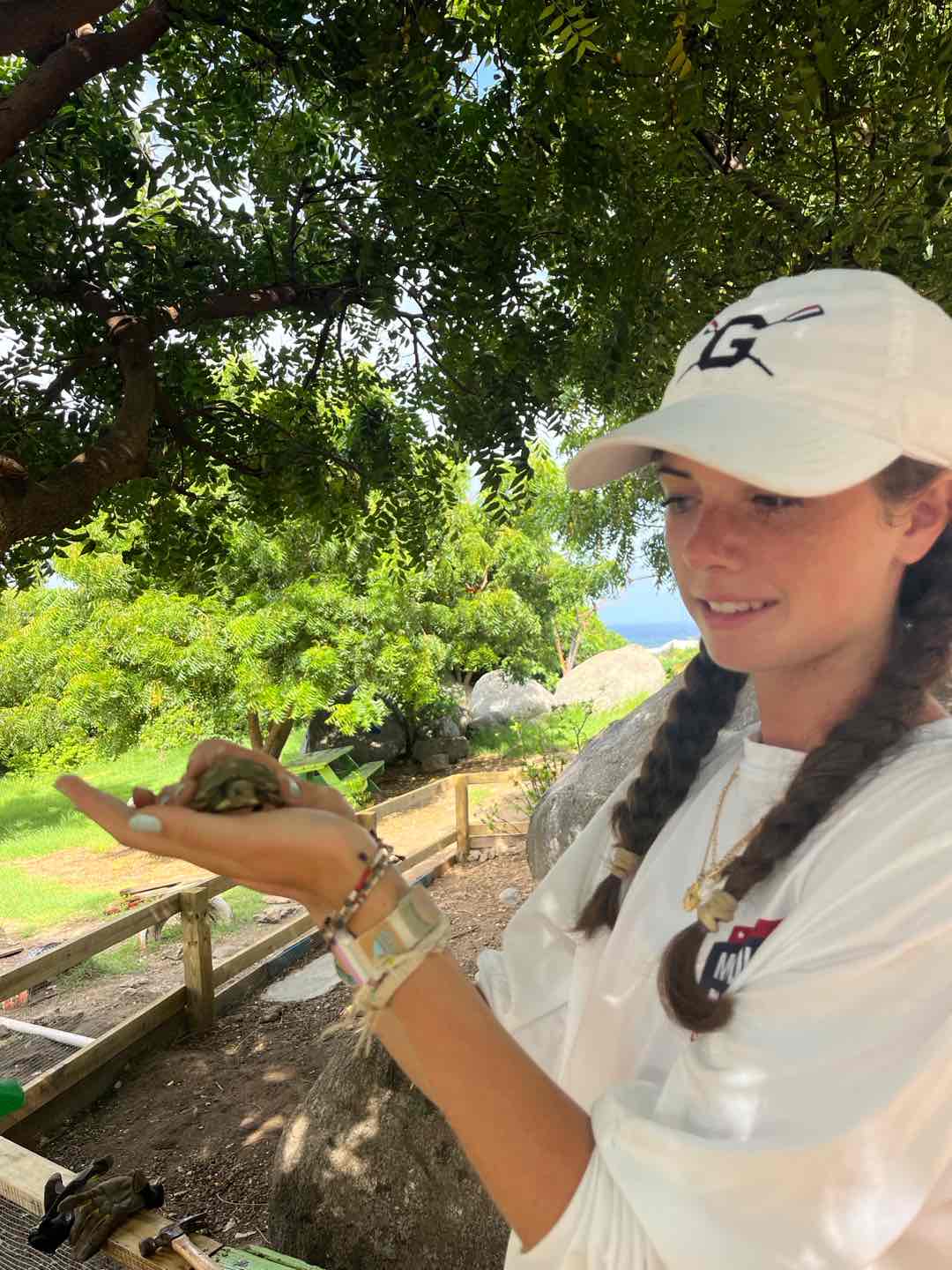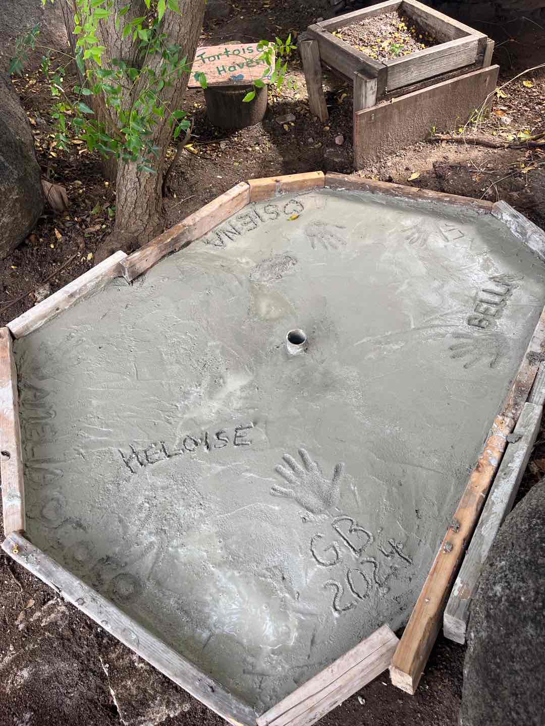 Soon after, we split into two groups. Riley, Annabelle, Maya, and Ella went to work on building a big toy sailboat for these kids to play on on the playground. This group made a lot of progress today and will definitely be able to finish it within the next couple of days we are working with this school. The rest of us (Lia, Amelia, Coco, Siena, Heloise, and I) went with Julie to the tortoise enclosures. In these enclosures lived four red-footed tortoises (Red, Mango, and two with no name). They were adorbs. We started by redoing the fence that surrounded their living space. Lia handled the drill, I removed staples, and Amelia and Coco worked to line up the new chicken wire. After our lunch break of PB and Js, we headed over to the friendly construction workers to ask them to add sand and mix our concrete. We used the first batch of concrete to start the new pond for the turtles to soak in. It took a total of three batches of concrete to complete the pond (we enjoyed Amelia and Siena’s ASMR with the concrete). Julie even let us sign our names in the pond to leave our mark!