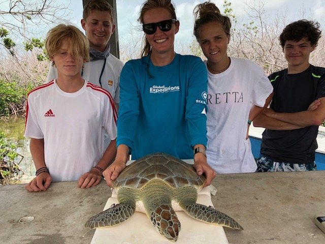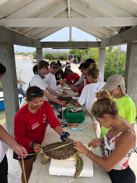 We started our day bright and bushy eyed at 630 AM; everyone was a little slumped at breakfast, however, the students of preserving paradise and rebuilding island life had an exciting day ahead of them. Today we put our turtle catching skills to the test by using a strategy called ‘rodeo.’ Thanks to the help of each crew we caught a total of six green turtles, quite honestly, catching is much easier said than done. After the students brought them ashore, we took turns taking measurements, documenting data, and providing the resting turtles with light saltwater washes. We were at the docks for quite some time, so it was good to catch up on some reading. Also, goldfish and raisins got us through our exhausting afternoon. The best part was releasing the turtles back to their warm, aqua blue home knowing we were contributing to something great.