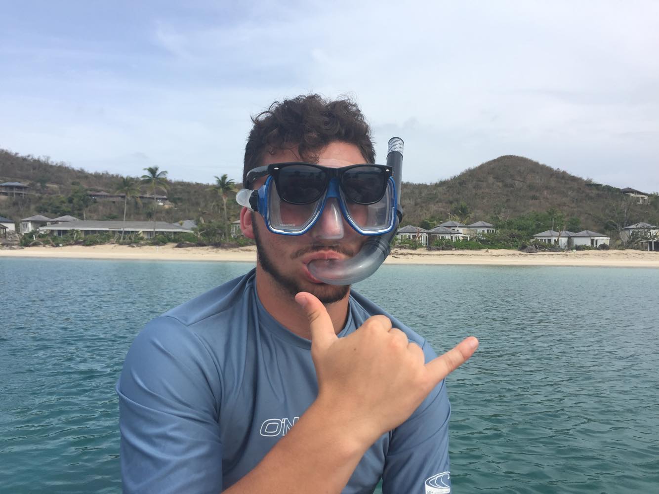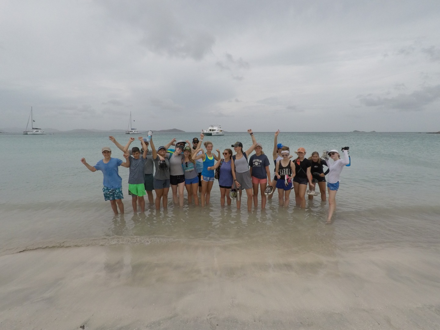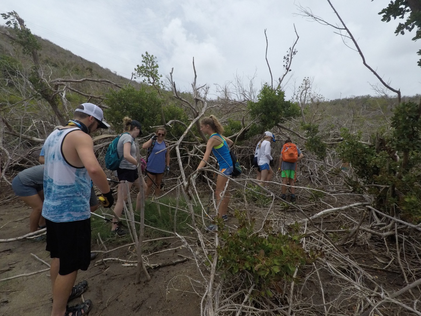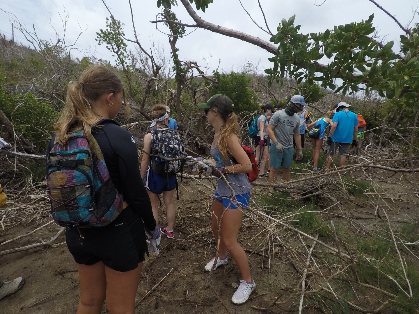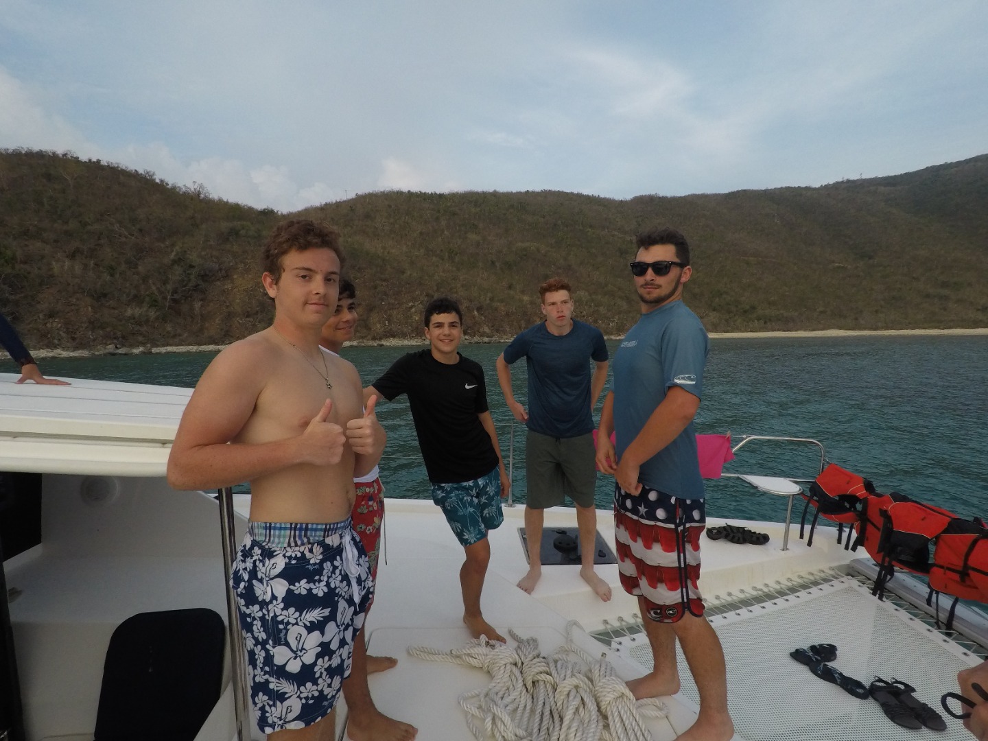 Today was the first day we were able to sleep in, but everybody woke up due to the smell of pancakes being made. We all ate the pancakes and cleaned the entire ship to pristine shape. The other GoBeyond ship came over, and we watched videos about water pollution and how plastic affects the world. We watched a couple of videos of Boyan Slat and how he was 17 and started doing Ted Talks. Now he is in his early twenty’s raising nearly 40 million dollars to his company to help end water pollution dealing with plastic. We then left and went to an old hiking spot that Action Quest and GoBeyond usually go to every year, but the hurricane destroyed almost all of it so instead of doing the hike we set out to remake the trail and clean it as well as possible. After that, we went back to the boat and ate some Kraft mac n cheese. Then we moved our boat to a private resort called Rosewood, and the bay was called Little Dix. At the bay, we started the process of turtle tagging. After about an hour and a half one person finally caught the first turtle. It was huge and was at least 80 pounds. After we caught it, we measured it and did all the statistics of it and released it back in the bay. We started going to a new place called Mountain Point where we brought both GoBeyond boats together, and we had a huge dinner with both boats to end the day.