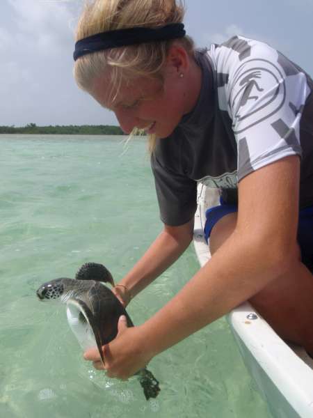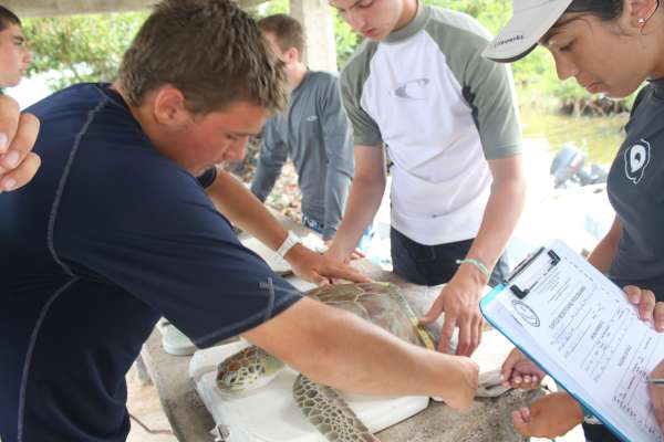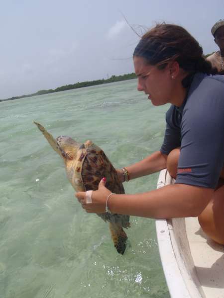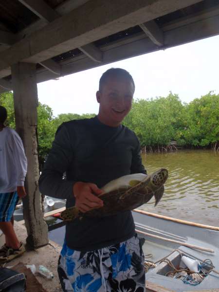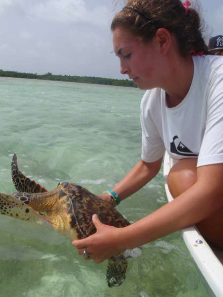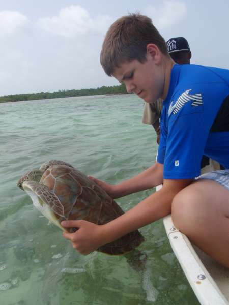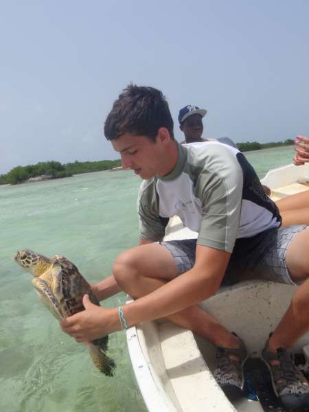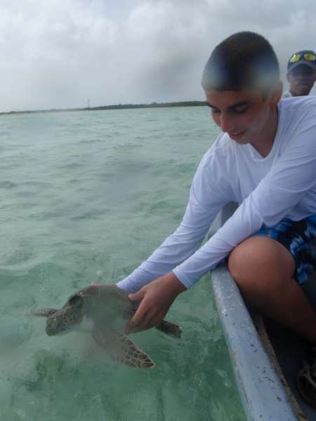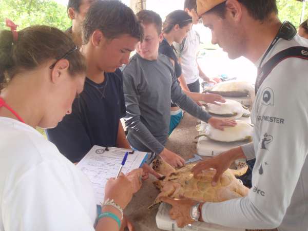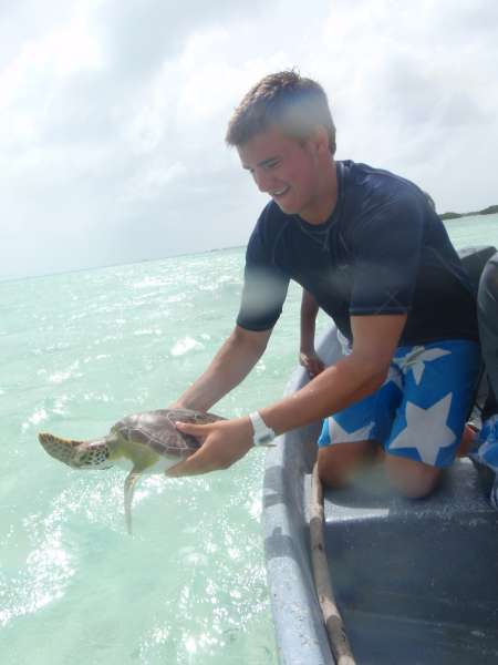 While most Lifeworks mornings are spent prying fellow shipmates out of their bunks, us Lifeworkers were quick to assume this morning’s tasks as we finally approached one of the most anticipated jobs of the voyage, Turtle Tagging. After a delicious breakfast of pancakes assembled by chefs Joe and Ross, the crew began hauling the numerous pieces of equipment and supplies we would need to carry out our amphibious task. Finally, we arrived at Fisherman’s Wharf, the location we would use to base our Turtle Tagging operation. The slightly overcast and windy Anegada weather was comfortable, but it also made setting up the tent and supplies a challenging task. We didn’t need much instruction, as we were all pretty well schooled in the methods of Turtle tagging from last night’s lesson. The method we used is called ‘Rodeo’, and is performed by taking a nimble motor powered skiff, and chasing the Sea Turtle until it is exhausted enough to snatch. We were all anxious to begin our rodeo, and the first two groups to go out were Shippy, Danielle, and Shannon in one boat, and Ross, Joe, and Sarah in the other. The rest of us patiently awaited the return of our shipmates, and were thrilled when we saw the first skiff return with four Hawksbill Sea Turtles! It wasn’t long before the next group arrived with another two Turtles. Over the next several hours, we managed to capture ten Sea Turtles. As the turtles arrived, land-based Lifeworkers, led by Torin, measured and tagged them. This process can best be described as exhilarating, even on the dock. After hours of hard work, we had finally returned all of the turtles to their habitat and were headed back to the dock. Next, we received an hour of shore time, in which us shipmates enjoyed some local Conch and explored the local shops. Finally, we were treated to a Thanksgiving-themed feast with stuffing, mashed potatoes, and canned chicken. I think I can speak for the whole boat in saying that we are all very thankful for such a memorable experience in a beautiful place with amazing new friends.